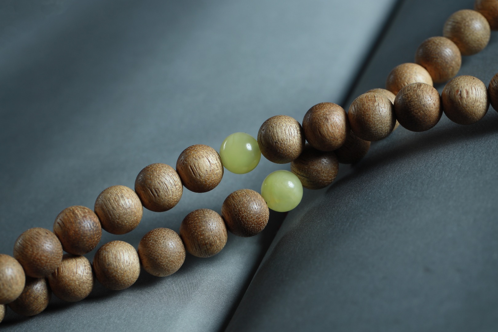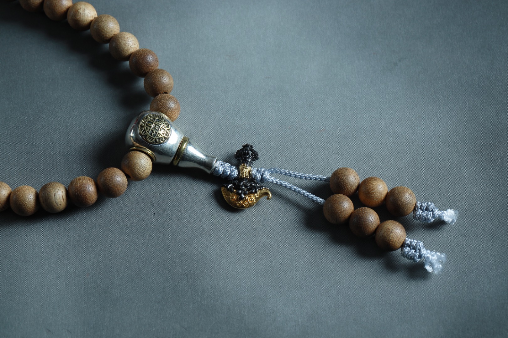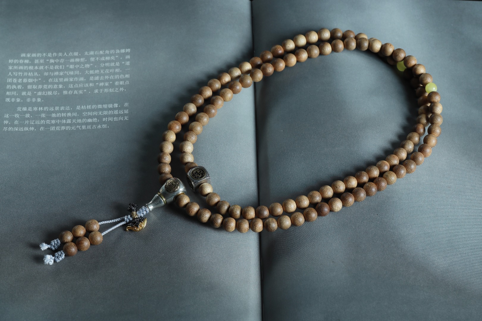 沉香圆珠多圈手串,香味倾泻,悠如云行,925银四象隔珠的搭配!展现着东方文化的独特魅力。925银九宫八卦三通,更加彰显尊贵,925银的光泽和古朴的造型,给整体增添一抹奢华和自信,银镀金刚铲刀是点睛之笔,展现独特经典大气。整体精致华丽和古朴雅致的气质,显示了对美的追求,也彰显对传统的热爱