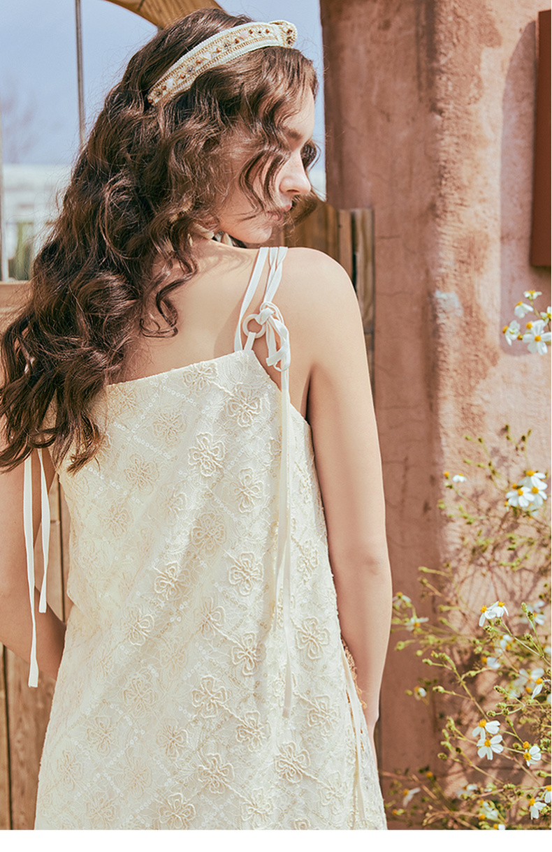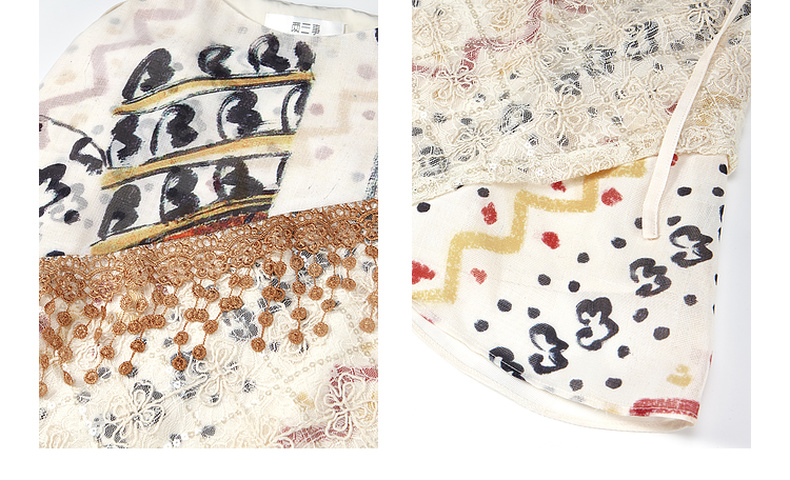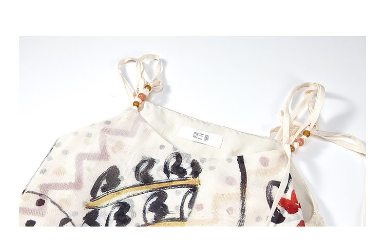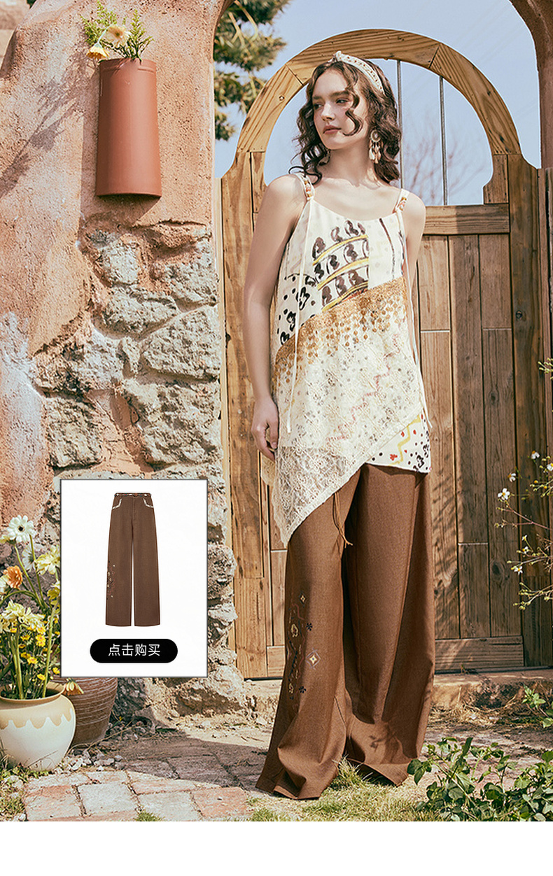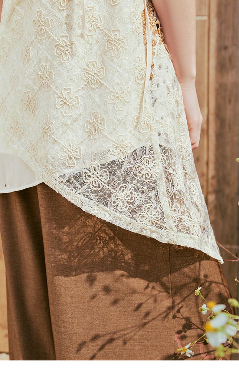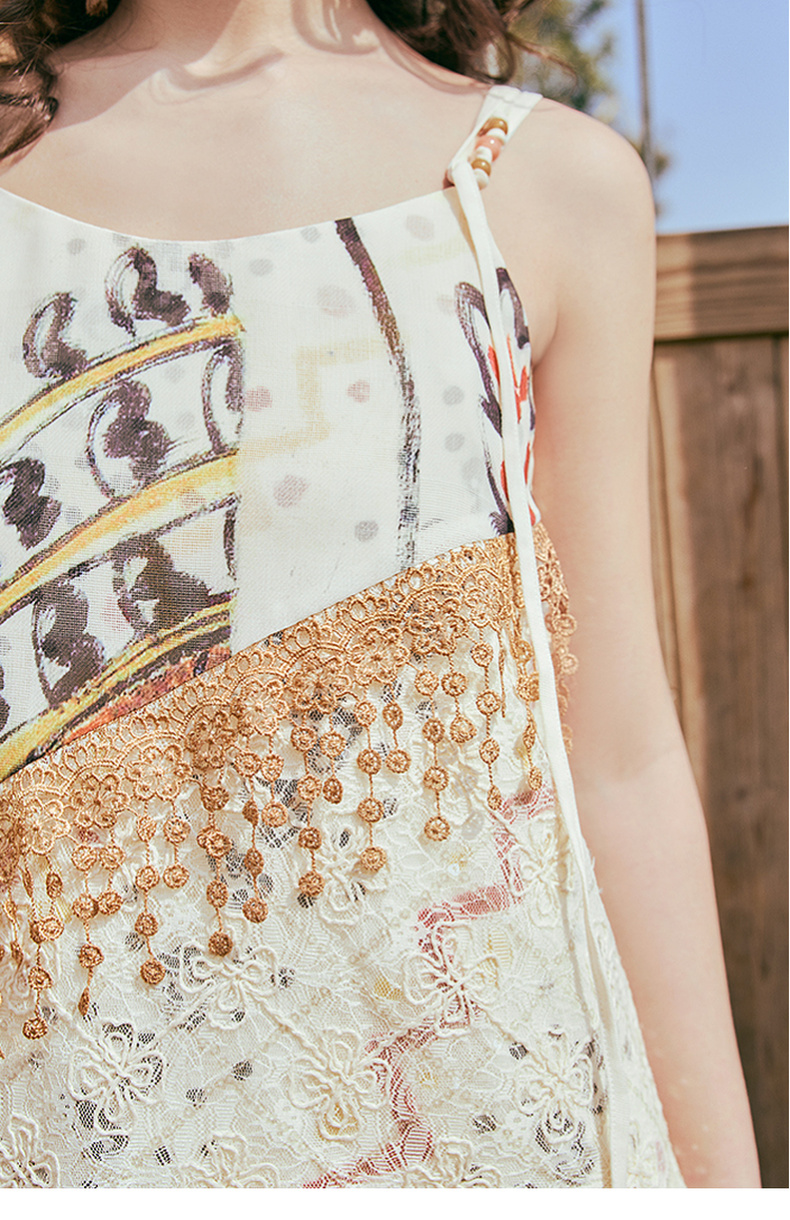 两三事 风吟幔影 2025夏季新款波西米亚风蕾丝拼接印花吊带衫女