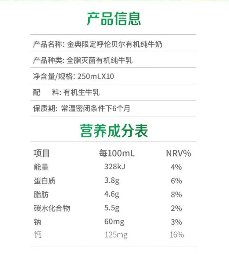 伊利呼伦贝尔有机纯牛奶250*10ml