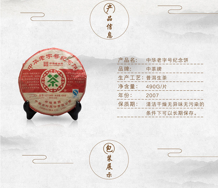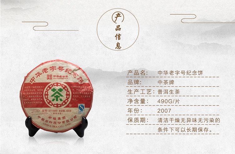 中粮-中茶2007年中茶老字号纪念饼CT1949普洱生茶490g/饼 /云南干仓直发