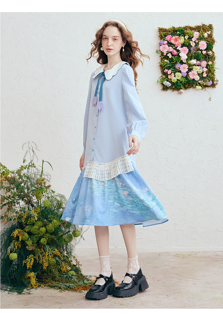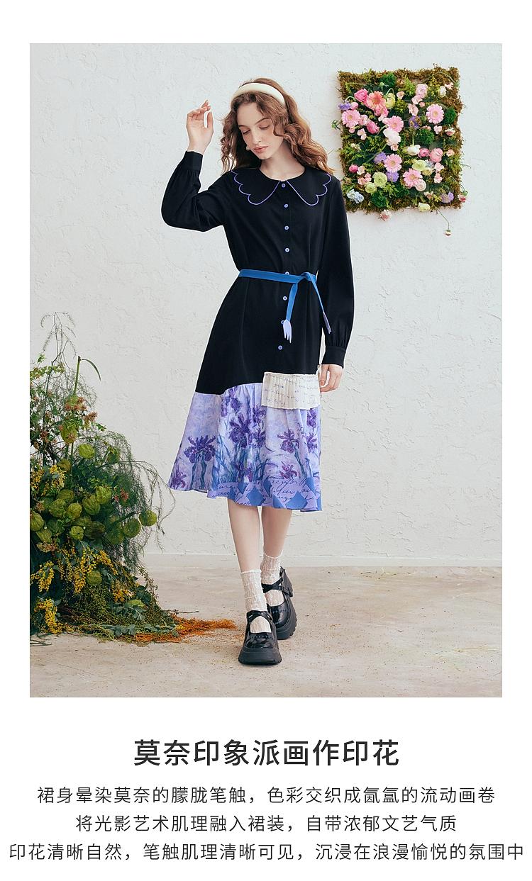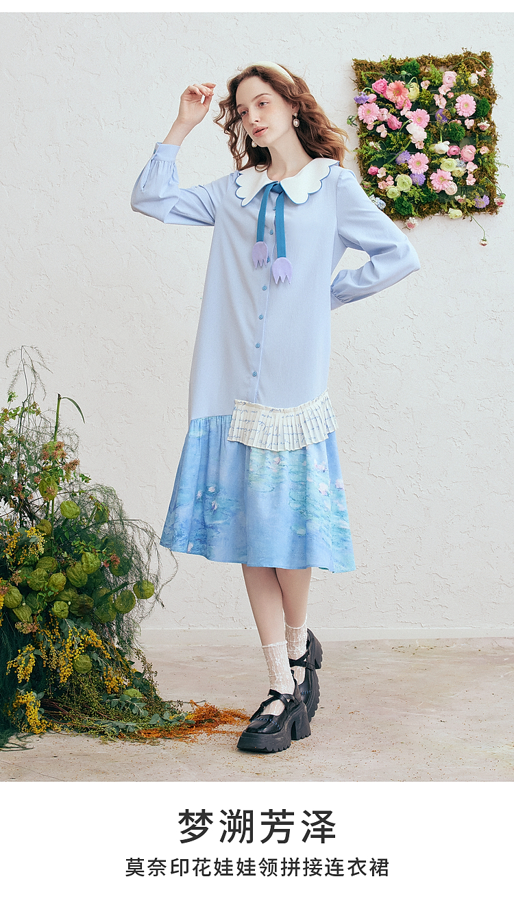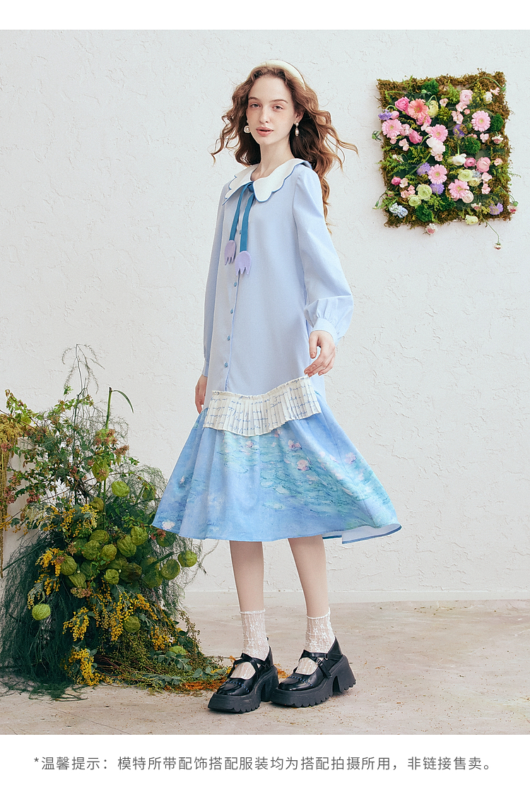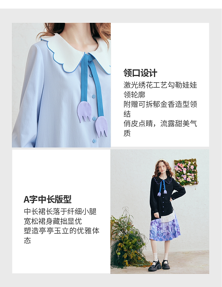 两三事梦溯芳泽2026春季新款印花裙摆可拆郁金香领带娃娃领连衣裙