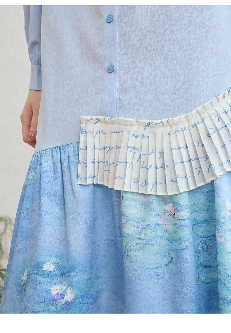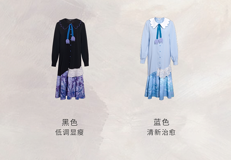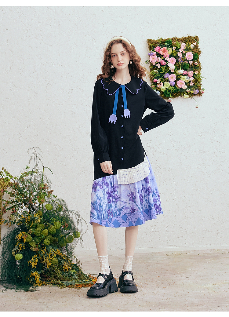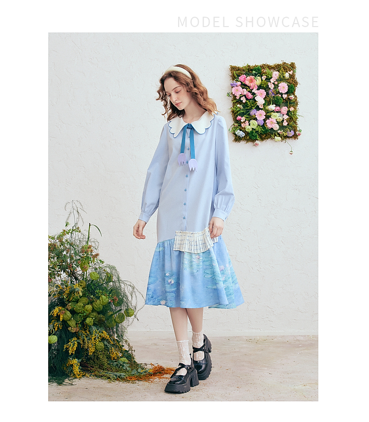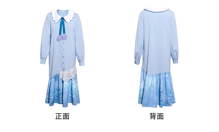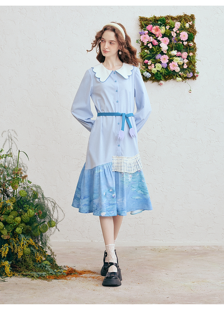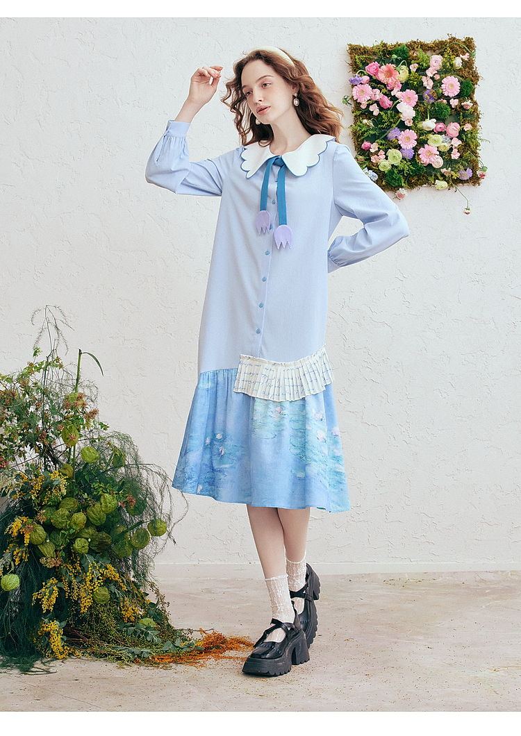 两三事梦溯芳泽2026春季新款印花裙摆可拆郁金香领带娃娃领连衣裙