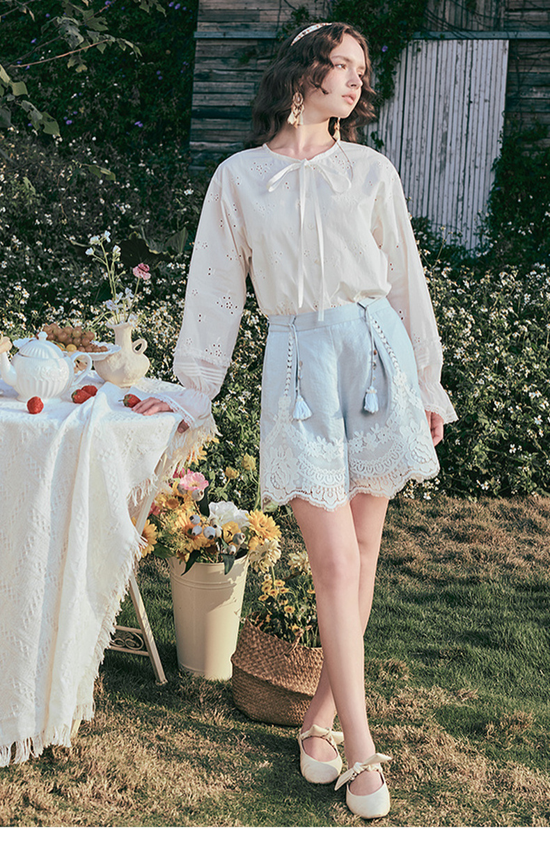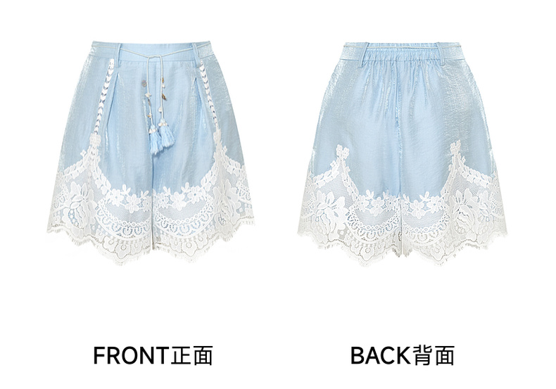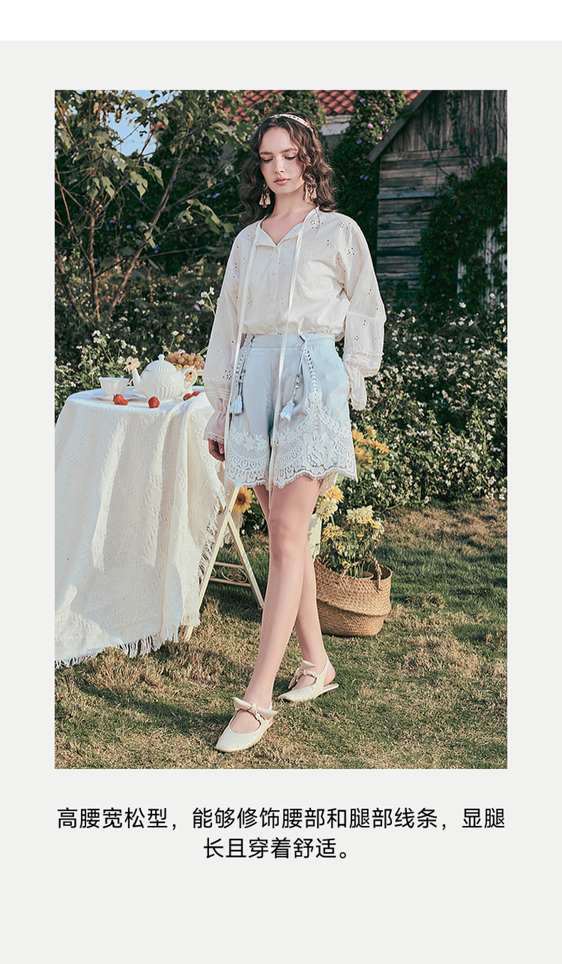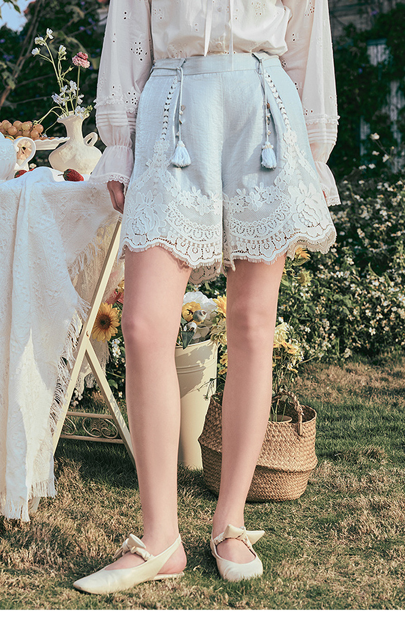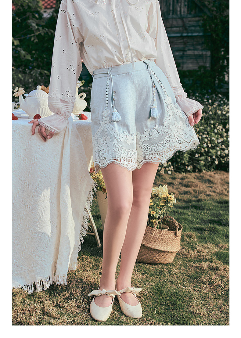 两三事 沫屿星纱 2025夏季新款小清新蕾丝拼接流苏贝壳腰带短裤女