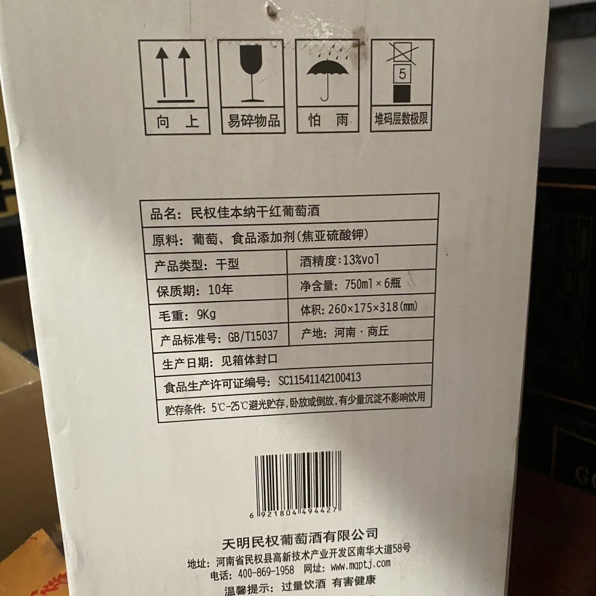 民权佳本纳干红葡萄酒 酒精度13度 整箱750ml*6瓶包邮