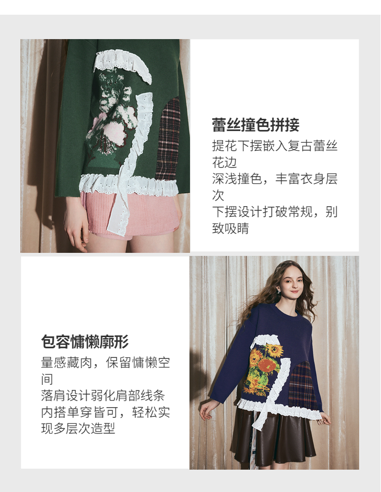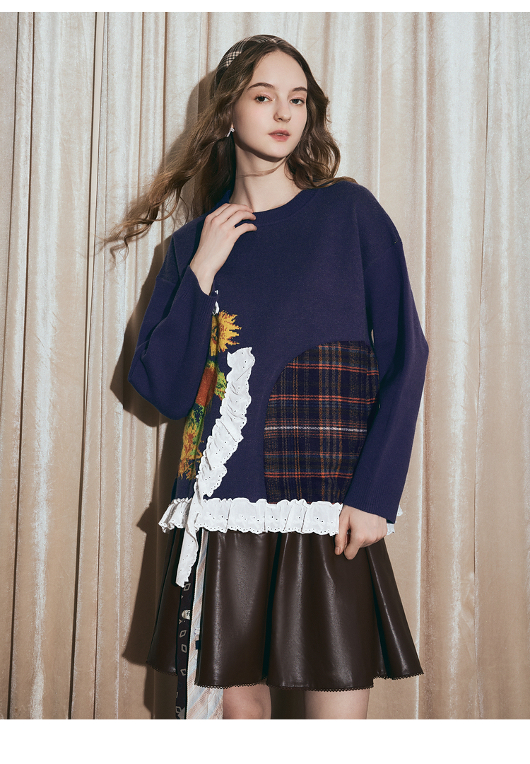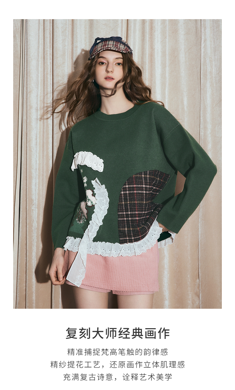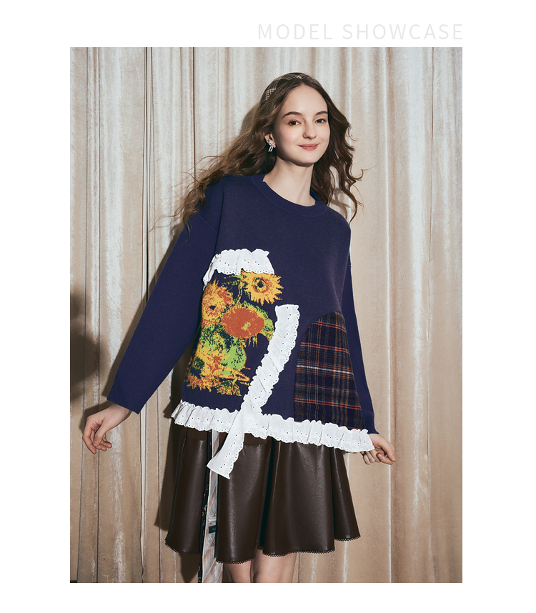 两三事梵高文艺罗马画报2025秋冬新款花边拼布花朵图案套头毛衣女
