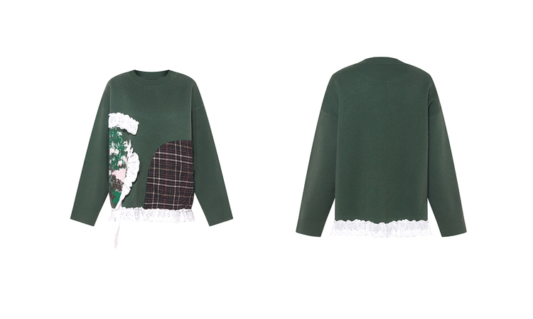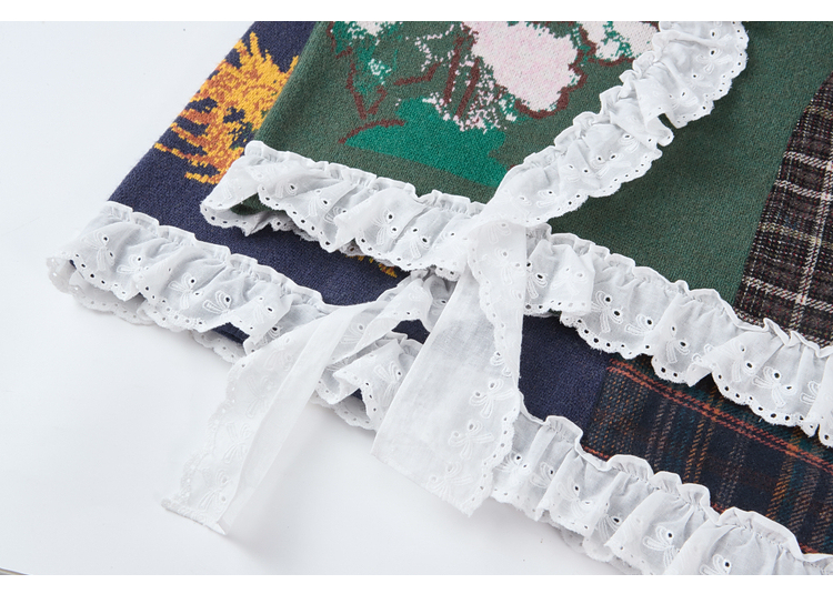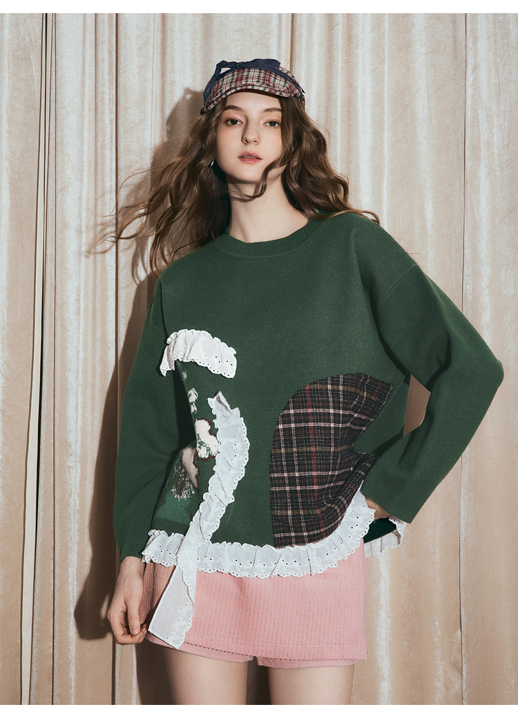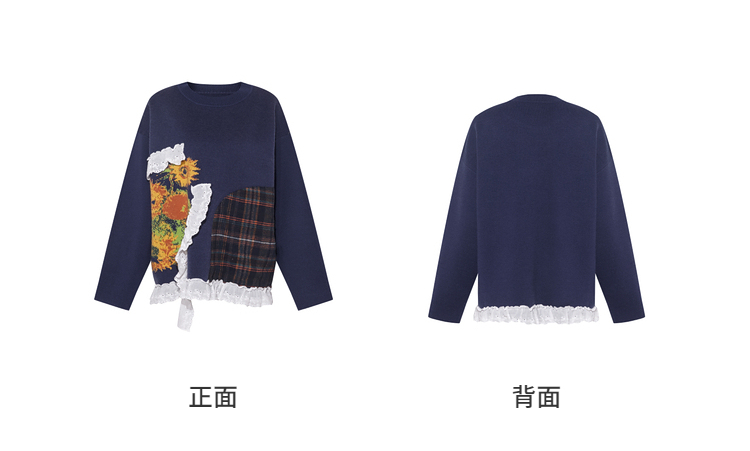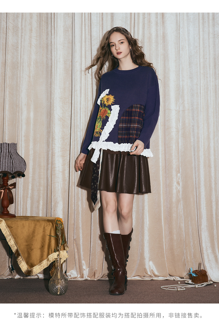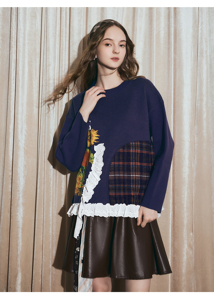两三事梵高文艺罗马画报2025秋冬新款花边拼布花朵图案套头毛衣女