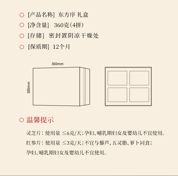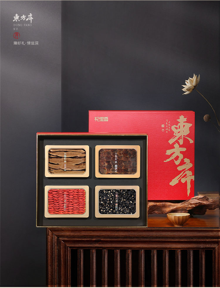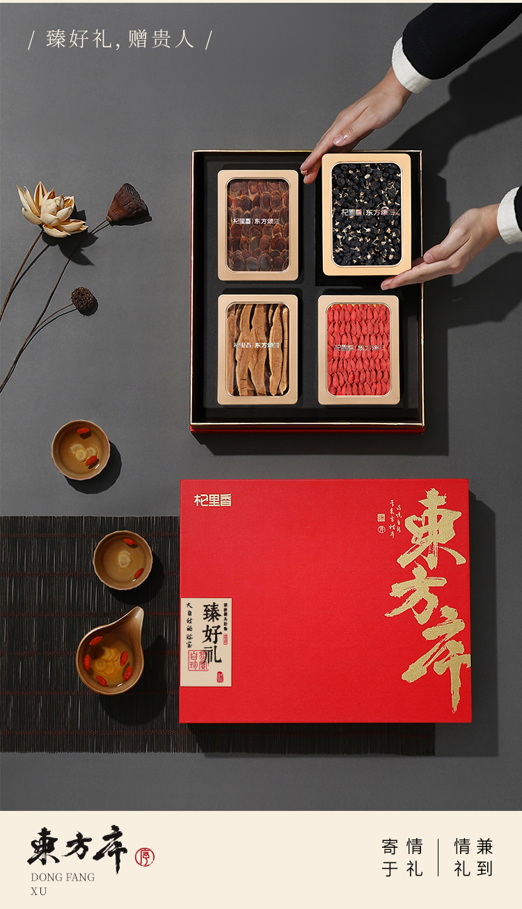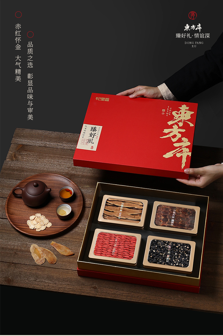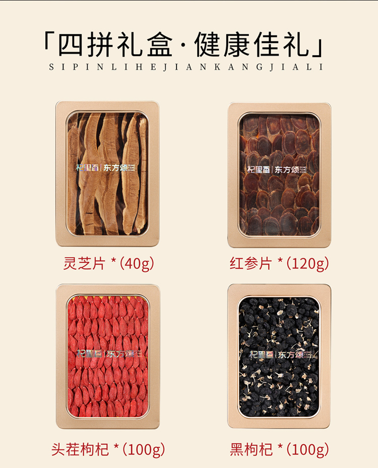 杞里香360g东方序四拼礼盒,内含灵芝片(40g)、宁A180-220枸杞(100g)、红参片(120g)、牛头果黑枸杞(100g)送礼礼盒年货中秋