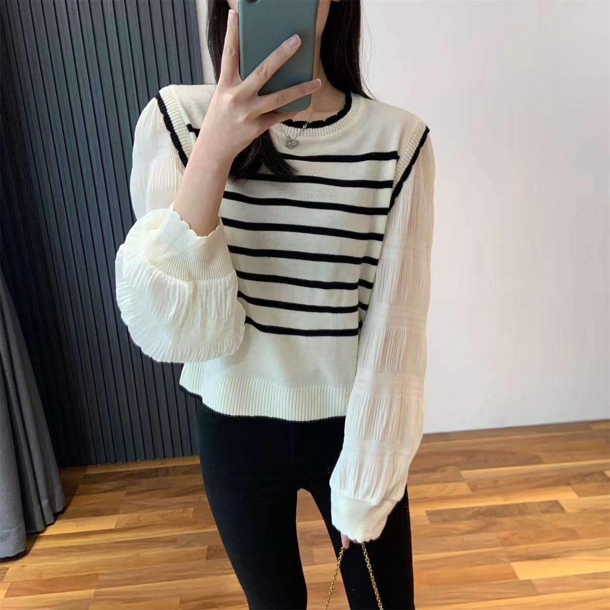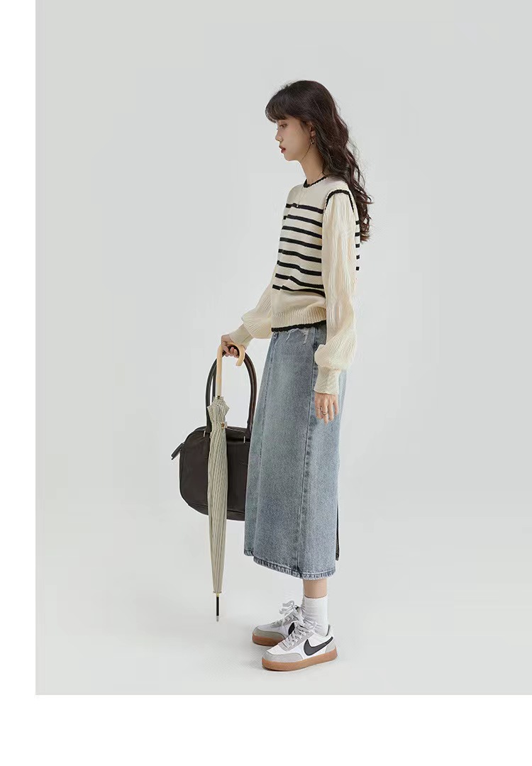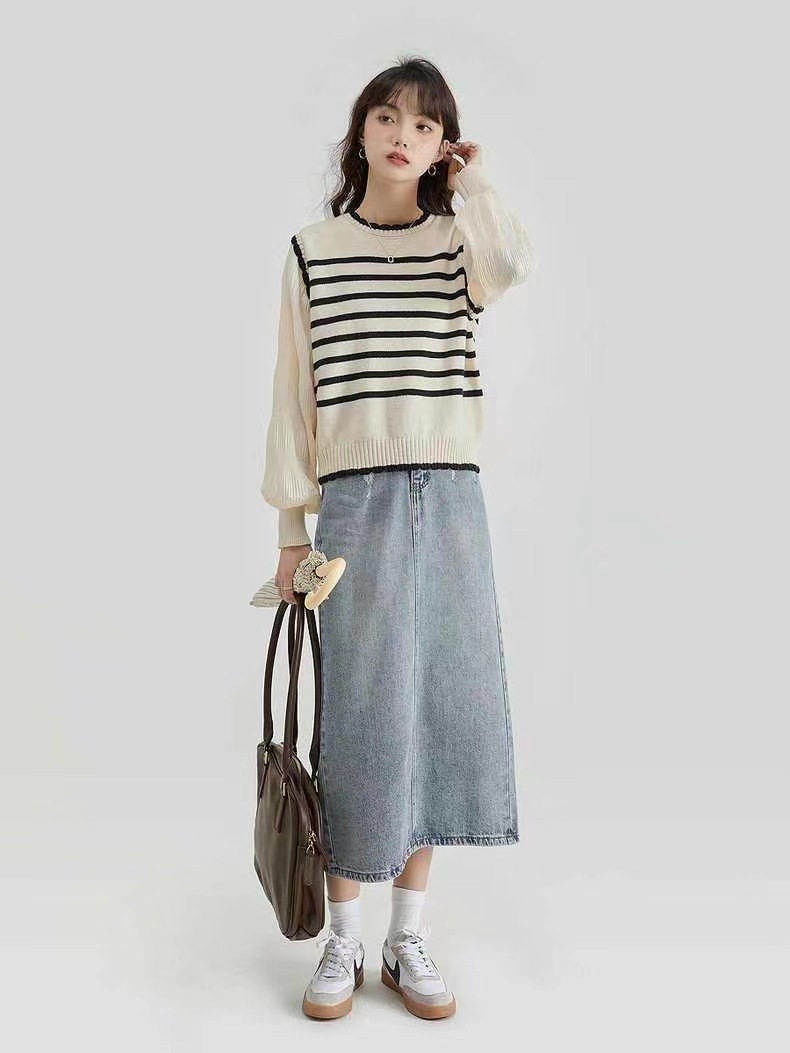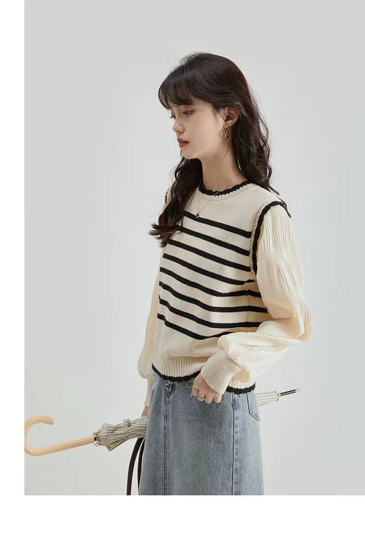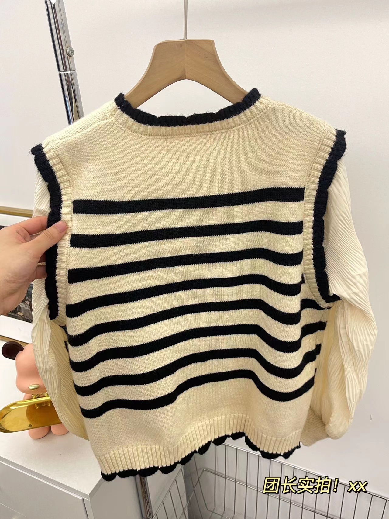 这是一款条纹背心拼接衬衫袖的小衫上身有种轻复古的感觉,就是说一整个爱住了!