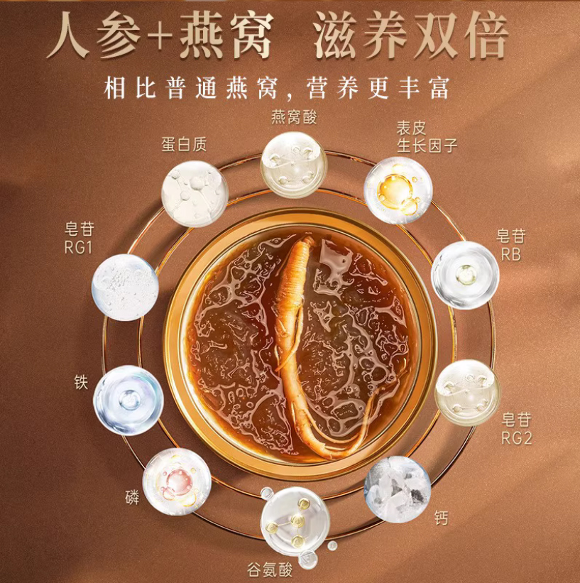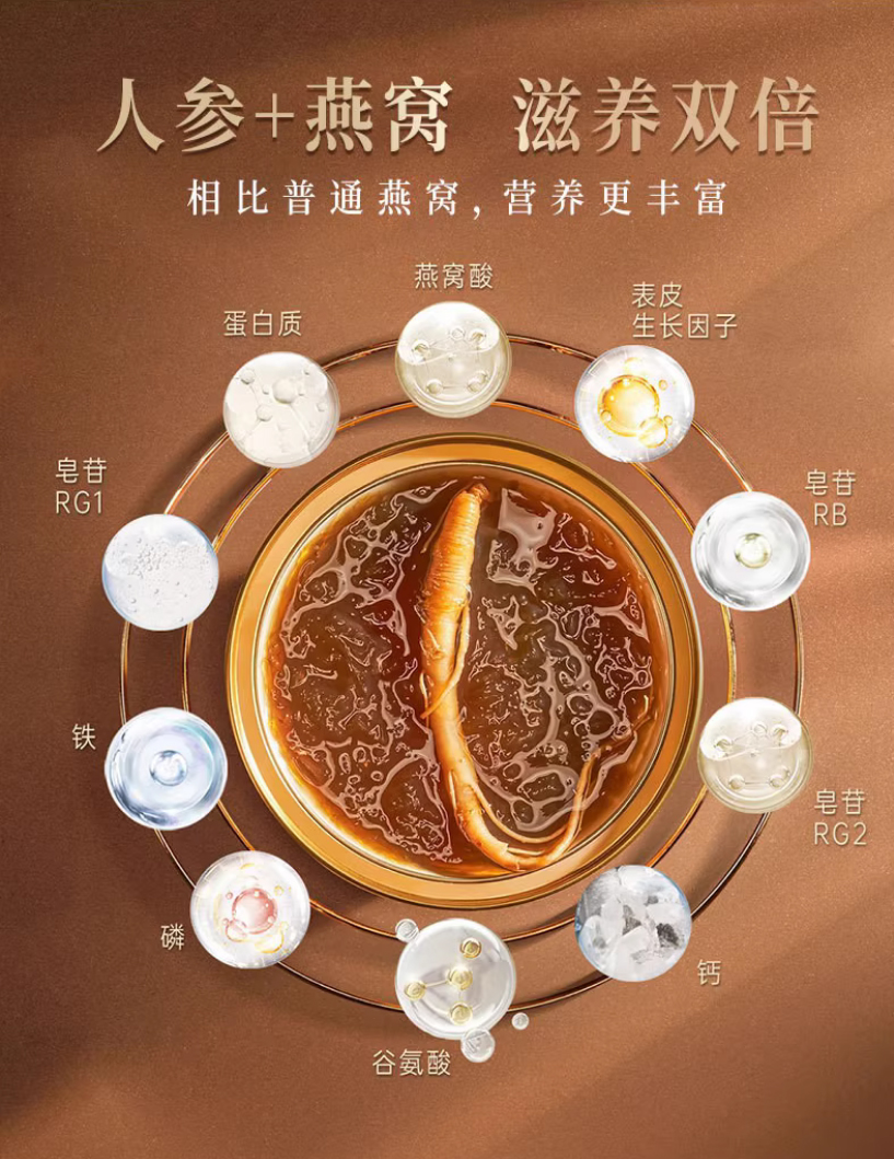 配方主要为:水、冰糖、燕窝、人参(黄