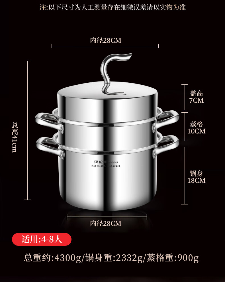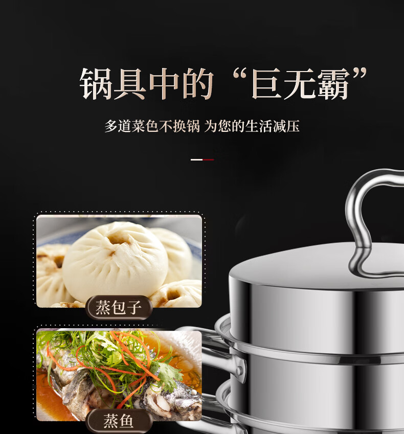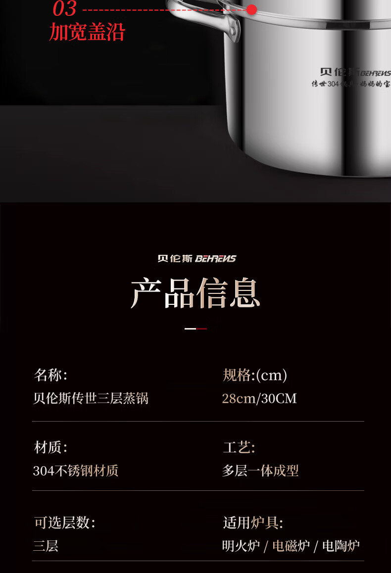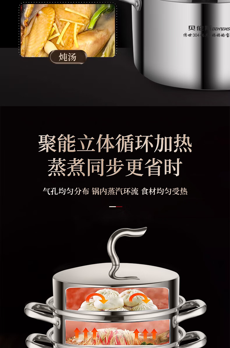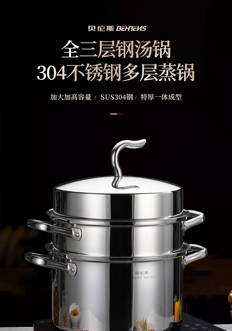 贝伦斯304不锈钢蒸锅燃气灶电磁炉馍馒头包子蒸锅家用蒸煮两用加厚三层