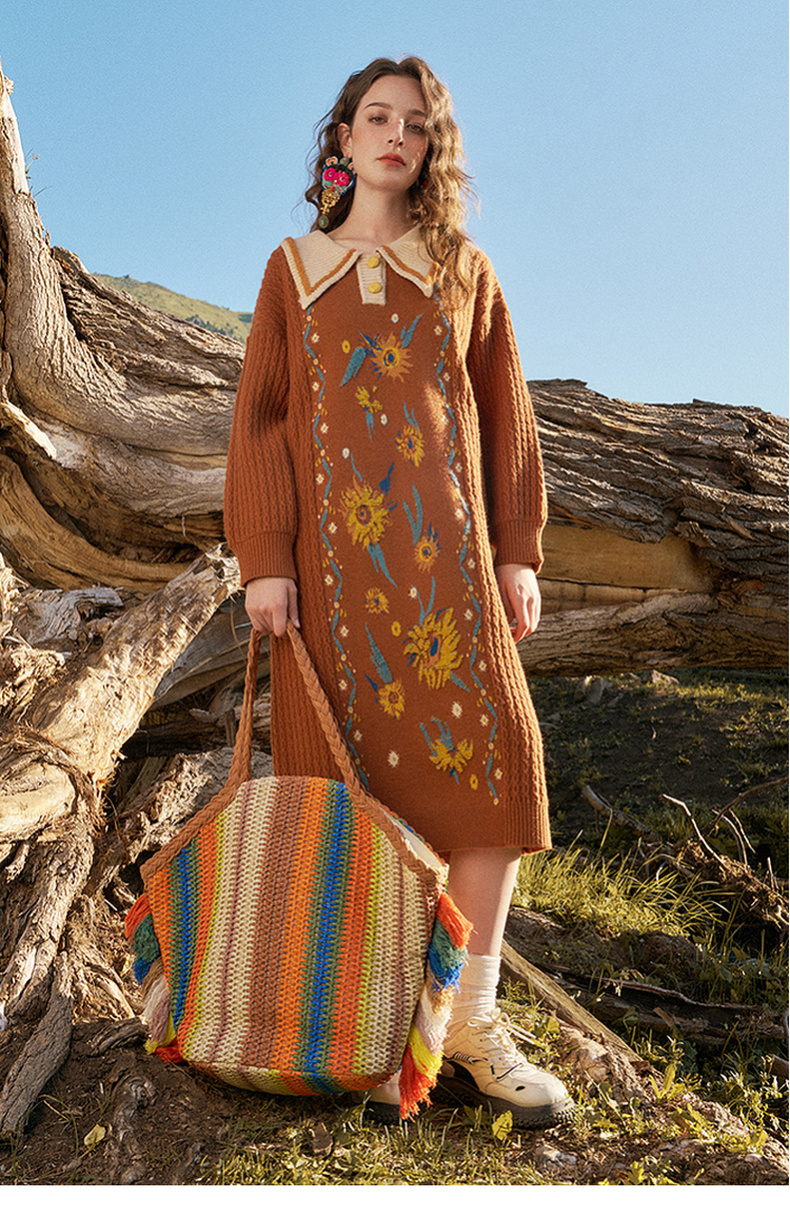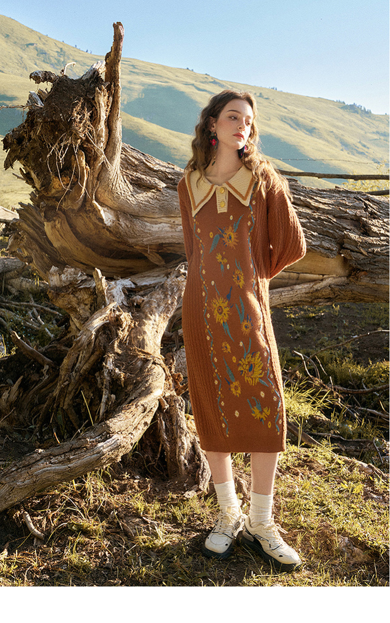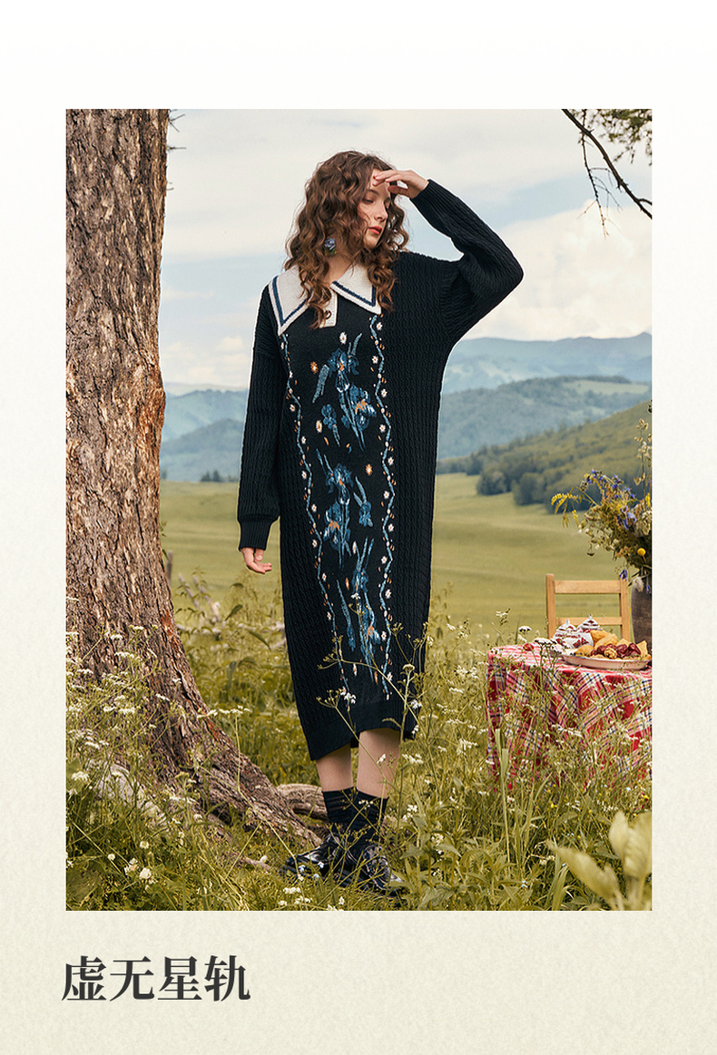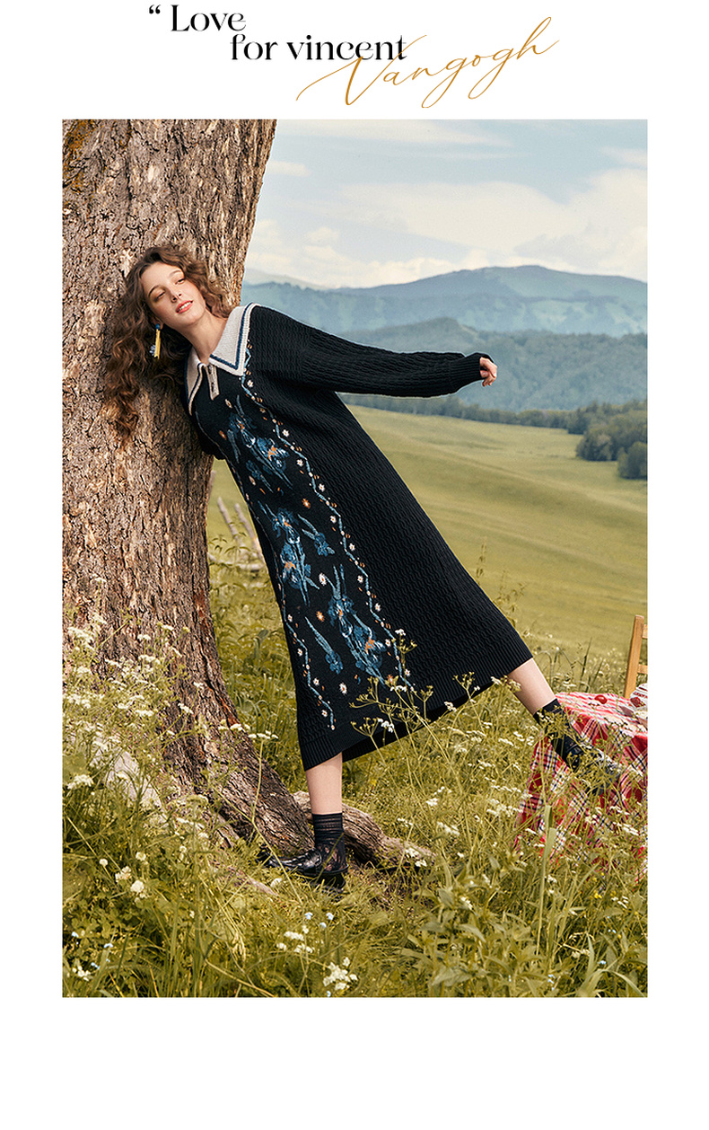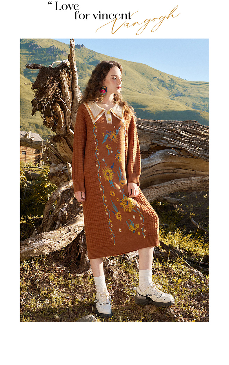 两三事梵高文艺虚无星轨2024秋新款文艺风polo领花色毛衣裙连衣裙