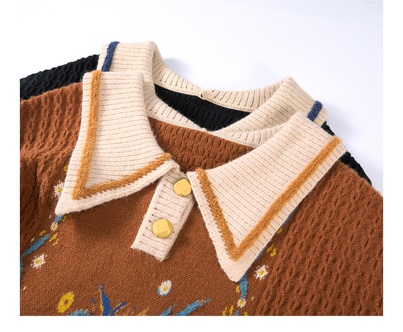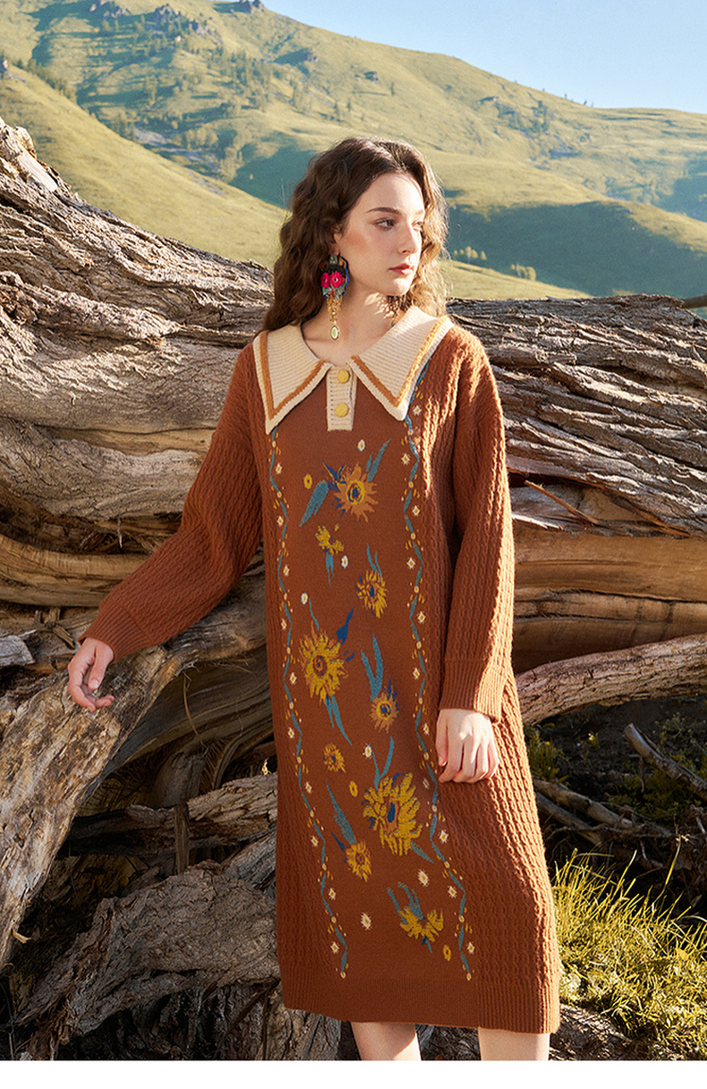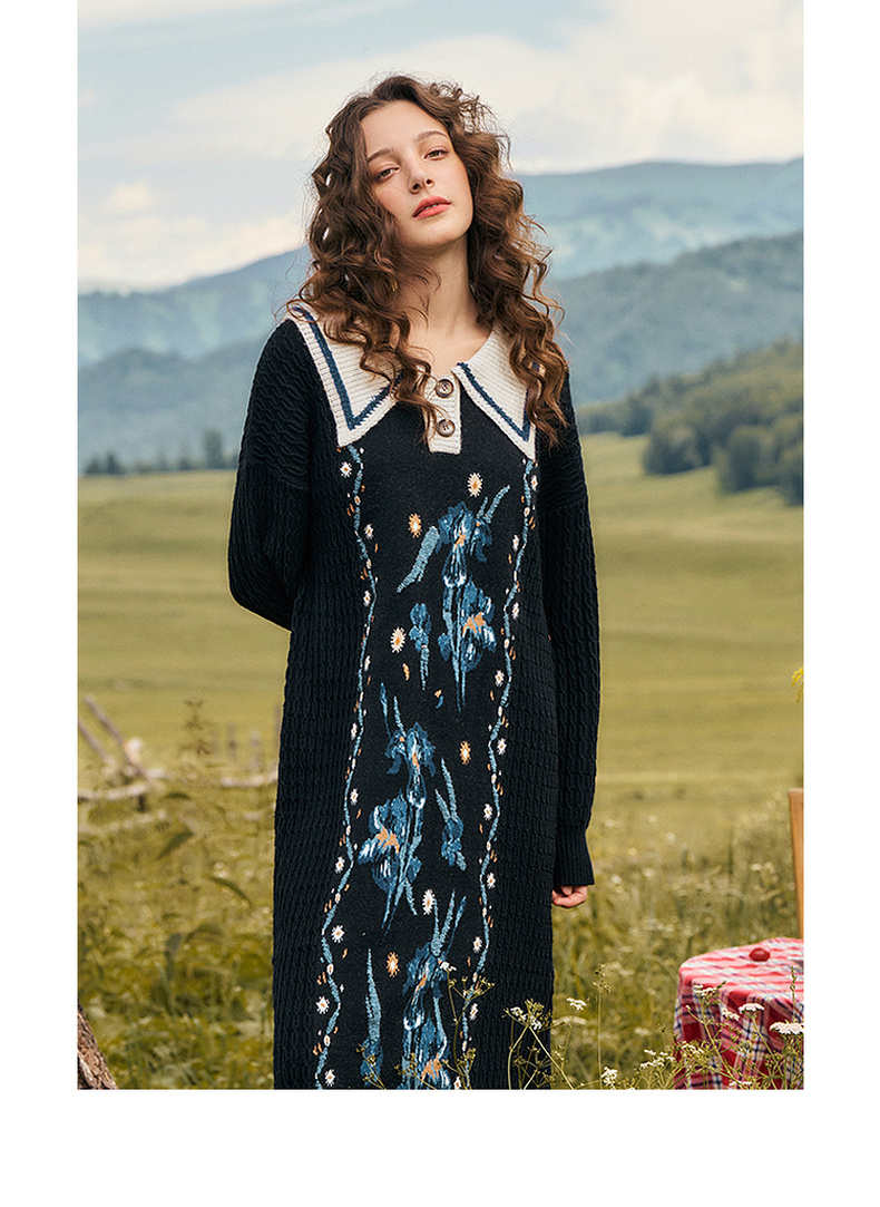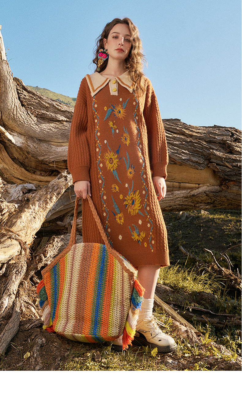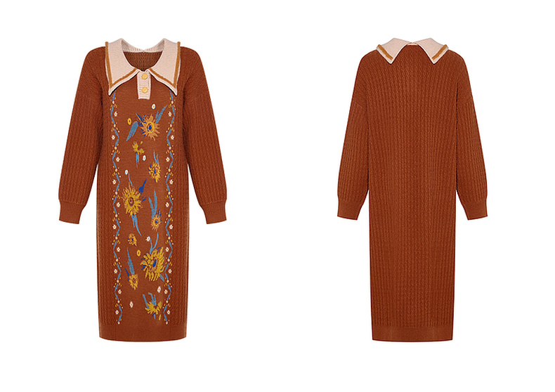 两三事梵高文艺虚无星轨2024秋新款文艺风polo领花色毛衣裙连衣裙