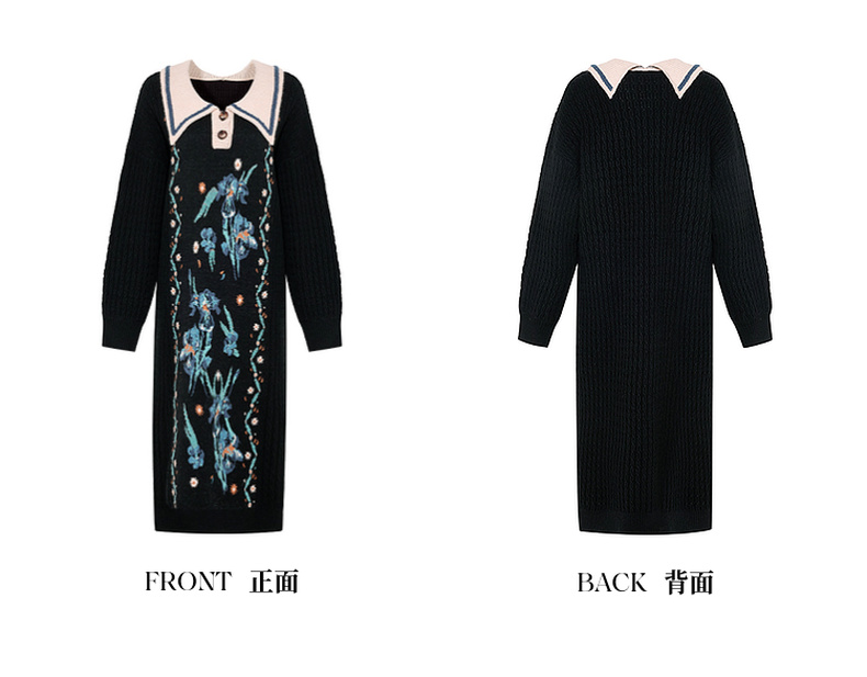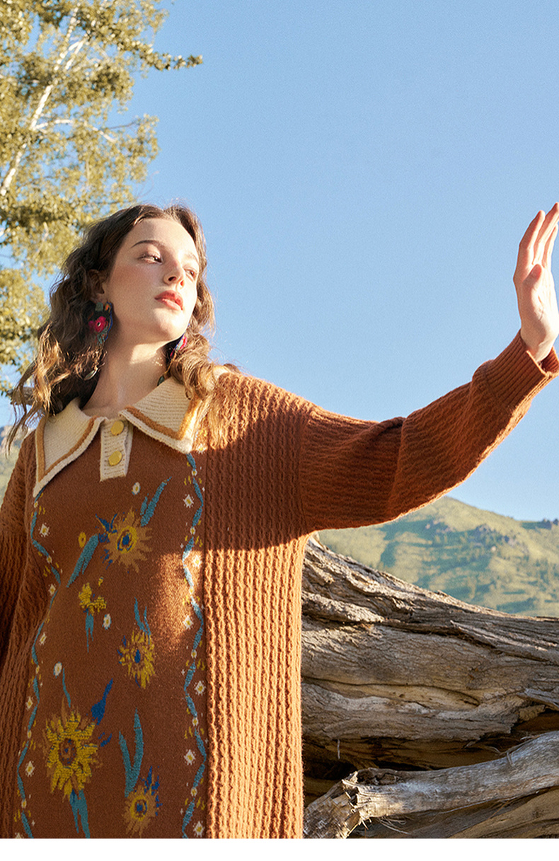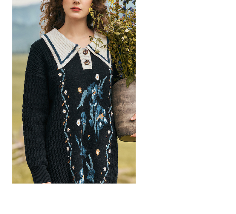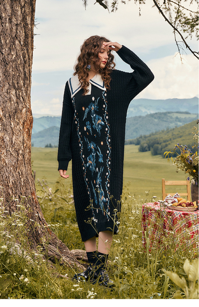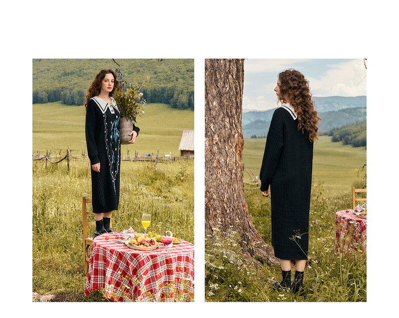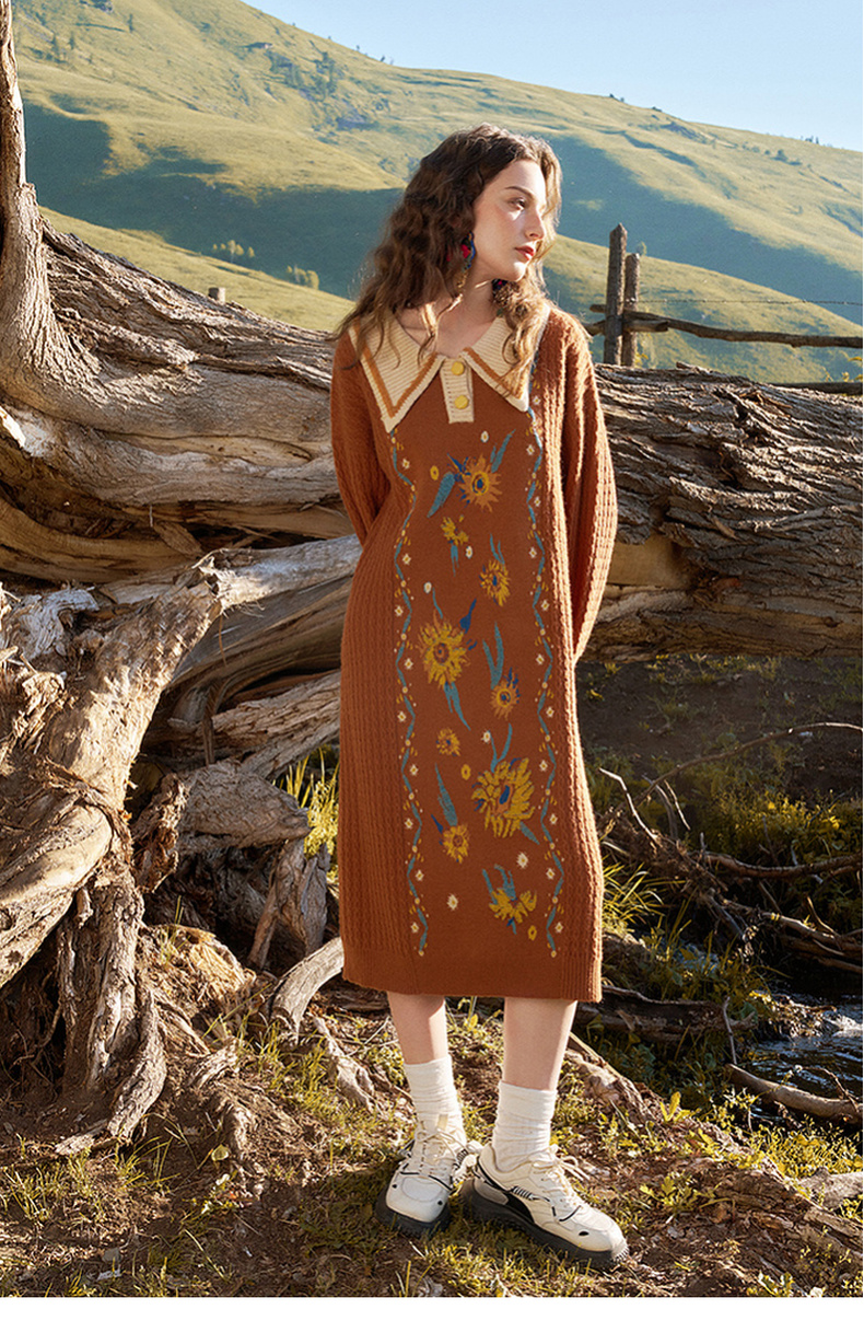 两三事梵高文艺虚无星轨2024秋新款文艺风polo领花色毛衣裙连衣裙