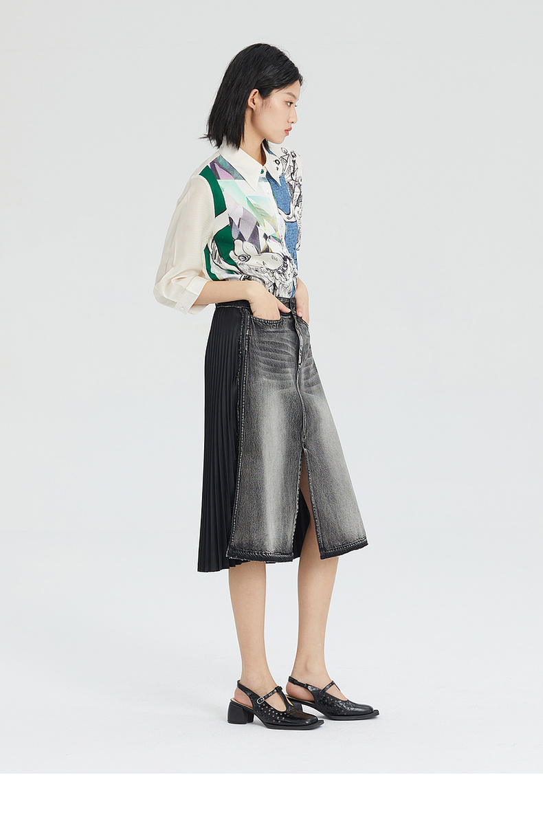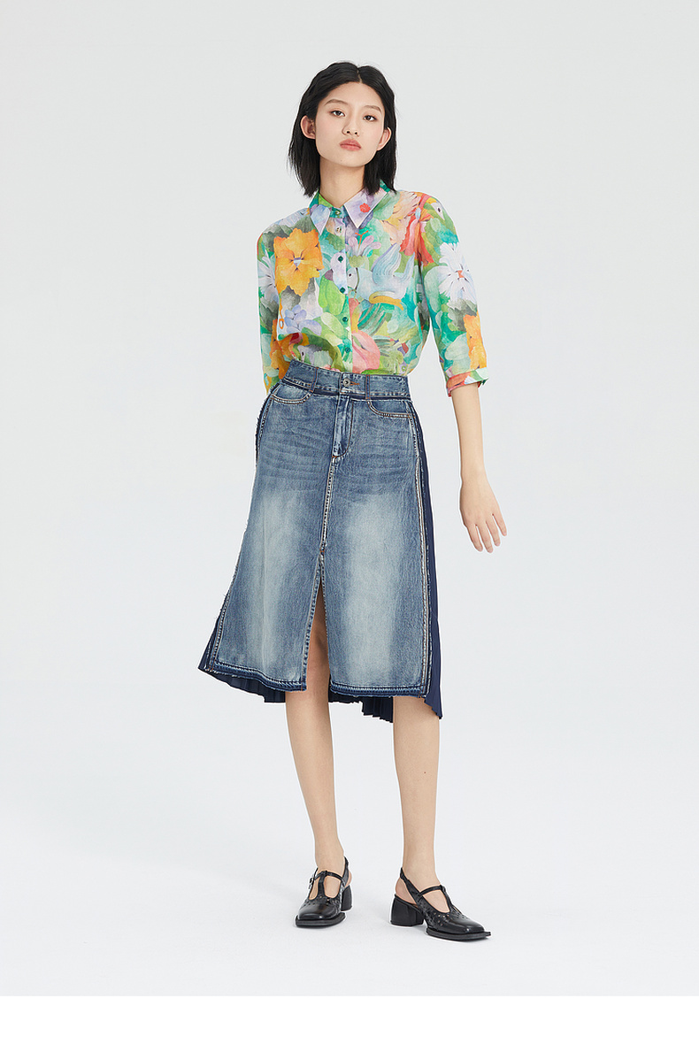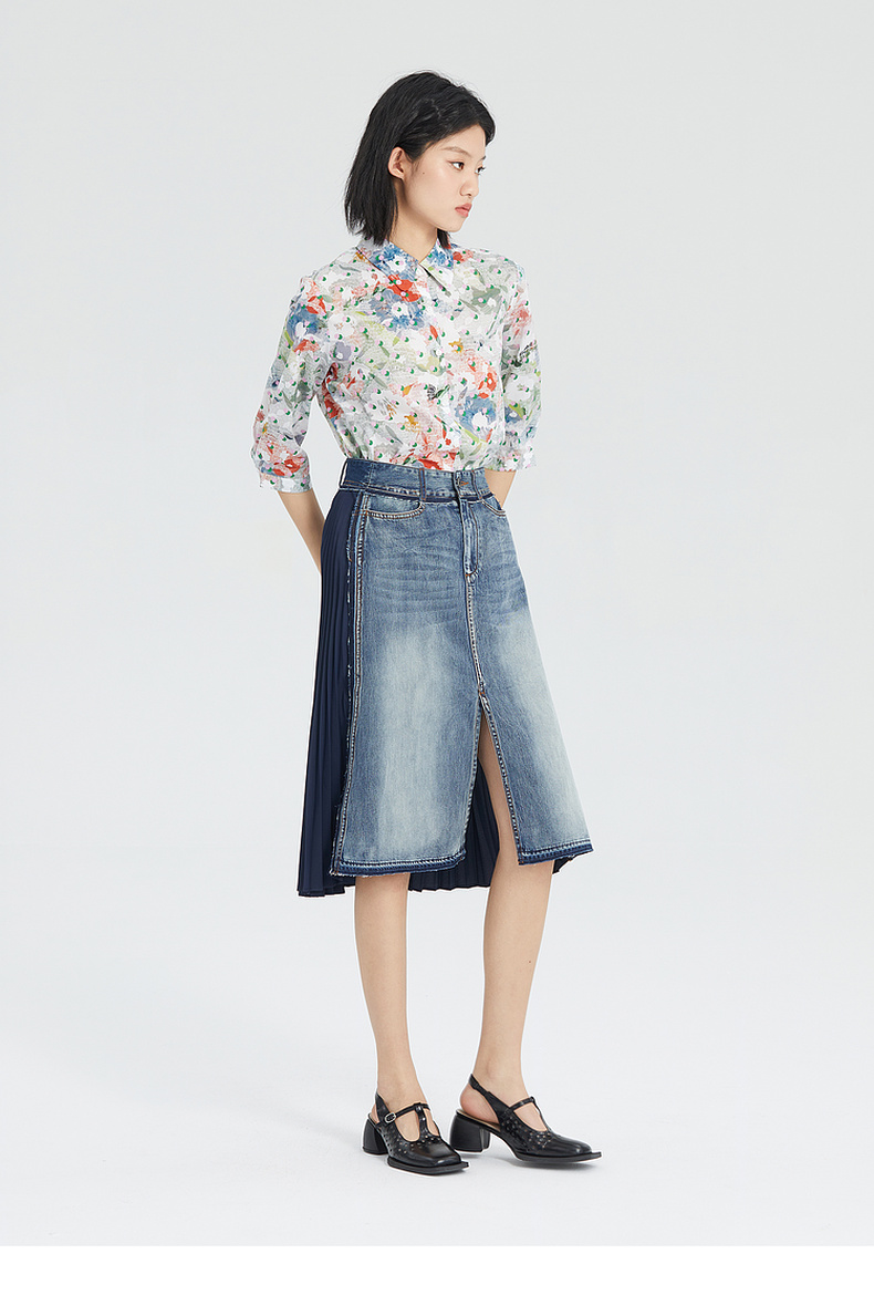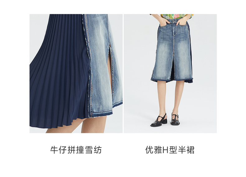 谜底半身裙2023夏季新款高腰百搭牛仔拼接雪纺中长裙女235MB6014