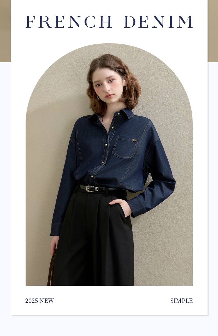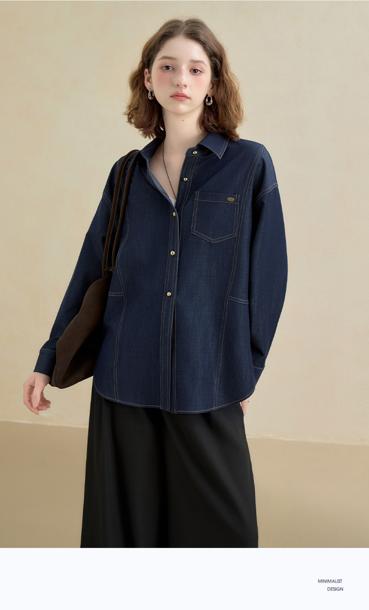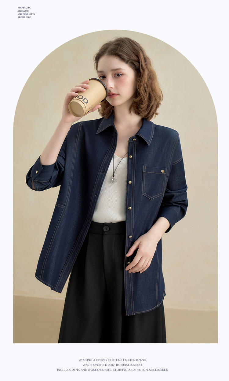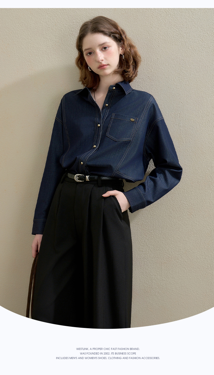 西遇复古港风蓝色仿牛仔衬衫女2025秋季宽松百搭慵懒休闲通勤外套V2951197