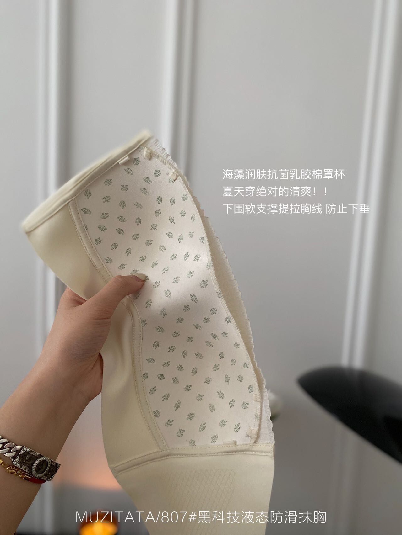 引力杯!海藻抑菌乳胶棉,贴肤层是植物海藻 抗菌滋养面料,罩杯是乳胶透气棉杯 超薄杯立体显胸,整个罩杯的弧度是完全服帖在胸部上的 牢牢吸住