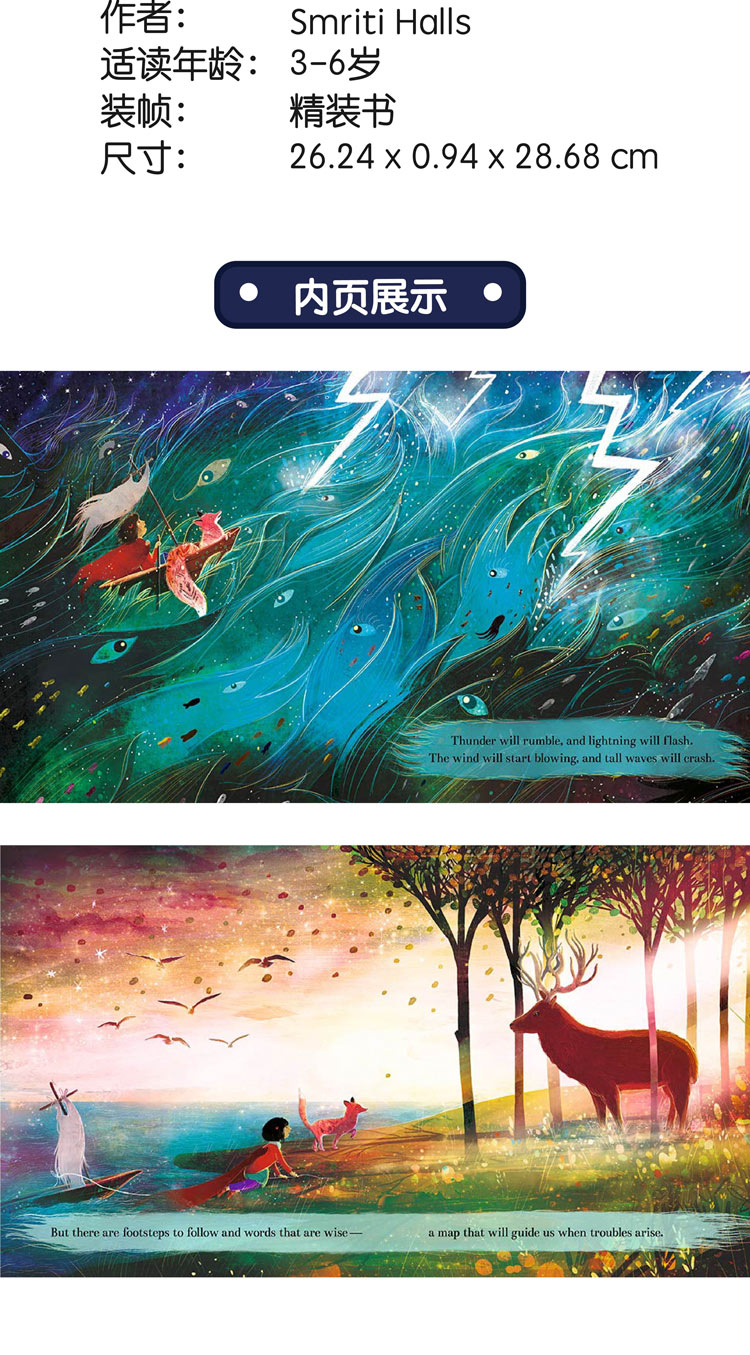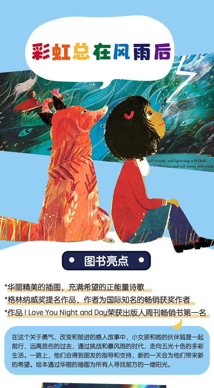 在这个关于勇气、改变和前进的感人故事中,小女孩和她的伙伴狐狸一起前行,远离悲伤的过去,通过挑战和暴风雨的时代,走向五光十色的多彩生活。一路上,他们会得到朋友的指导和支持,新的一天会为他们带来新的希望。绘本通过华丽的插图为所有人寻找前方的一缕阳光。