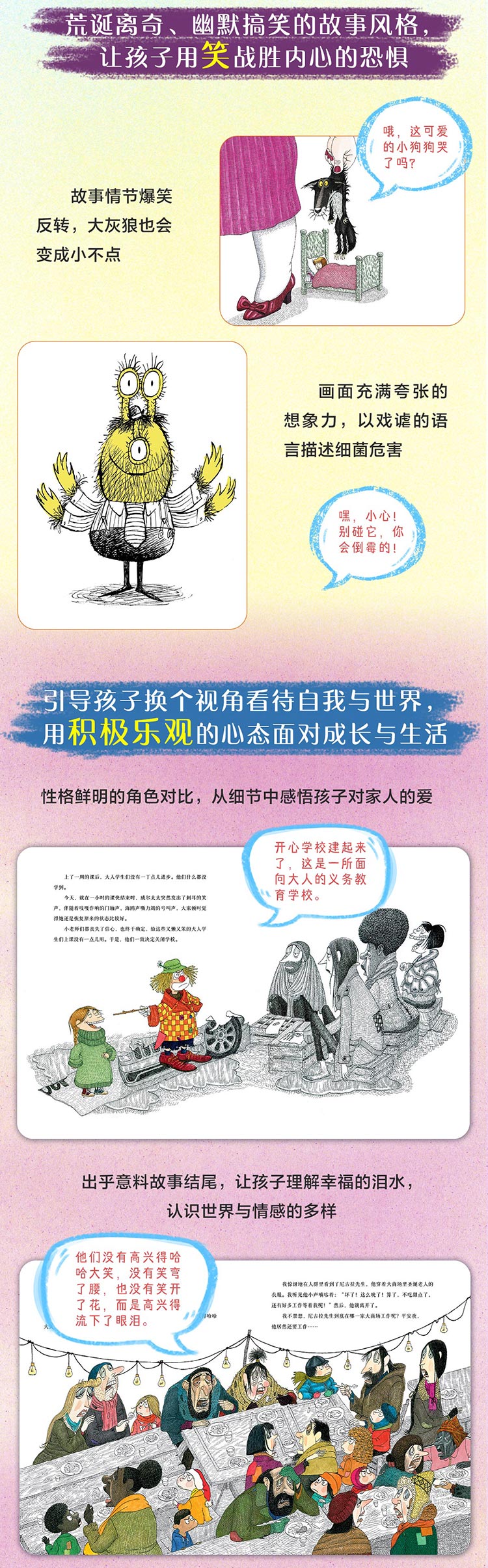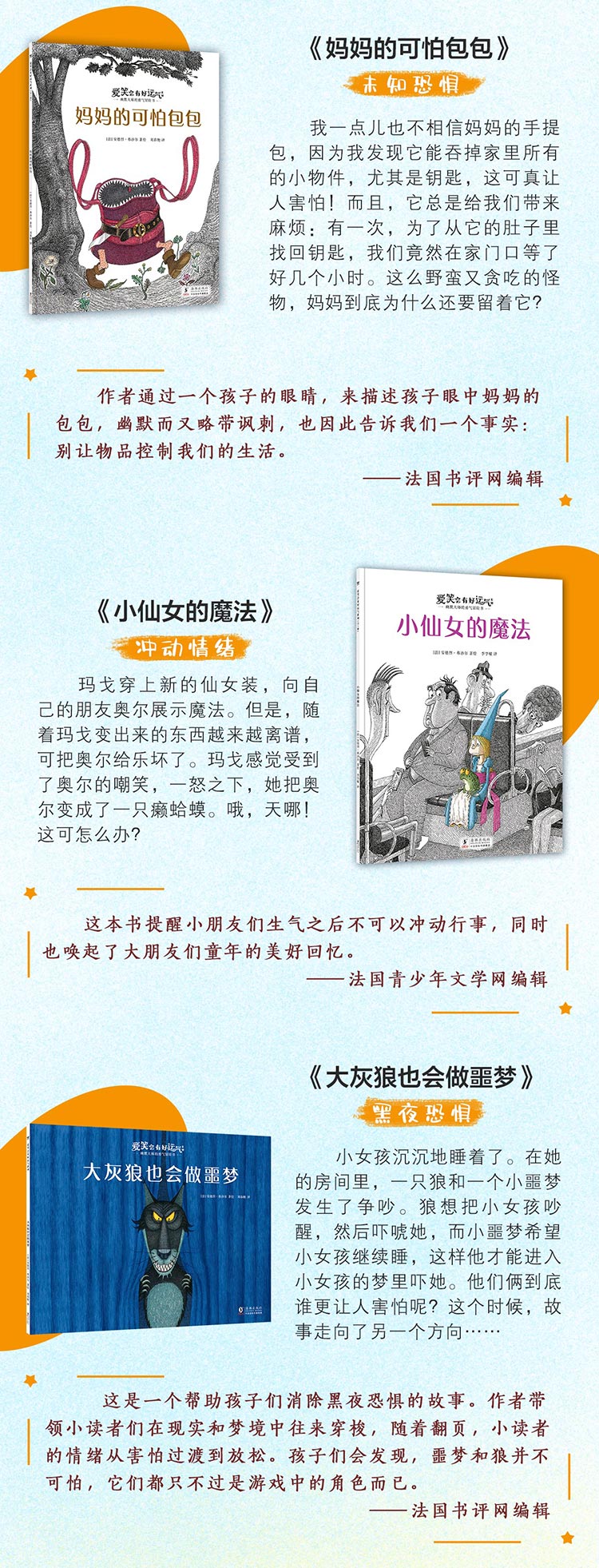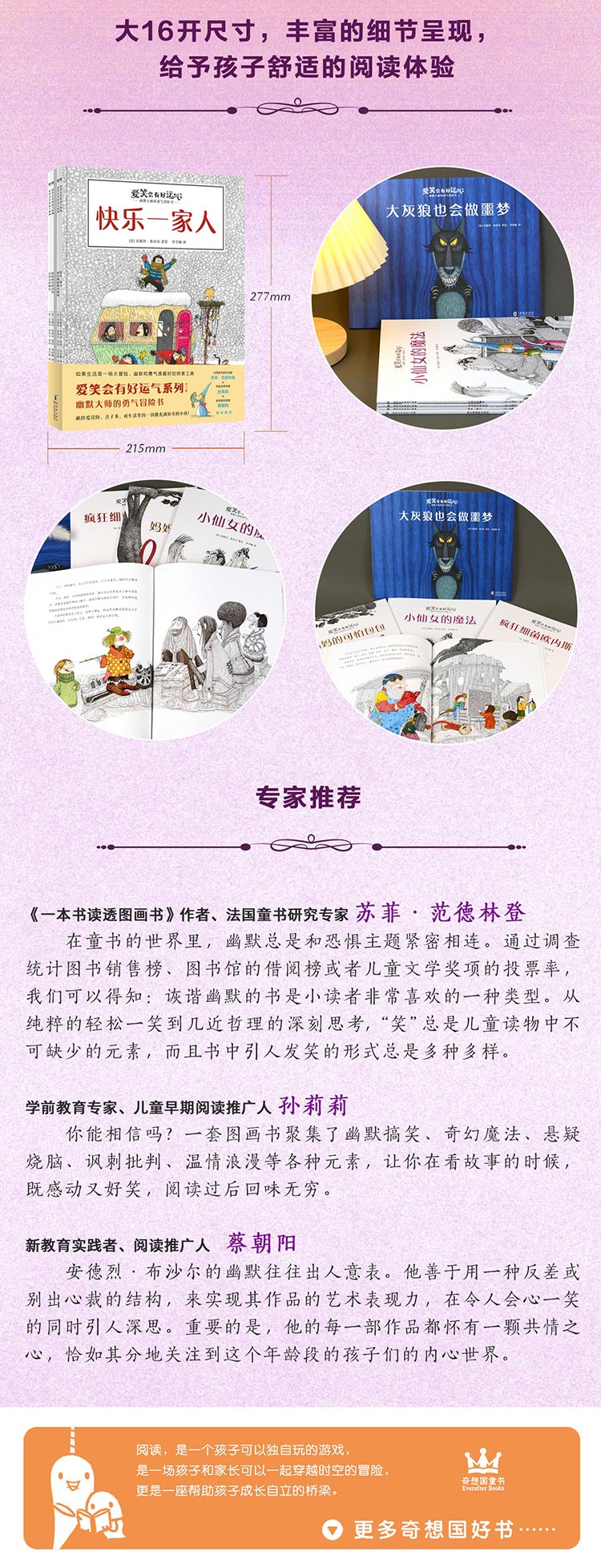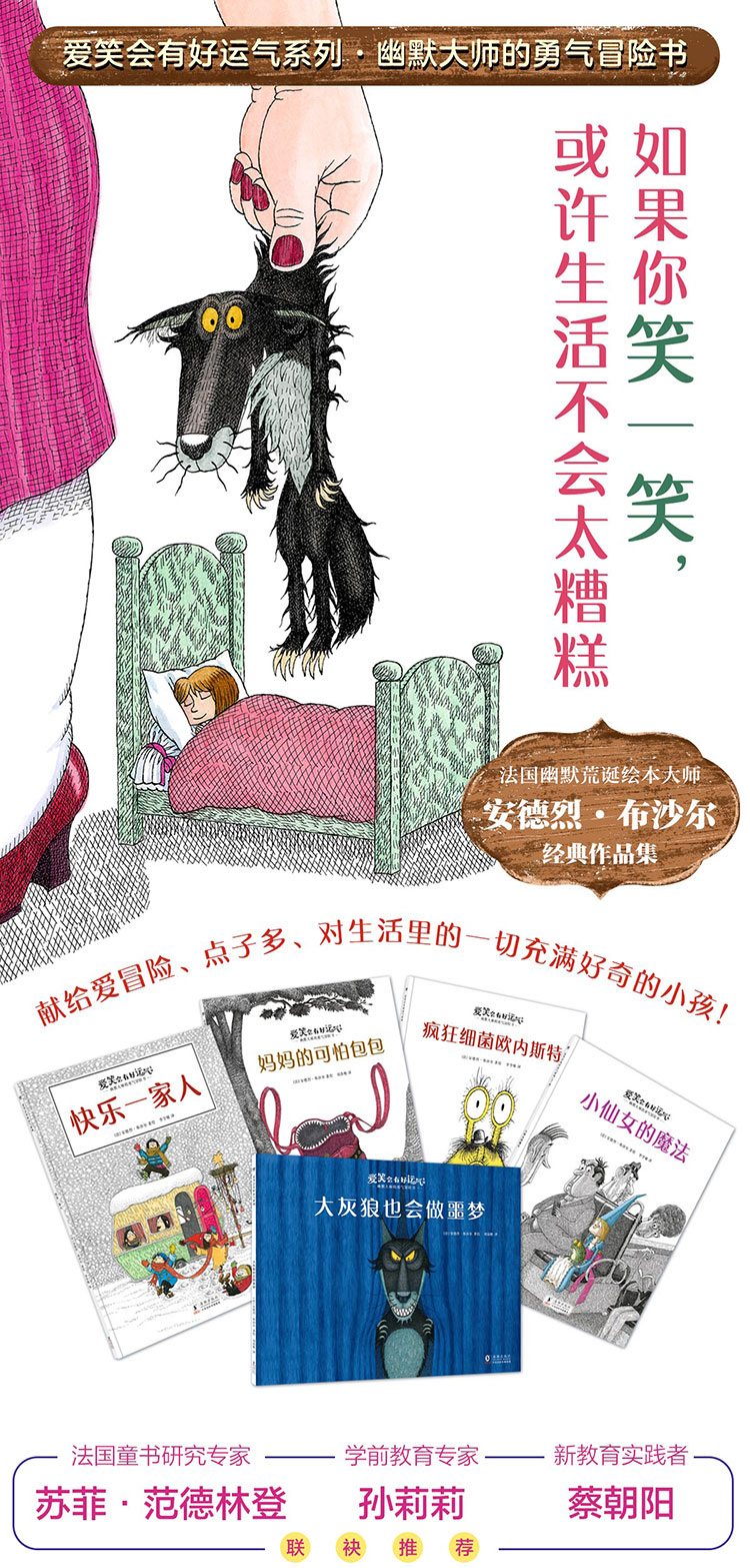 《爱笑会有好运气系列》是法国荒诞幽默绘本大师安德烈·布沙尔经典作品集。本系列包括5个故事:《快乐一家人》《疯狂细菌欧内斯特》《妈妈的可怕包包》《大灰狼也会做噩梦》《小仙女的魔法》,故事主题分别为生活困境、细菌侵袭、未知恐惧、黑夜噩梦、冲动情绪。每一个故事都基于现实主题,用幻想的形式“戏说”恐惧,引导孩子换一个视角看待自我与世界,学会用乐观的态度面对成长与生活。