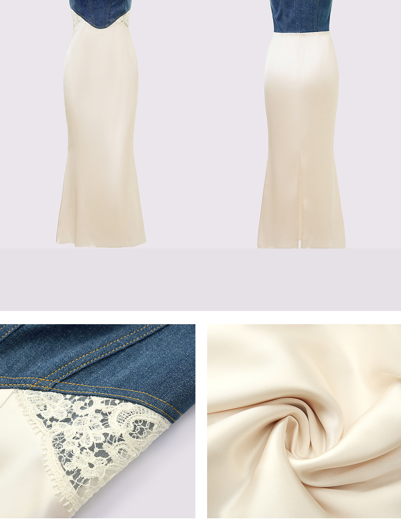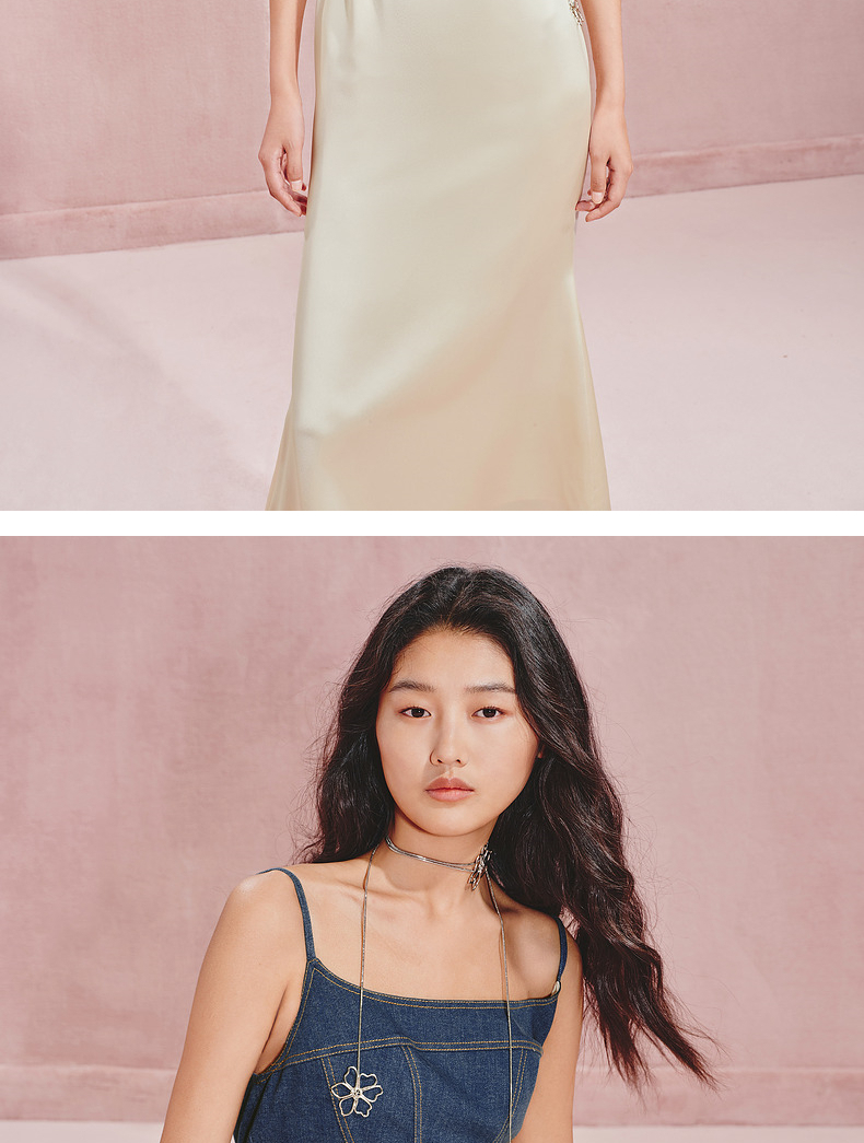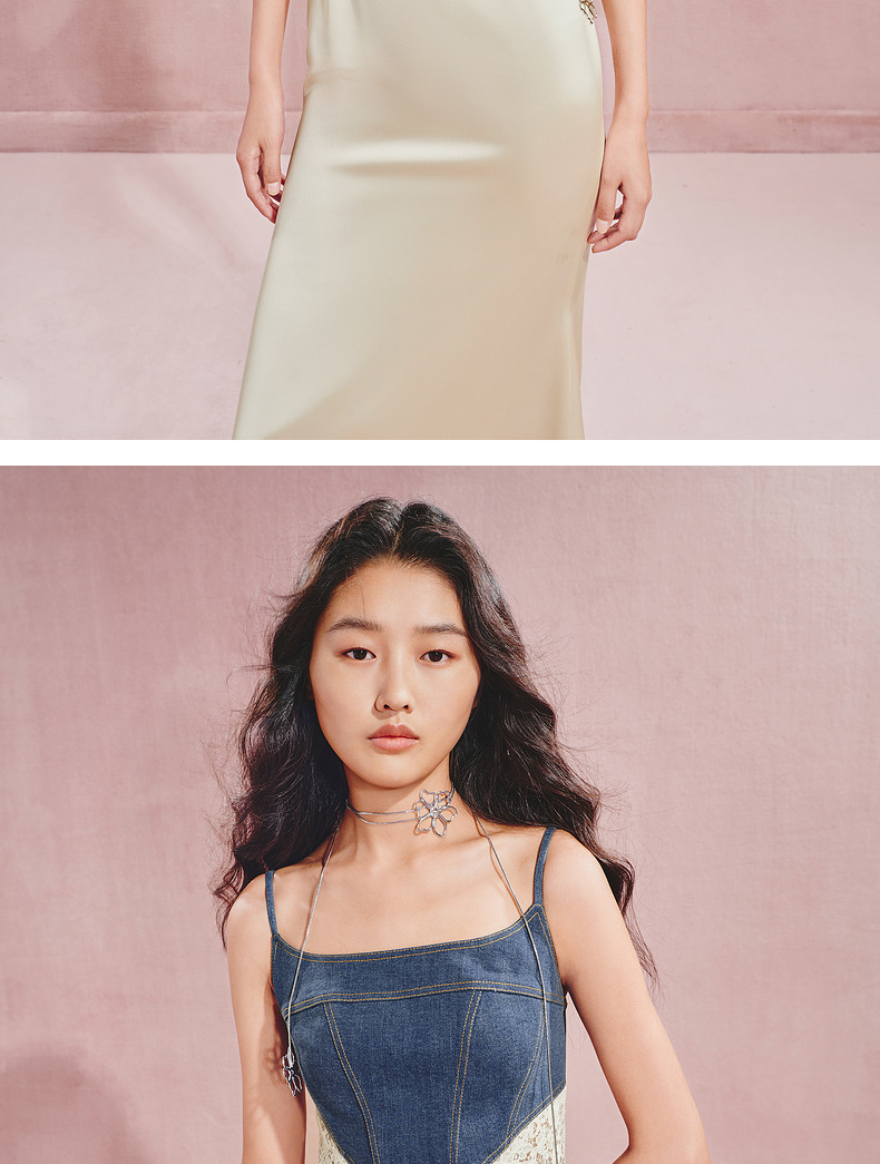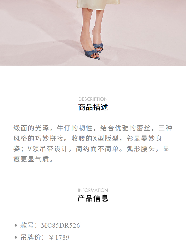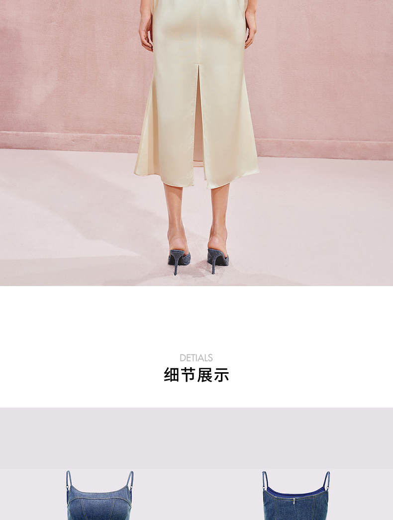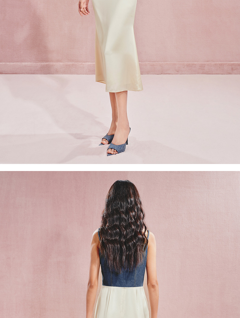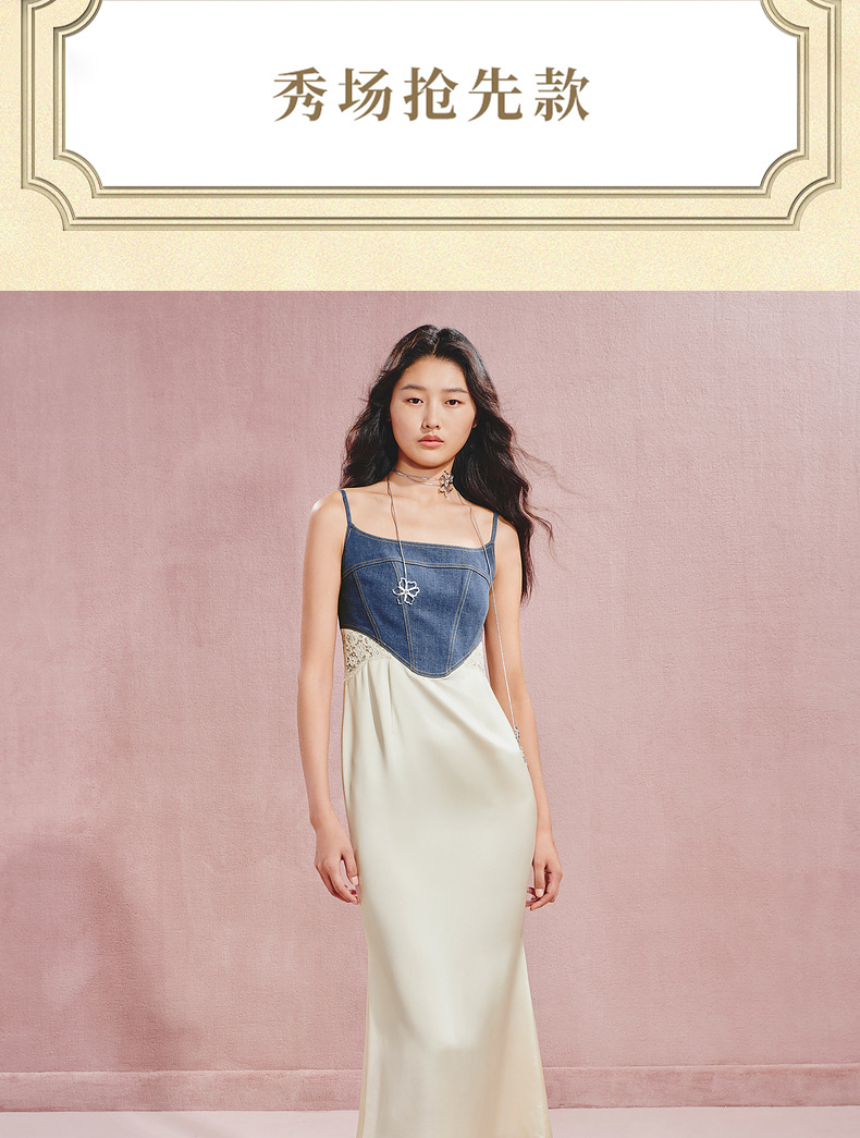 门店发货:MAXRIENY都市优雅感牛仔拼接缎面吊带连衣裙(货号:MC85DR526)