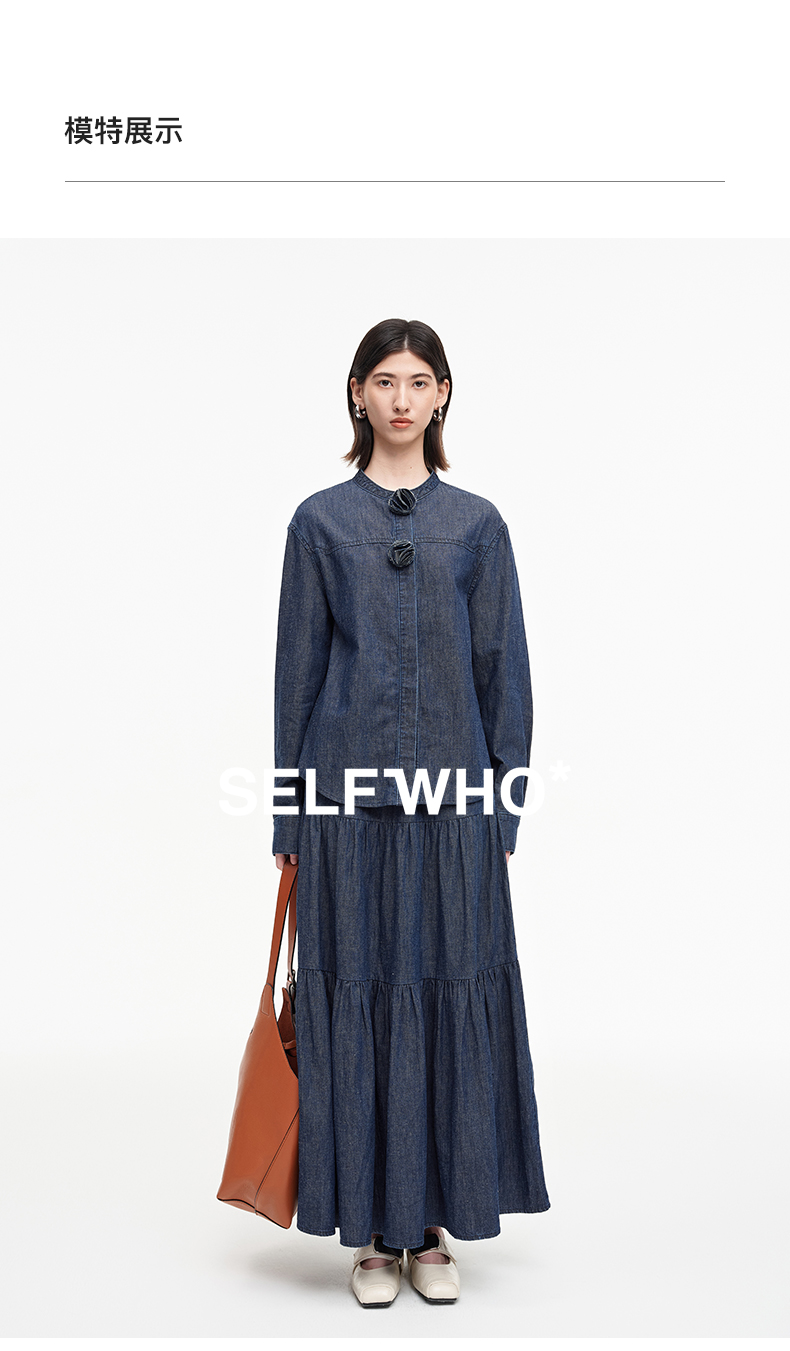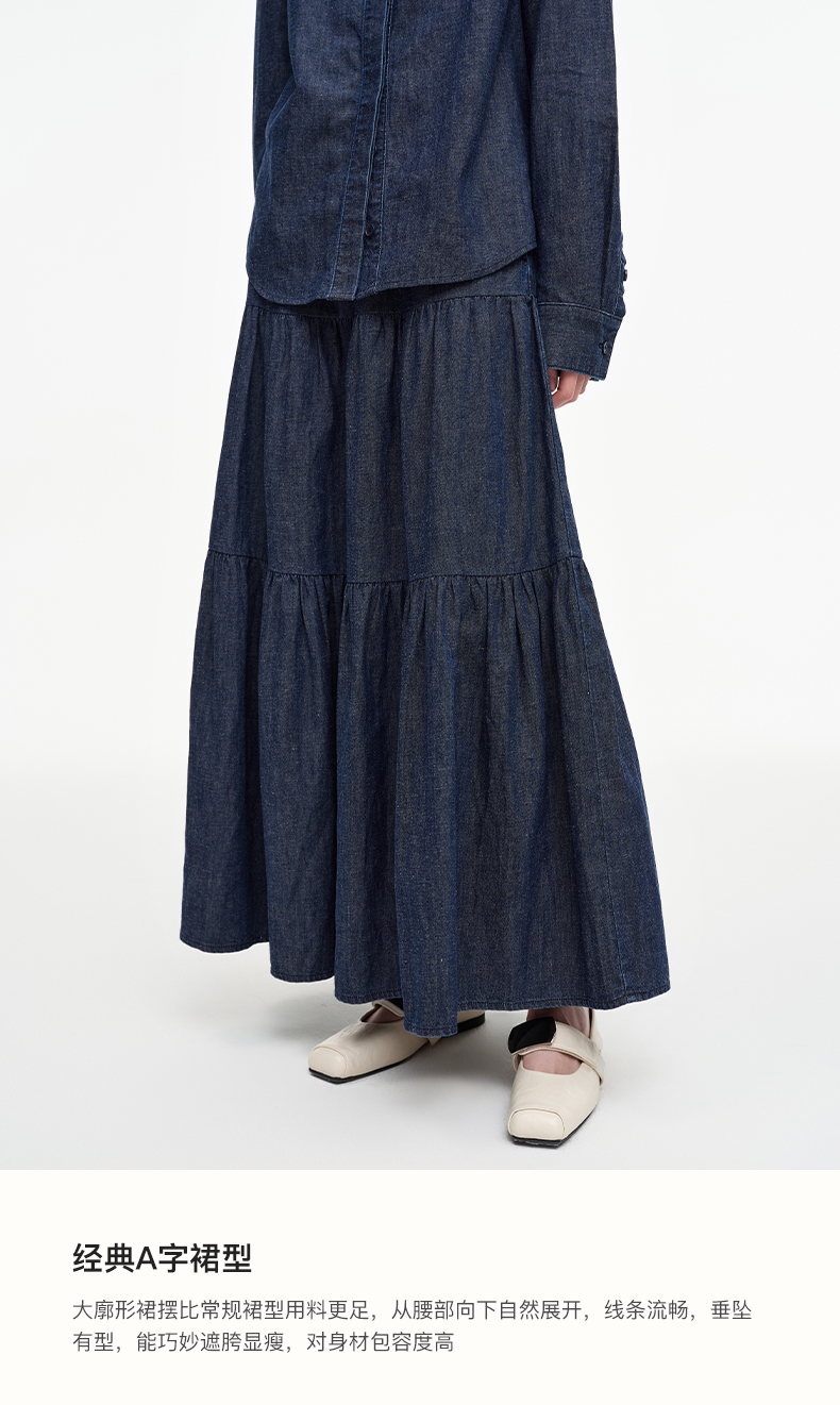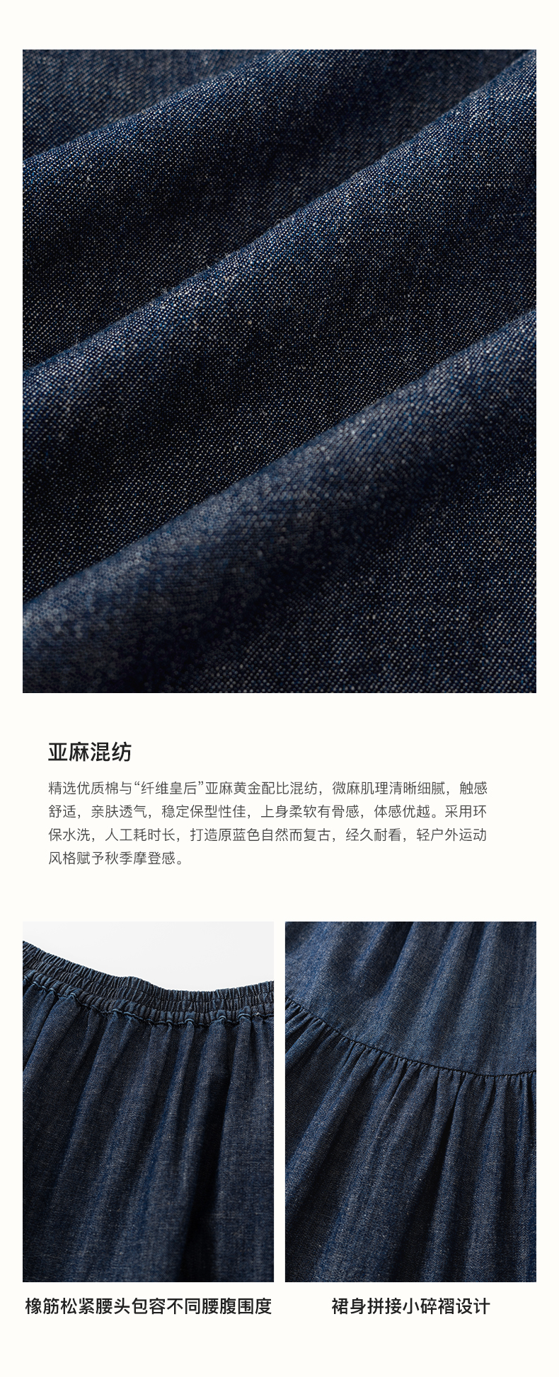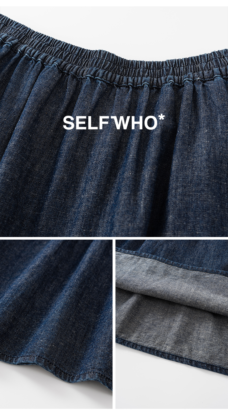 SELFWHO棉麻原蓝色牛仔半身裙女2025秋新款宽松拼接碎褶设计A字裙
