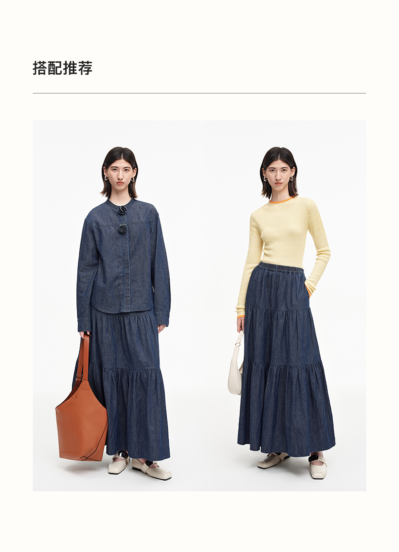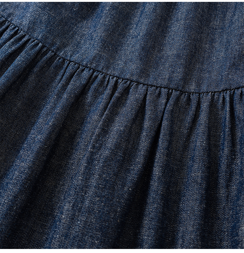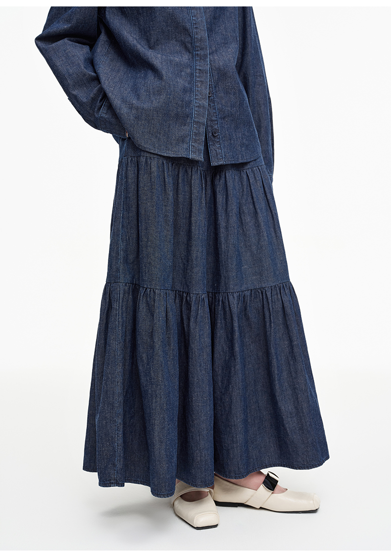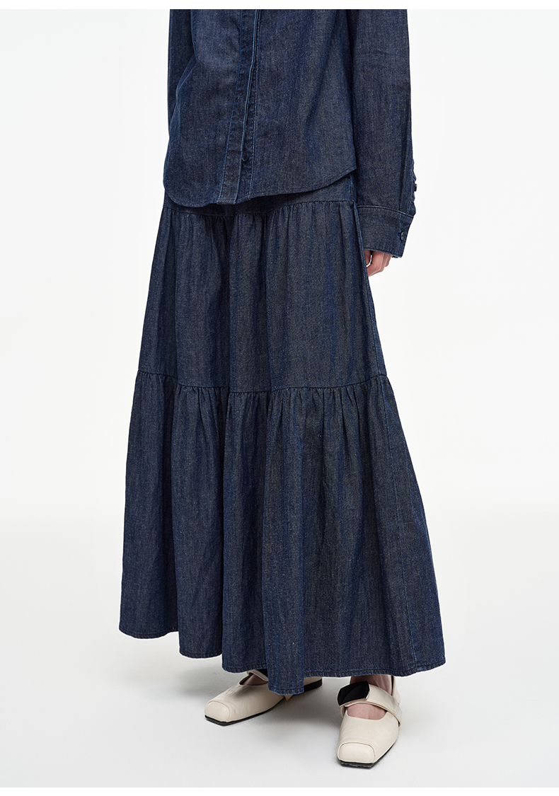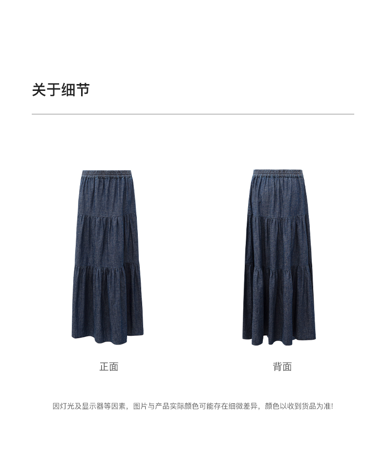 SELFWHO棉麻原蓝色牛仔半身裙女2025秋新款宽松拼接碎褶设计A字裙