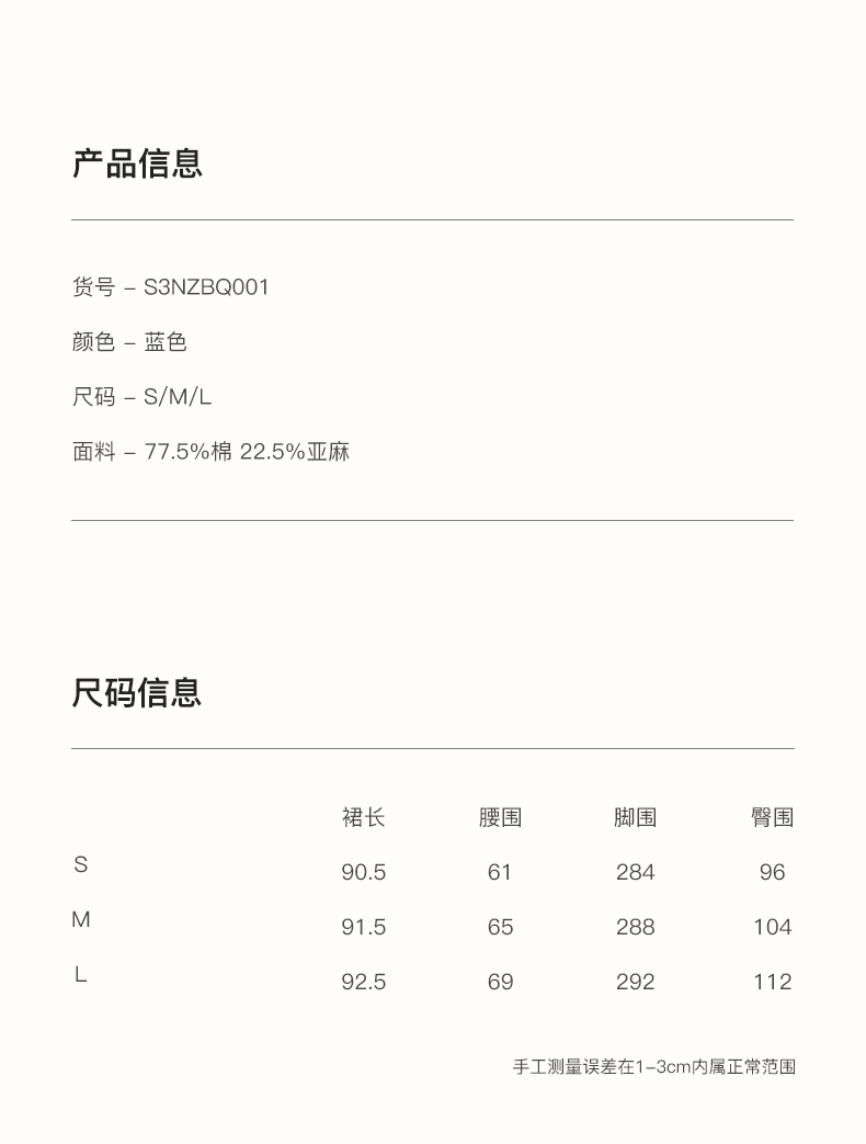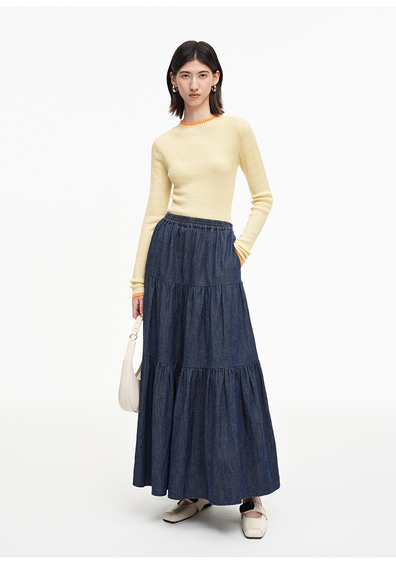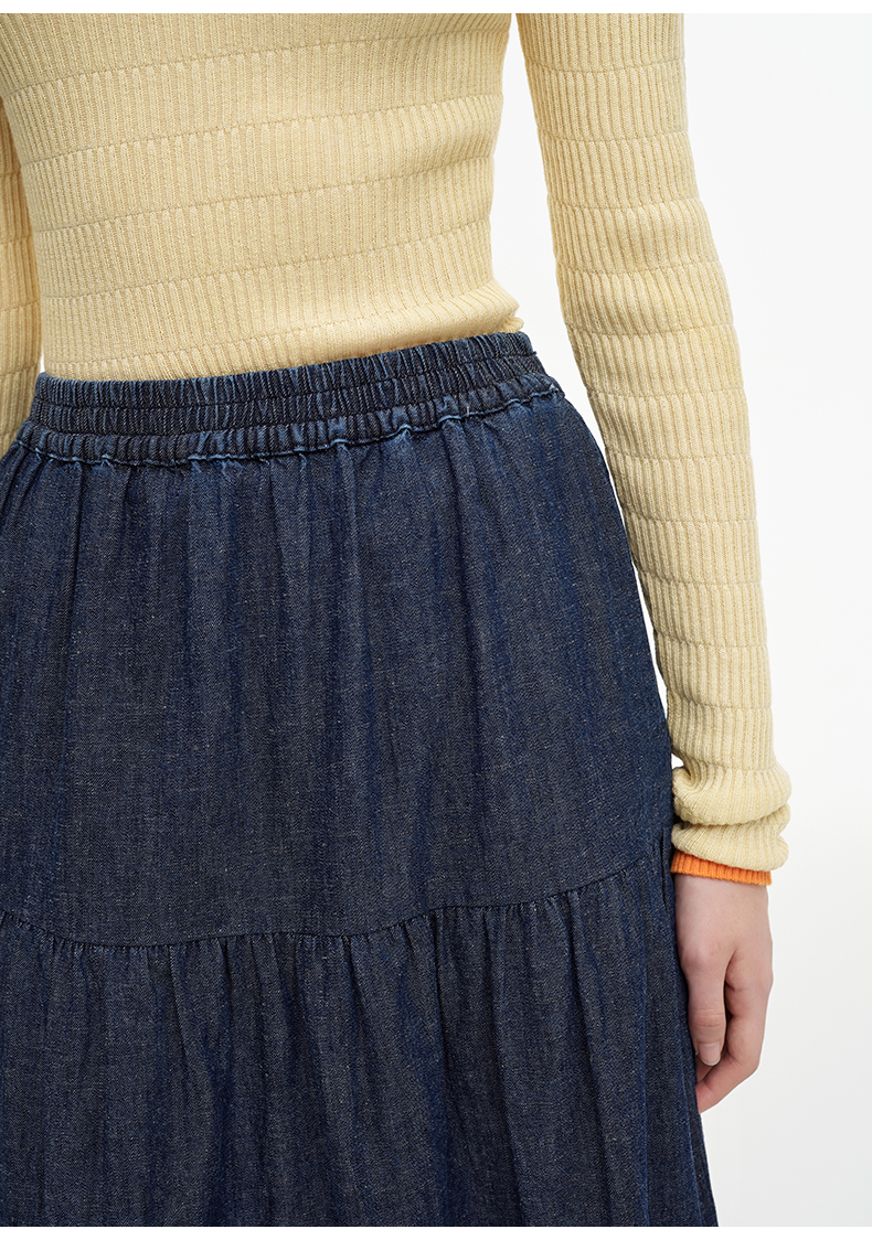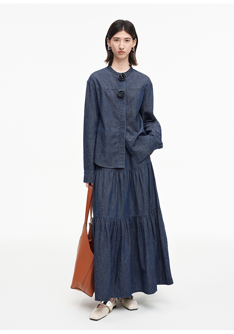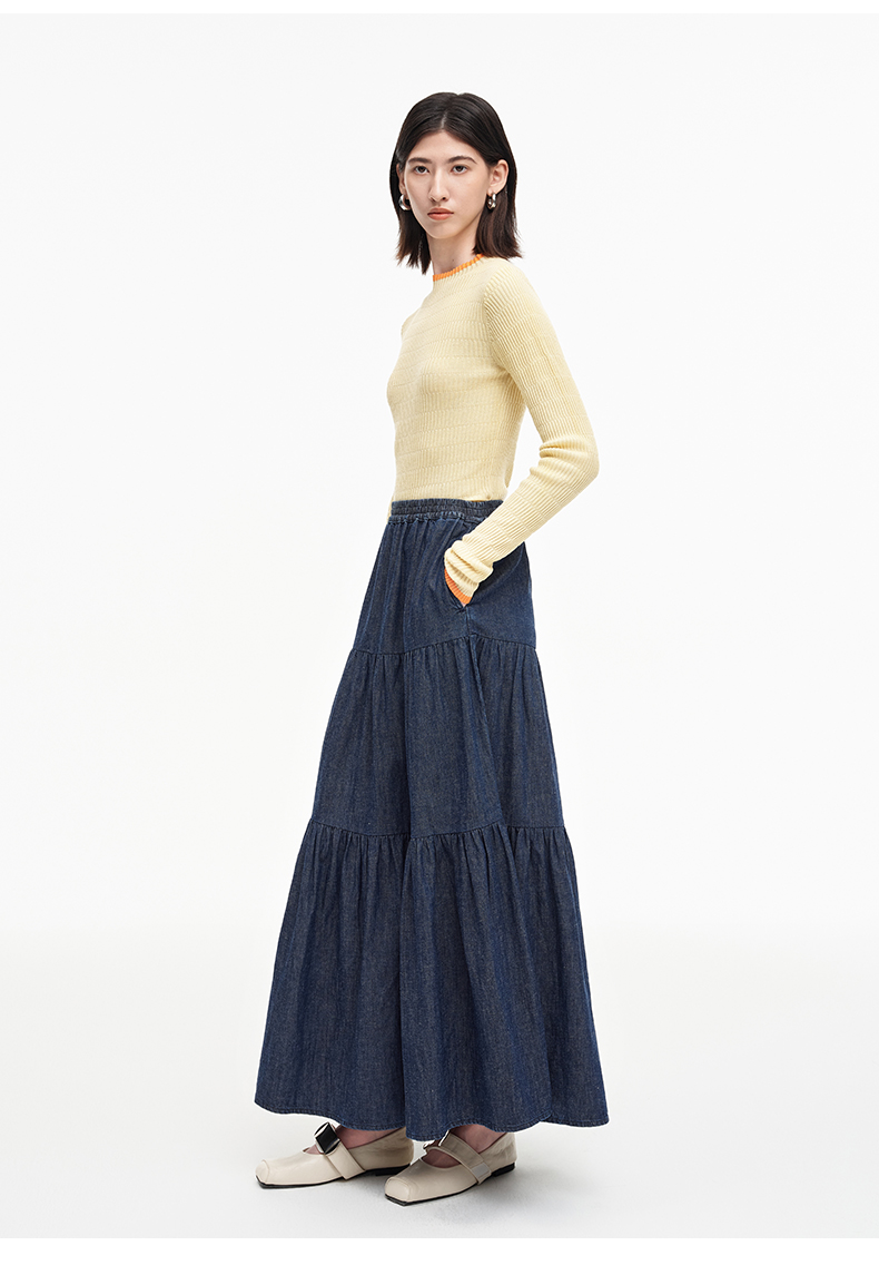 SELFWHO棉麻原蓝色牛仔半身裙女2025秋新款宽松拼接碎褶设计A字裙