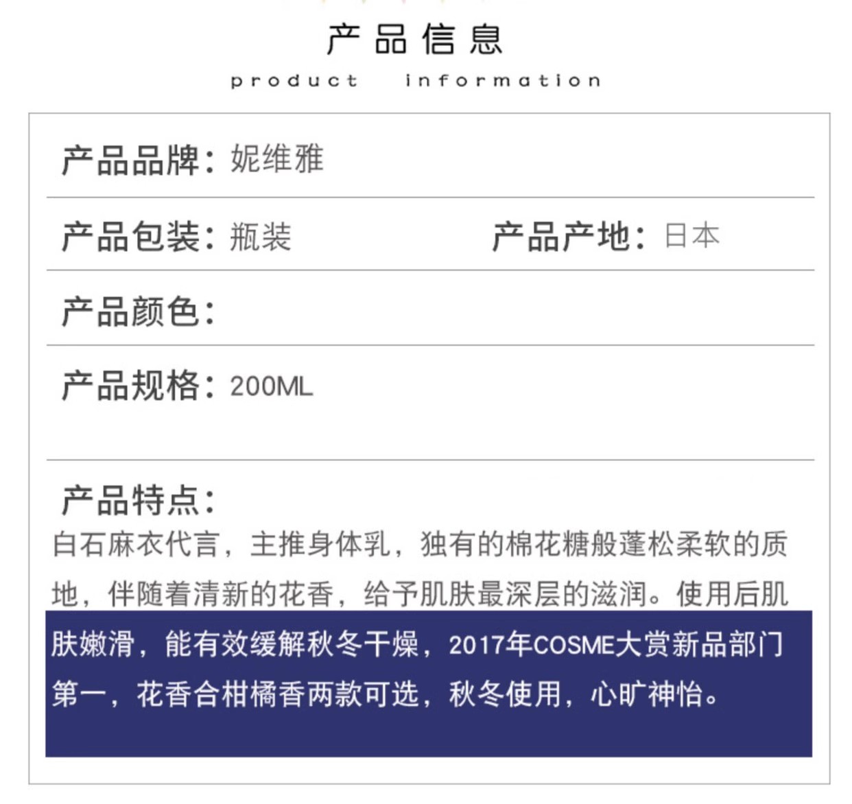 【保税仓】Nivea/妮维雅棉花糖身体乳保湿乳液花香、柑橘香200ml
