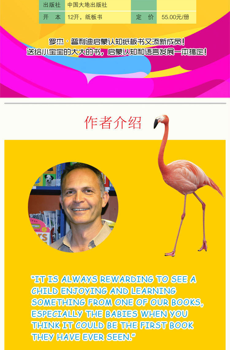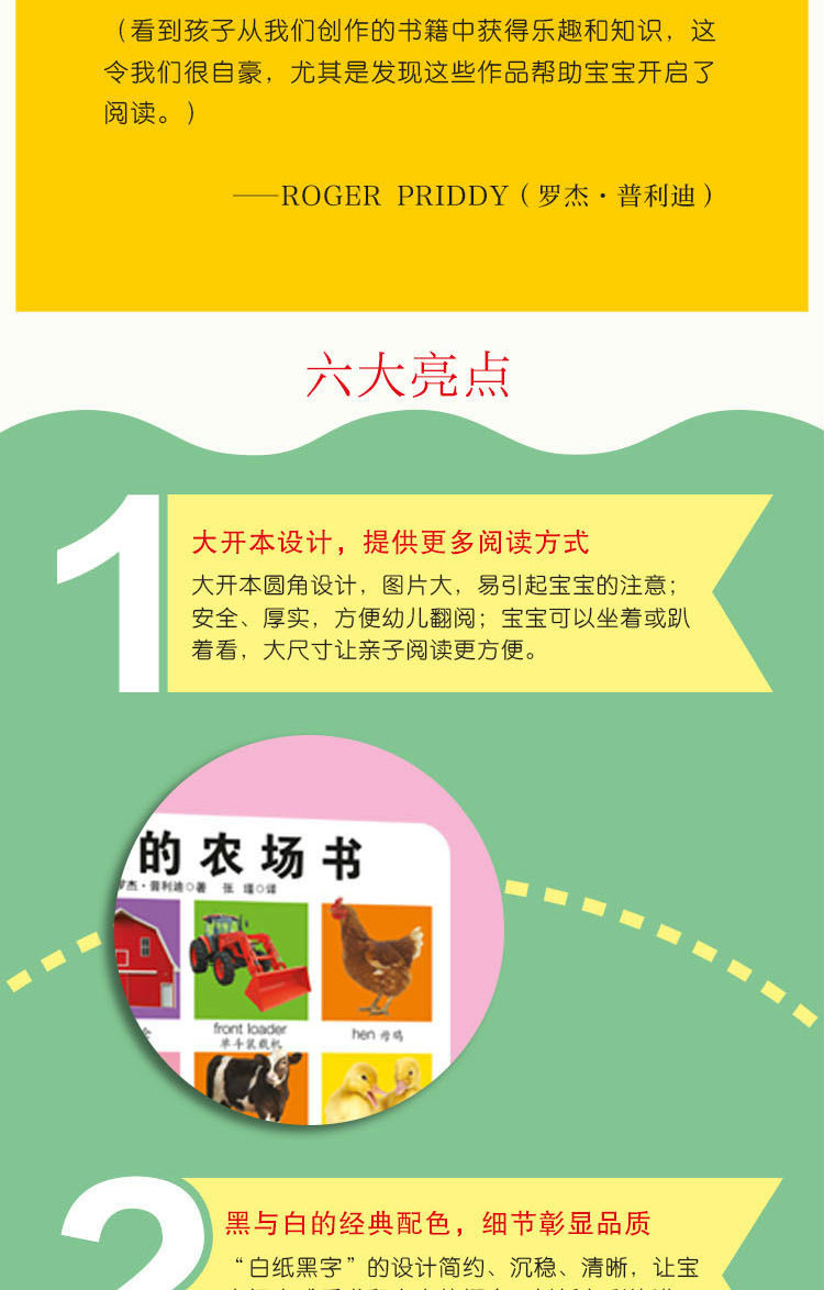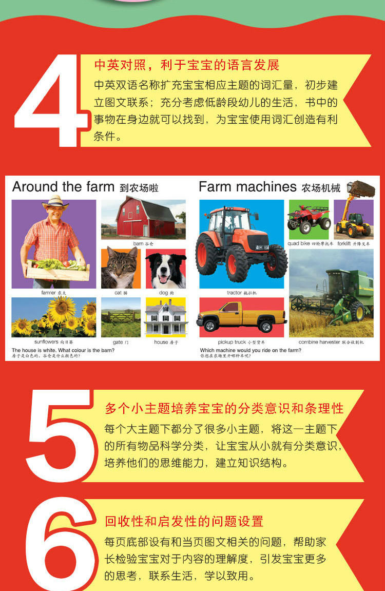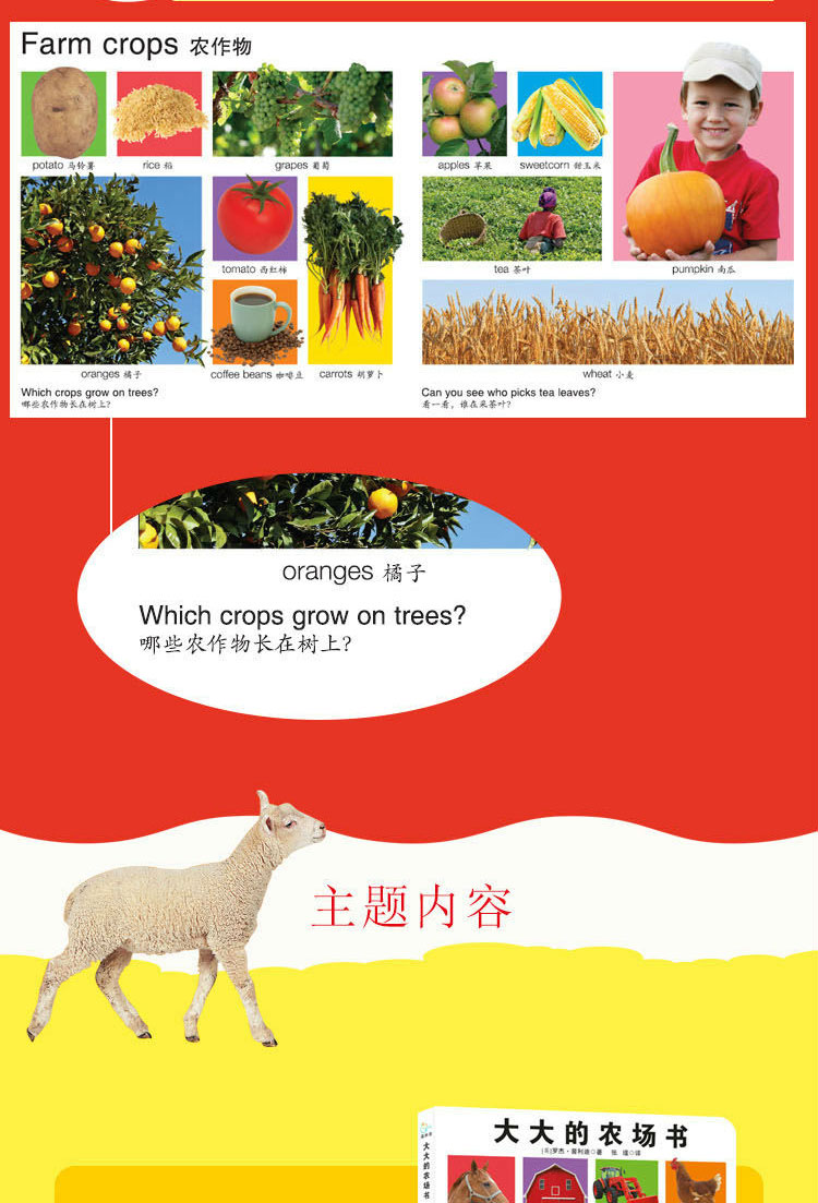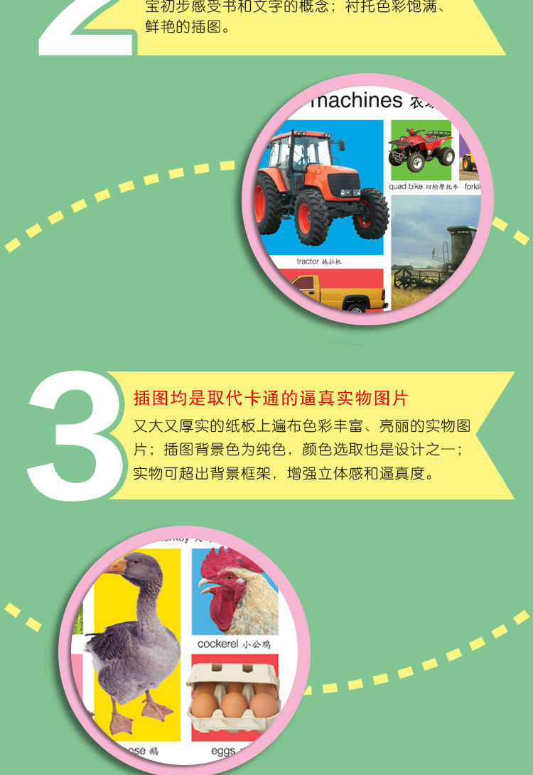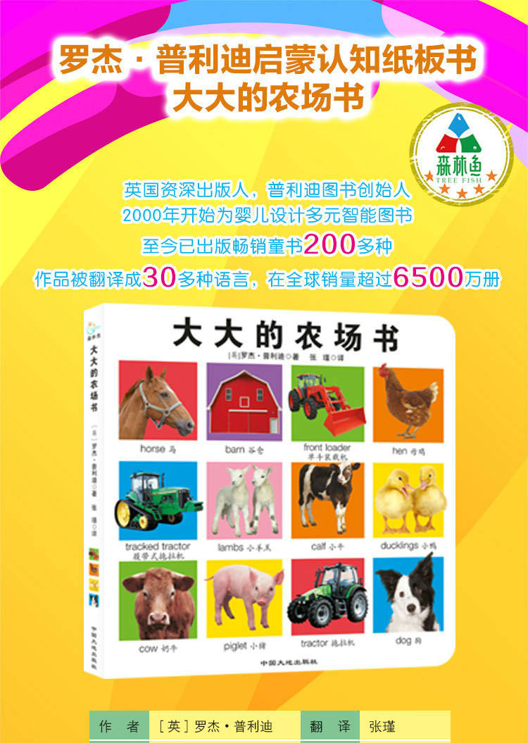 送给爱农场的宝宝的完美礼物。这些又大又结实的纸板上遍布色彩丰富、亮丽的农场图片,从农用机车到农场动物再到农作物……每张图片下都配有相应的物品/动物名称(双语),扩充宝宝关于农场的词汇量且初步建立图文联系。