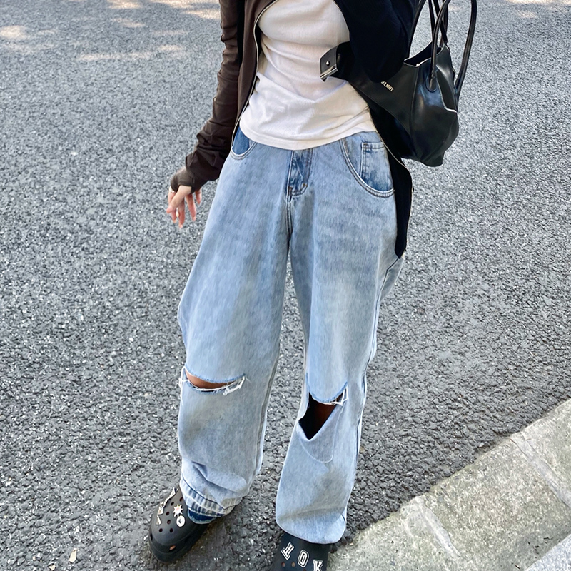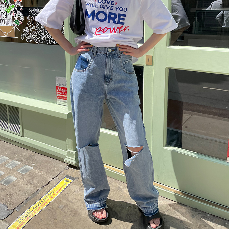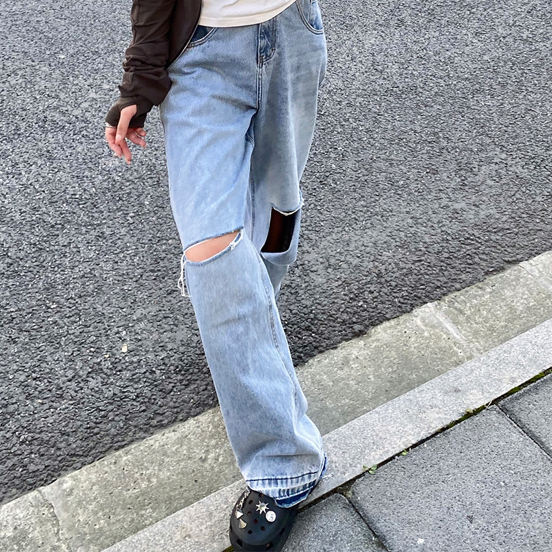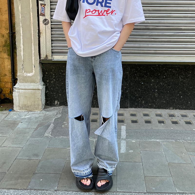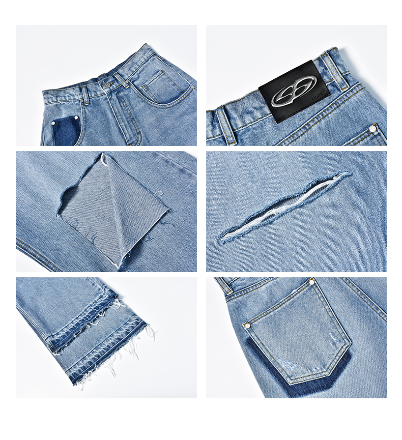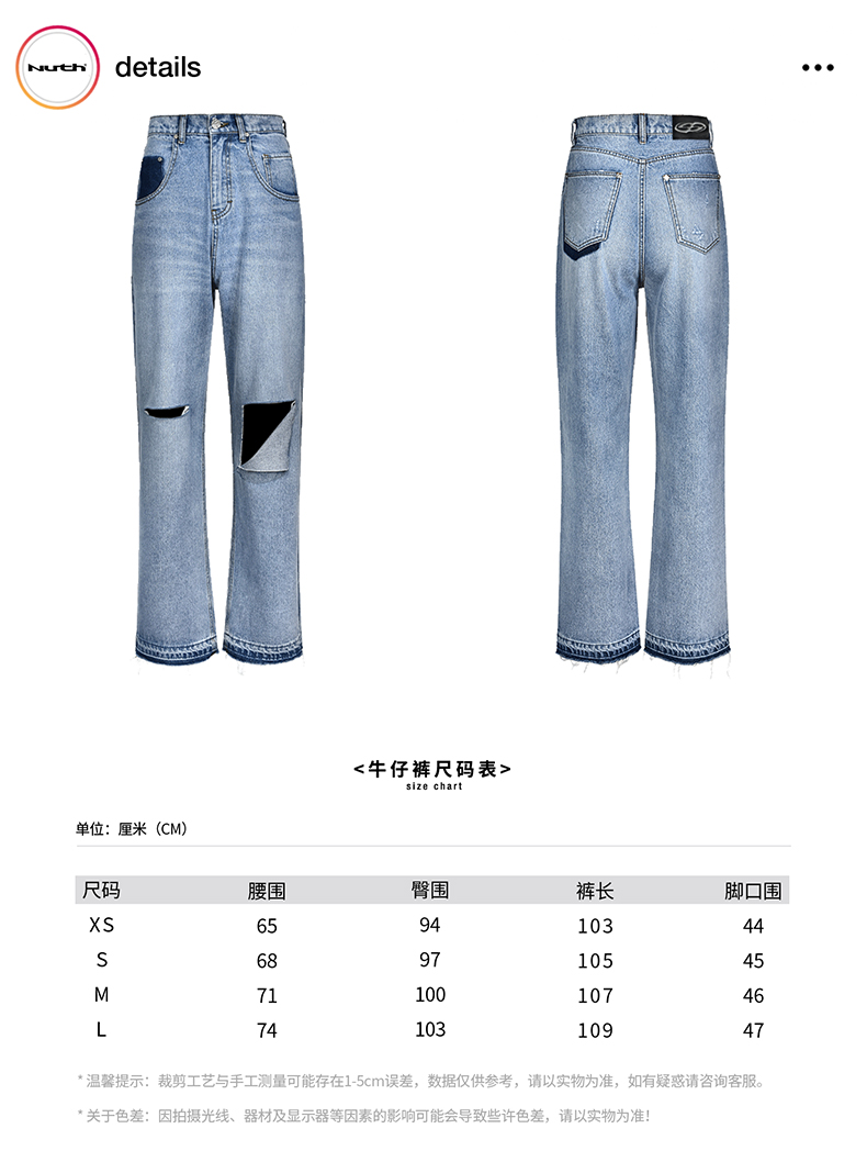 NUTH “模拟破洞”|蓝色激光印花复古做旧直筒牛仔裤