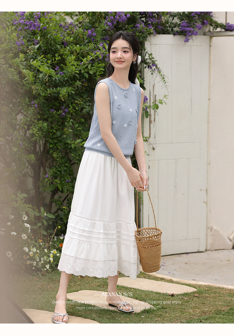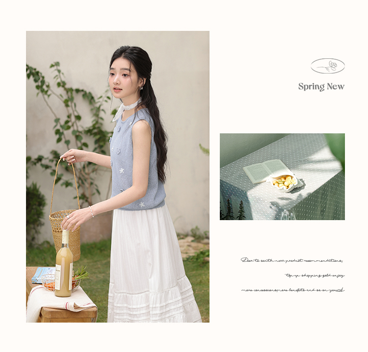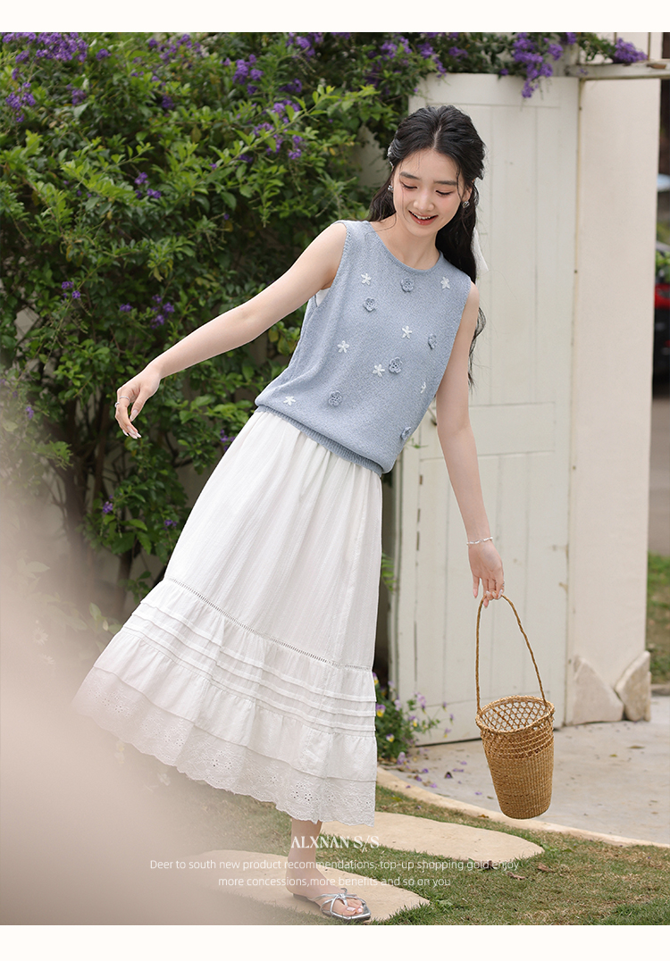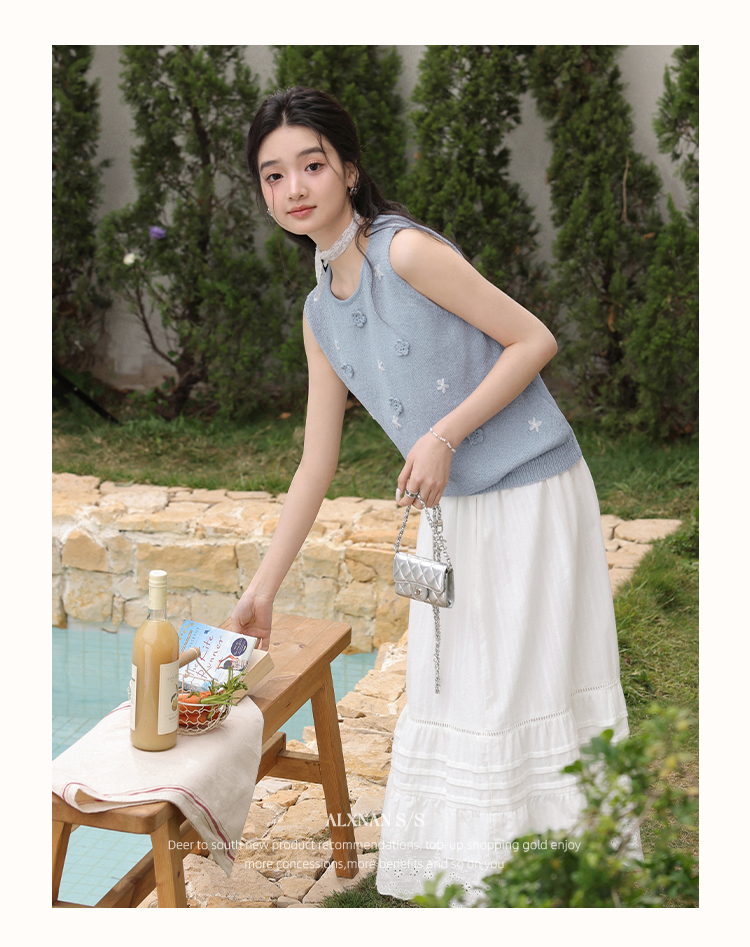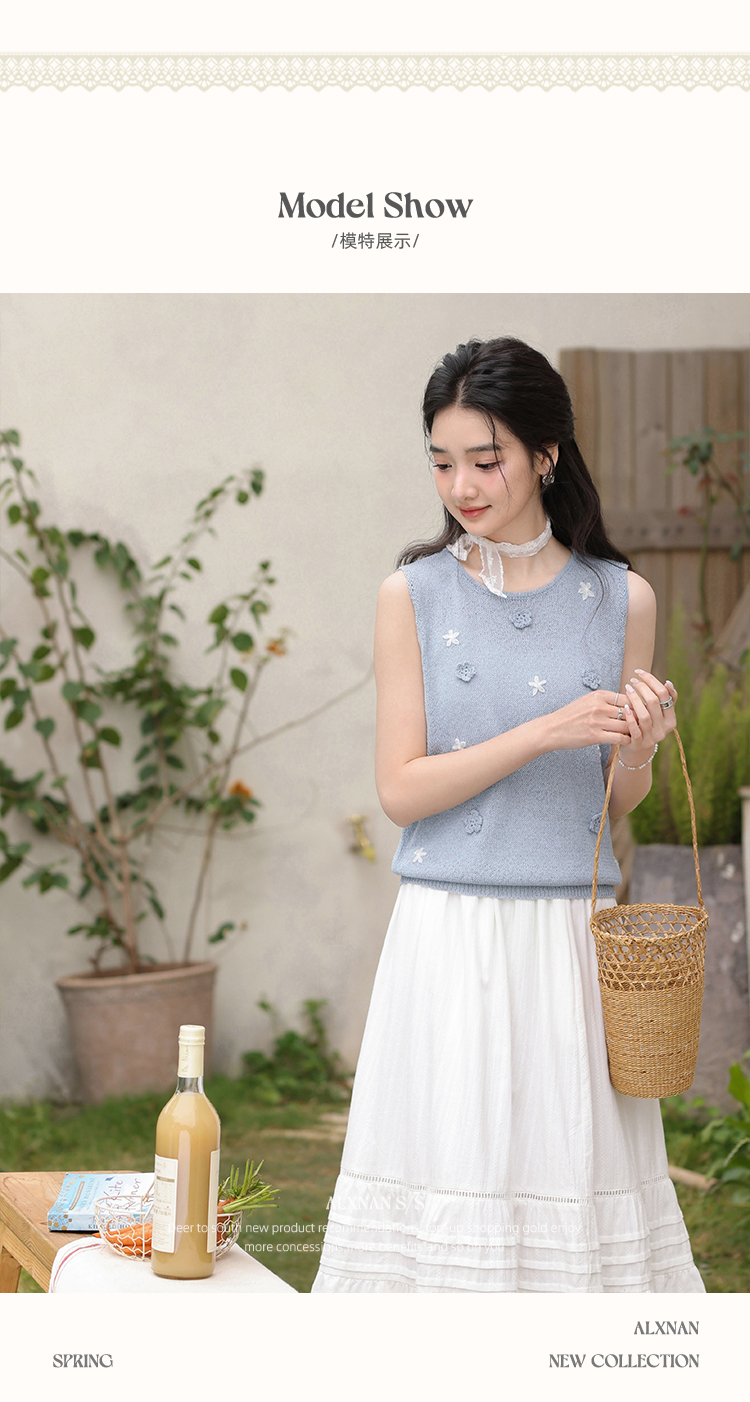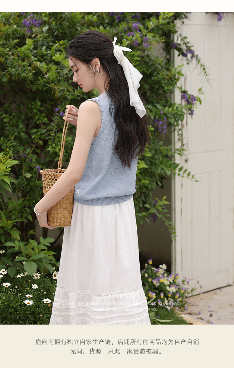 鹿向南「蝶梦蓝裳」法式优雅圆领无袖蓝色女针织衫背心2025夏新款