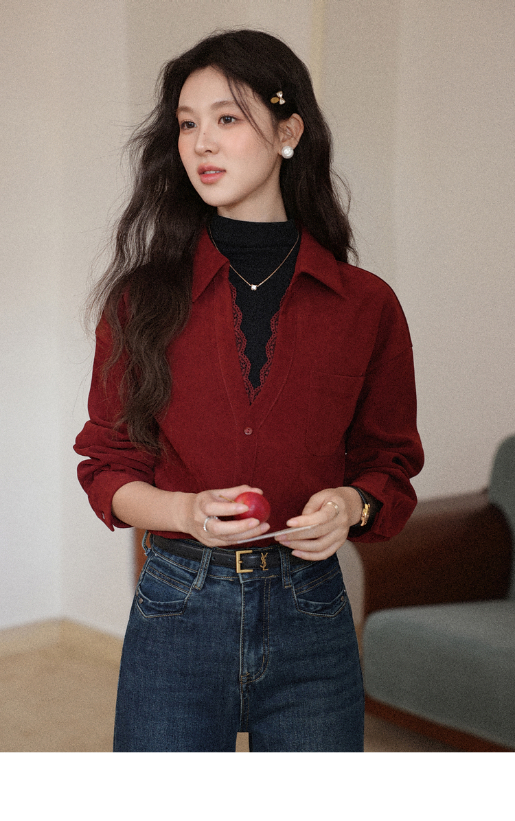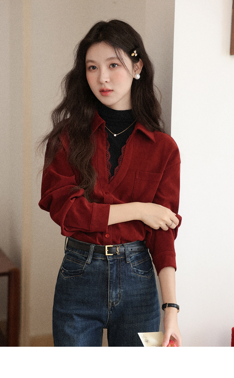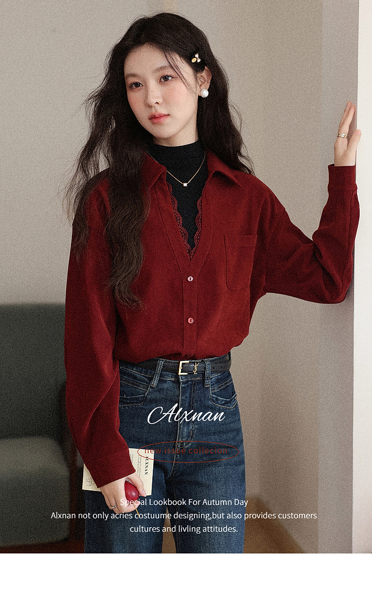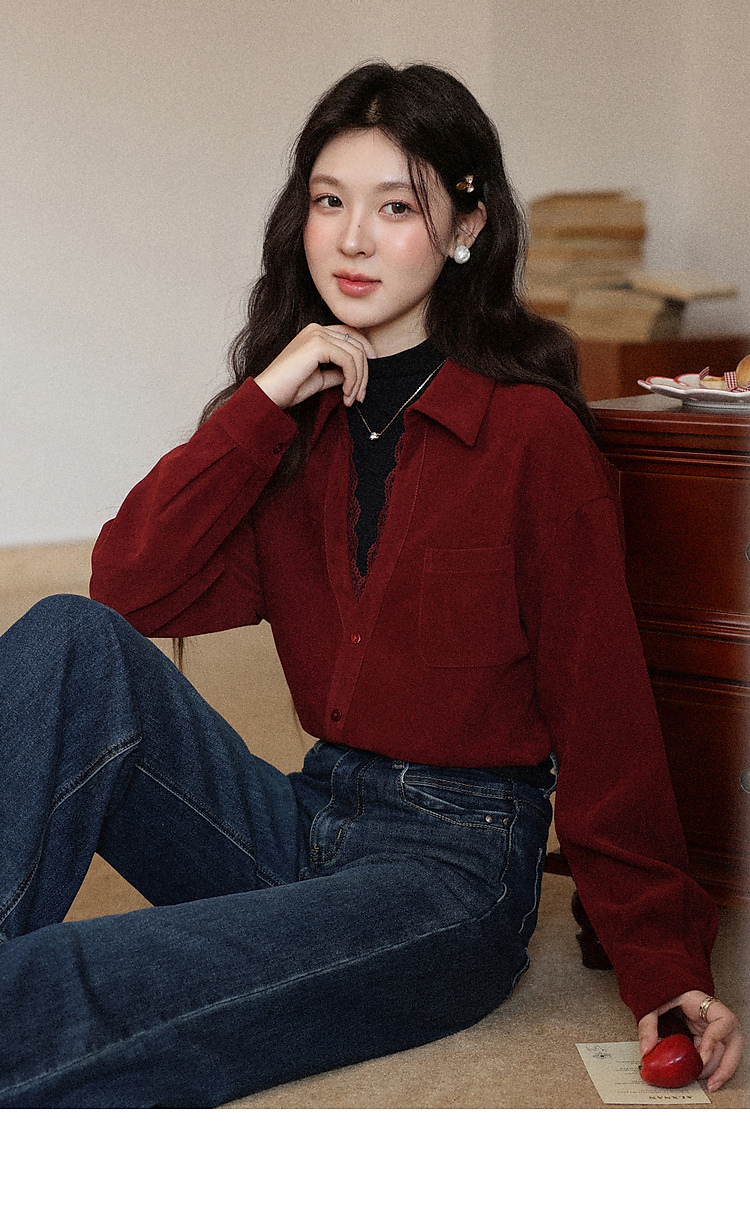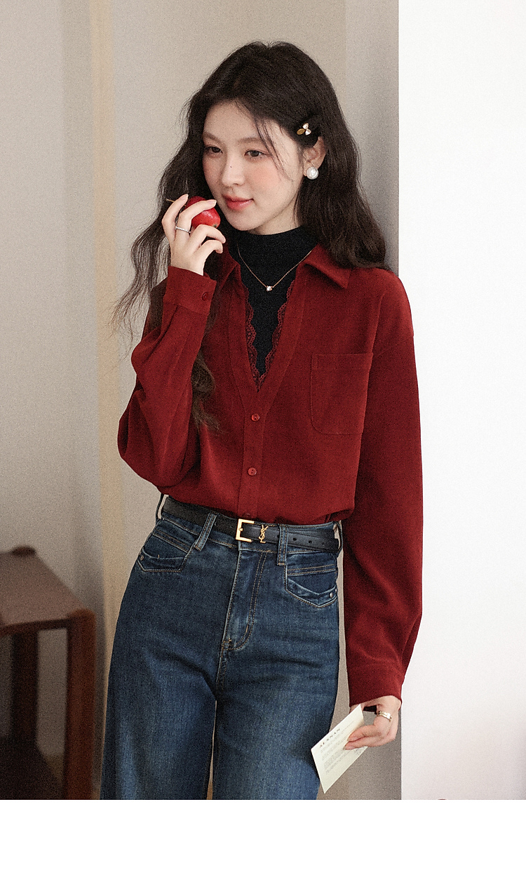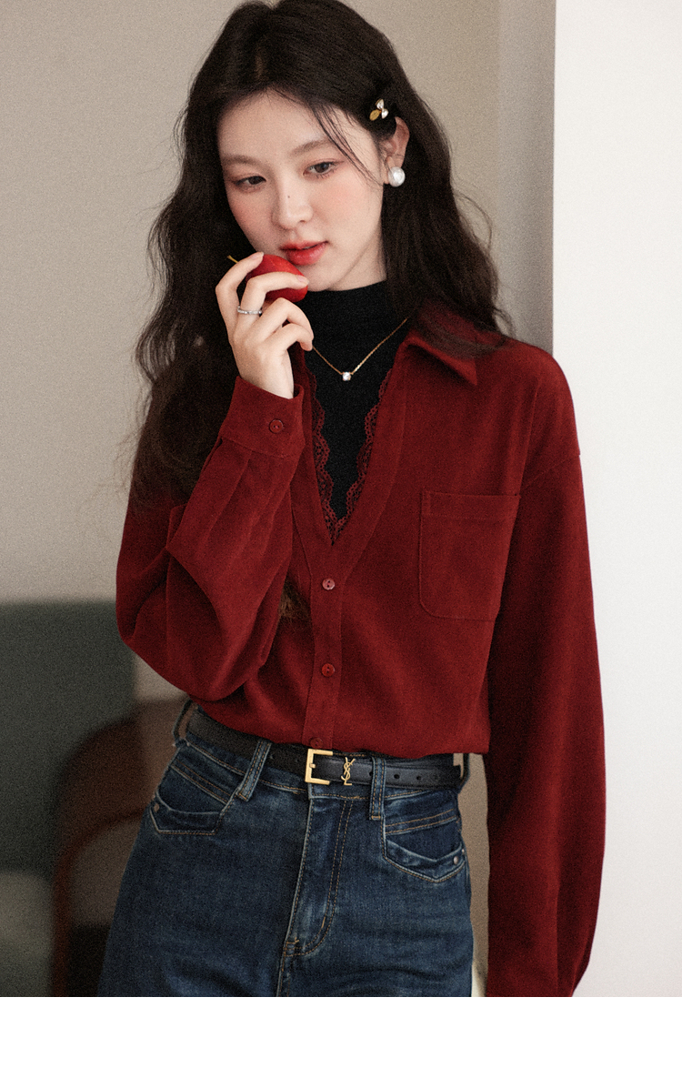 鹿向南「深赤凝光」红色翻领衬衫秋冬季蕾丝拼接气质复古风上衣女