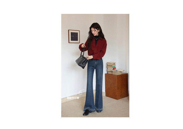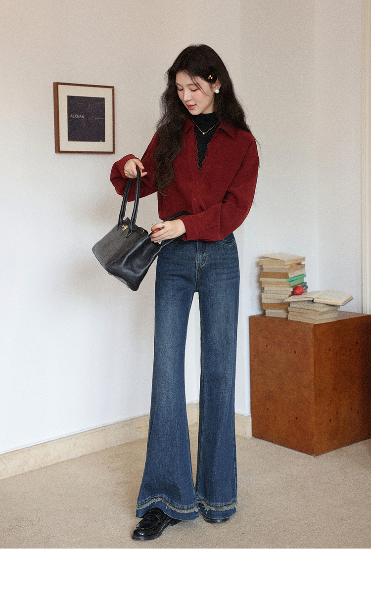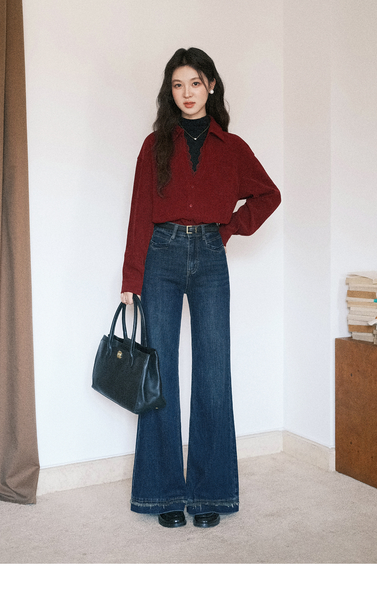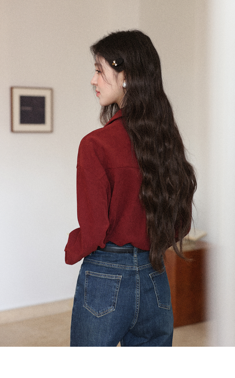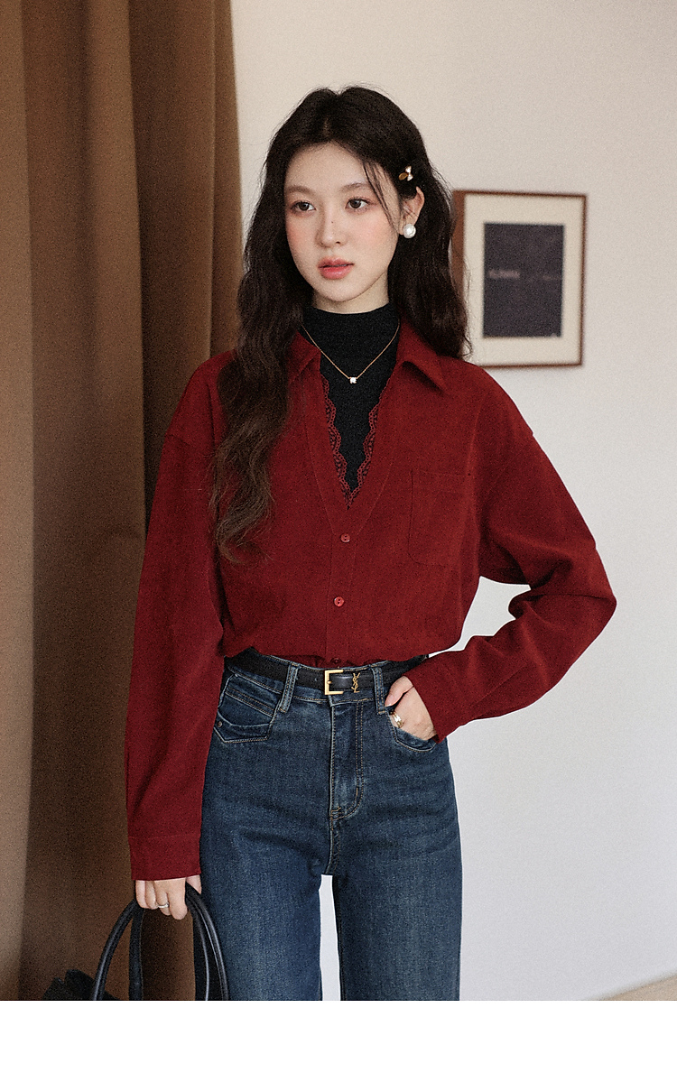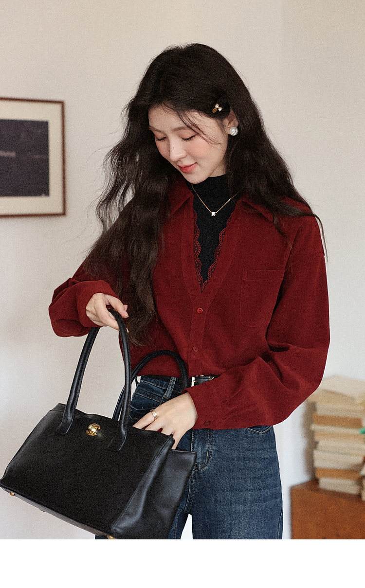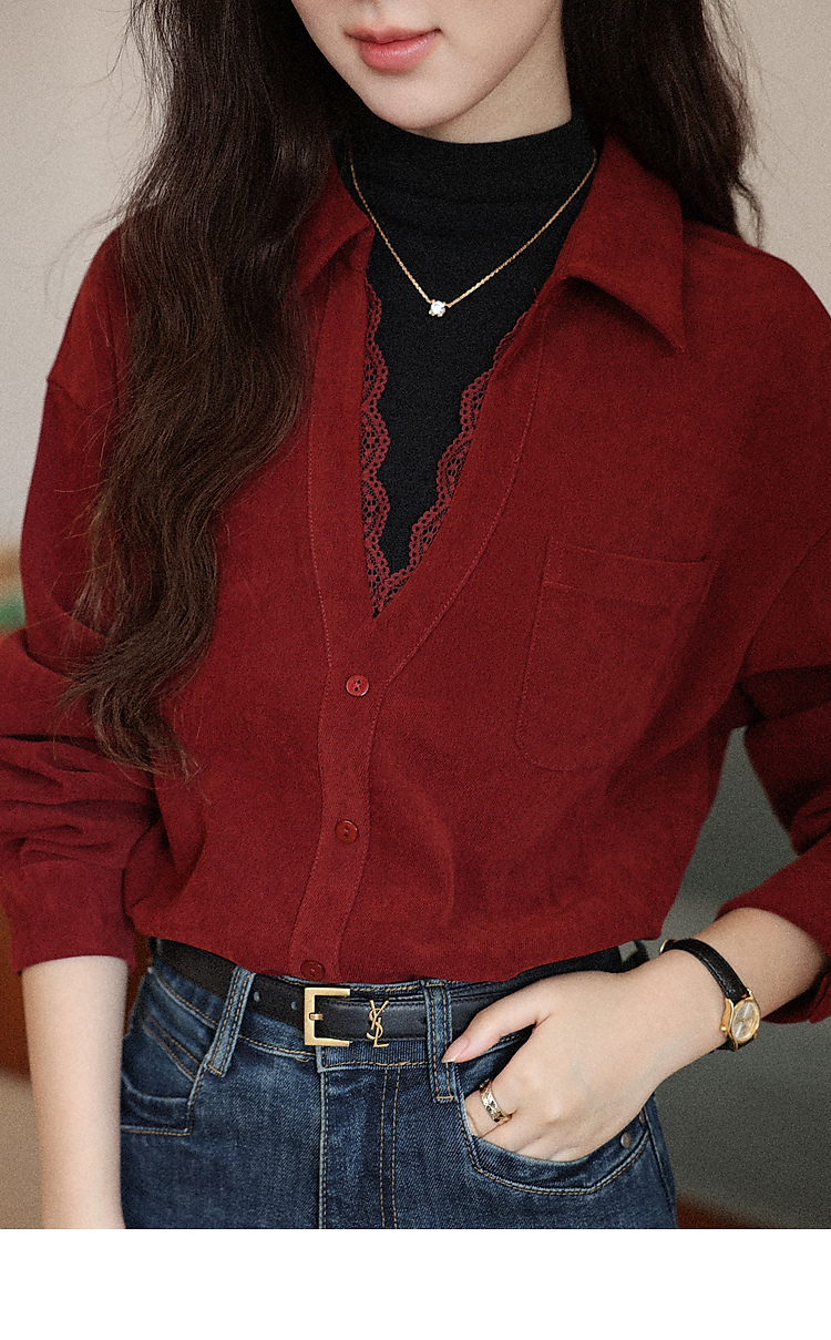 鹿向南「深赤凝光」红色翻领衬衫秋冬季蕾丝拼接气质复古风上衣女