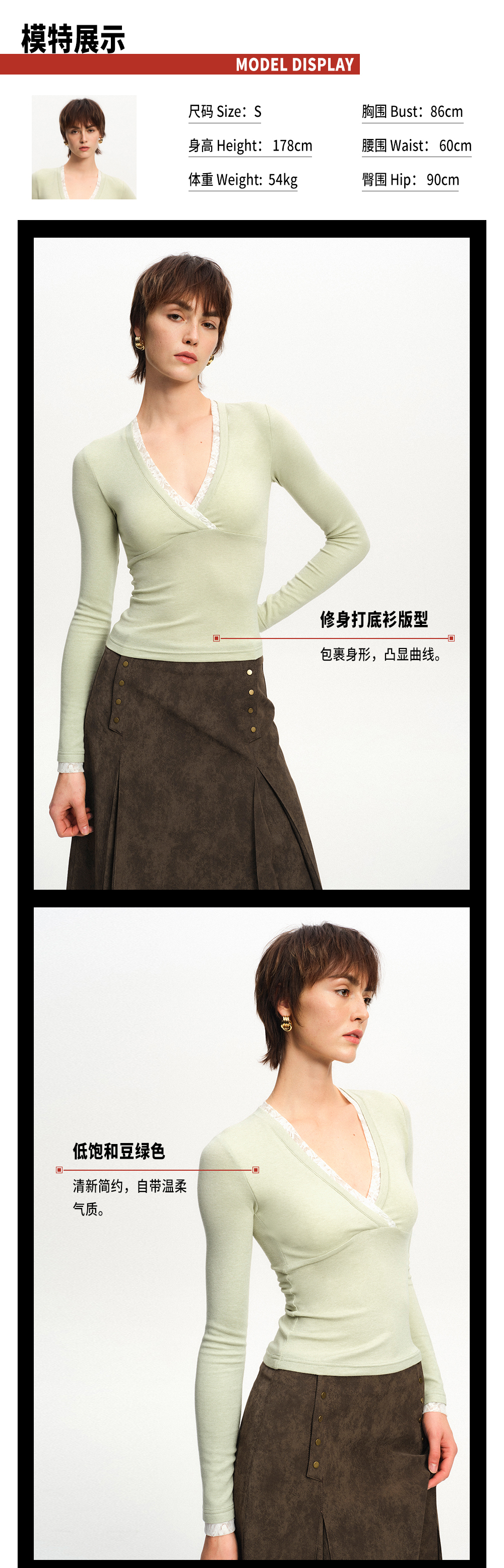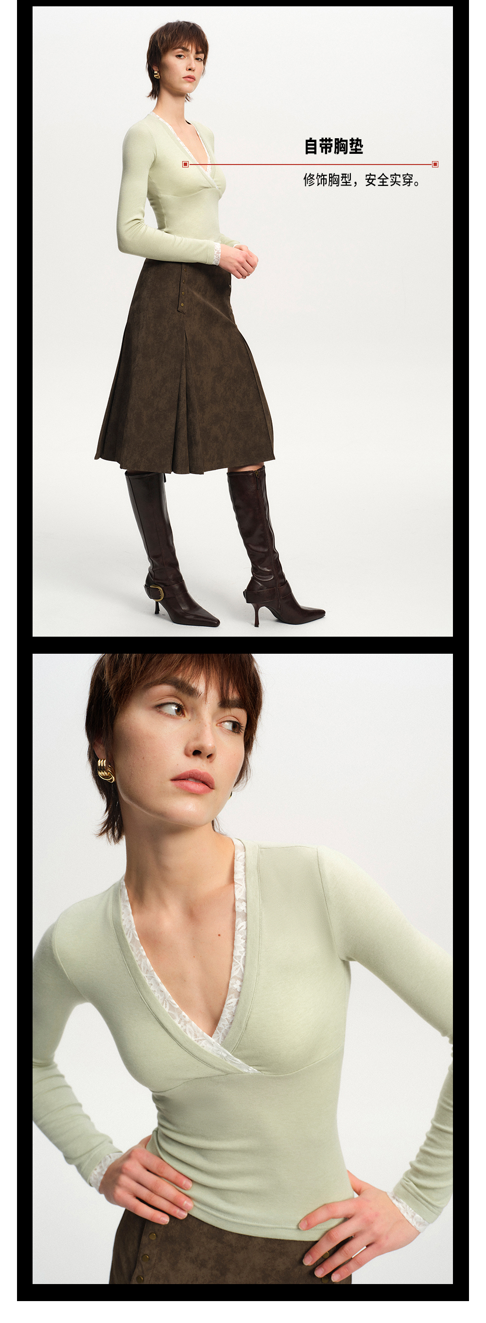 TR她热 米兰雾光 灰绿色羊毛蕾丝拼接V领带胸垫法式显瘦打底衫上衣