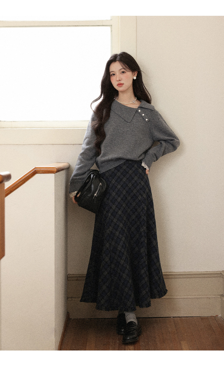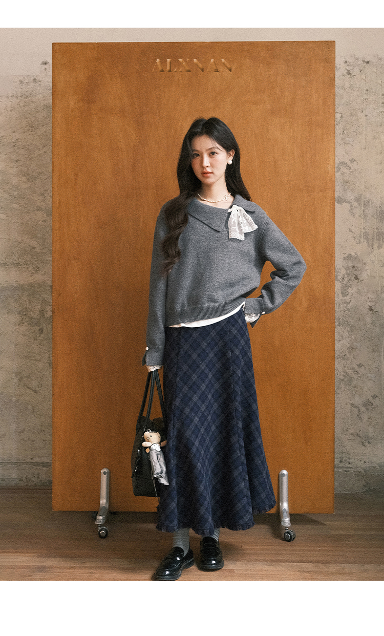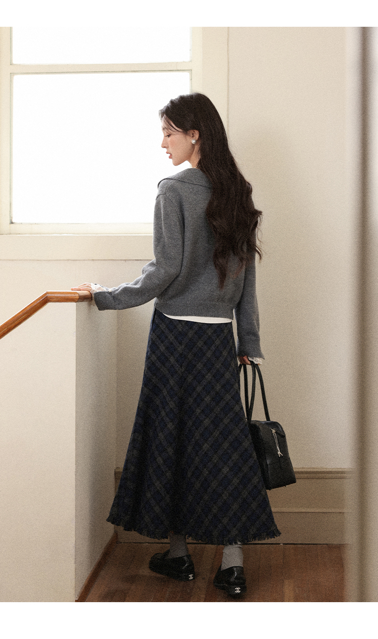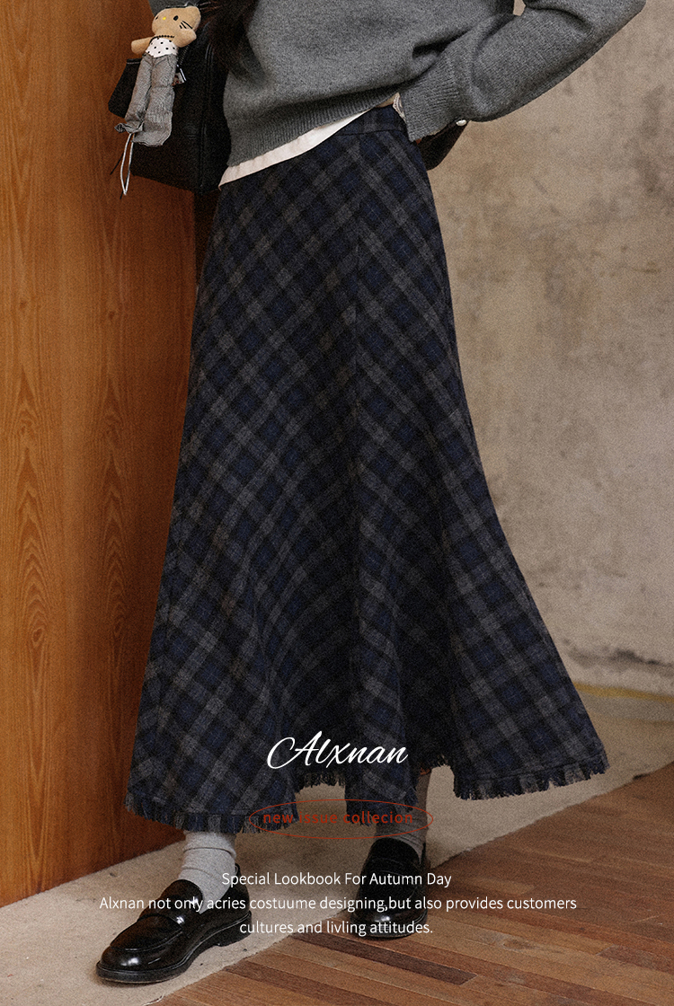 鹿向南「旧笺格痕」斜纹灰色高腰半身裙初女秋显瘦A字格纹长裙子