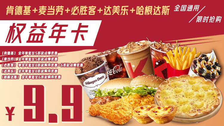 【全国通用】9.9元=麦当劳+肯德基+必胜客+达美乐+哈根达斯折扣权益年卡,一卡五项权益,承包你一年美食!