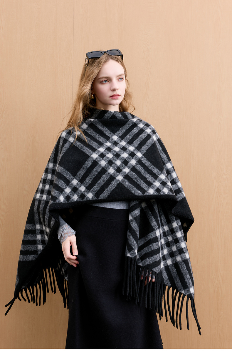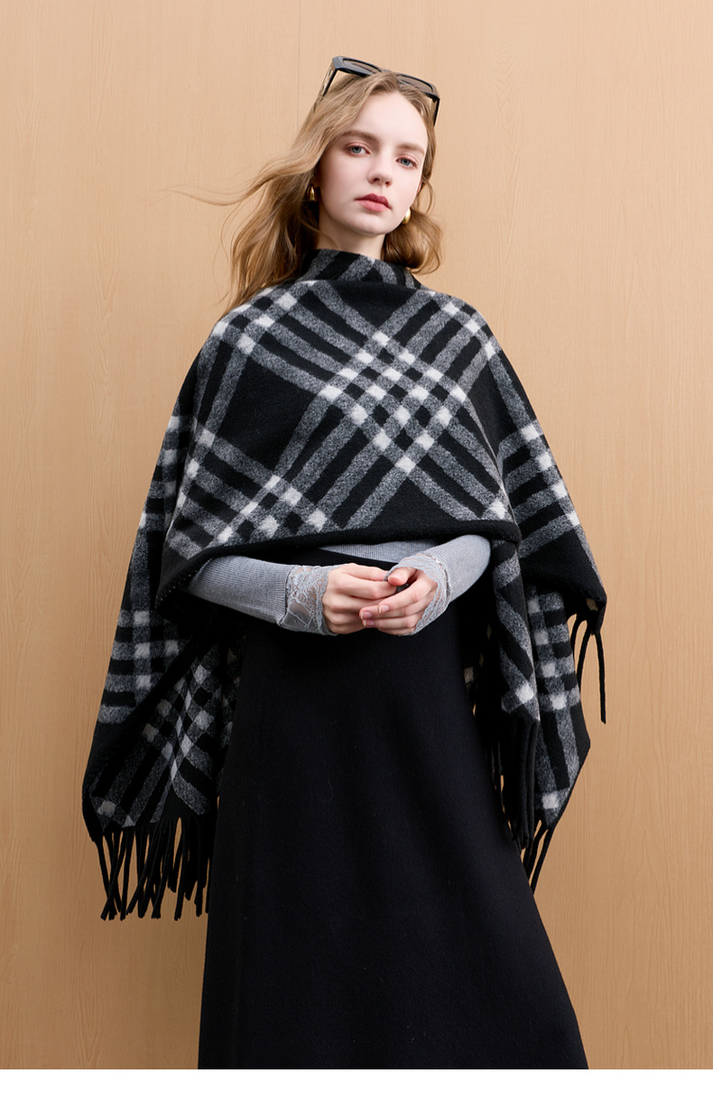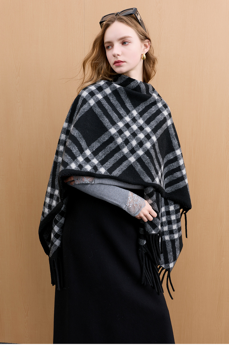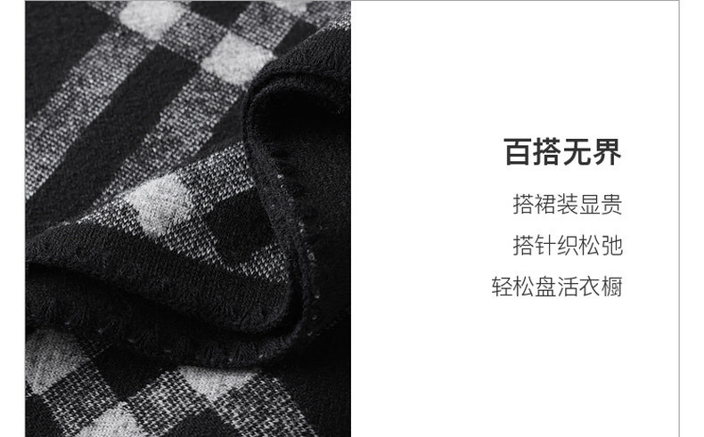 三彩2025新款经典黑白菱格纹时髦外搭复古披肩保暖流苏松弛出片