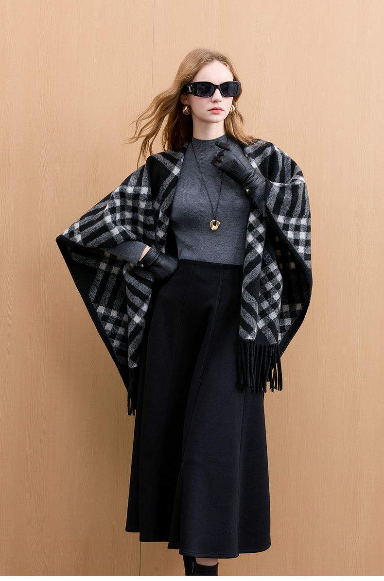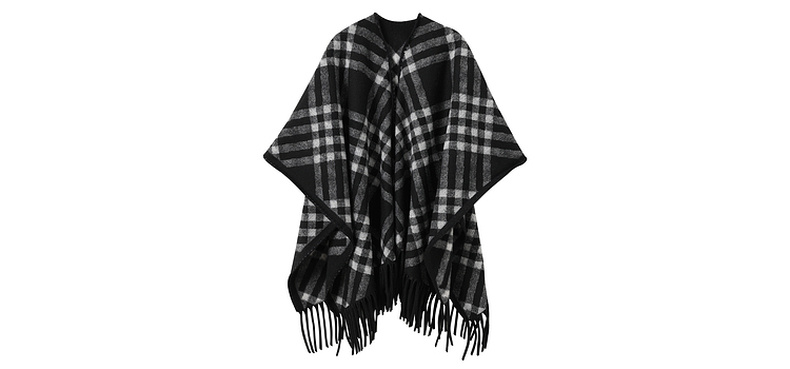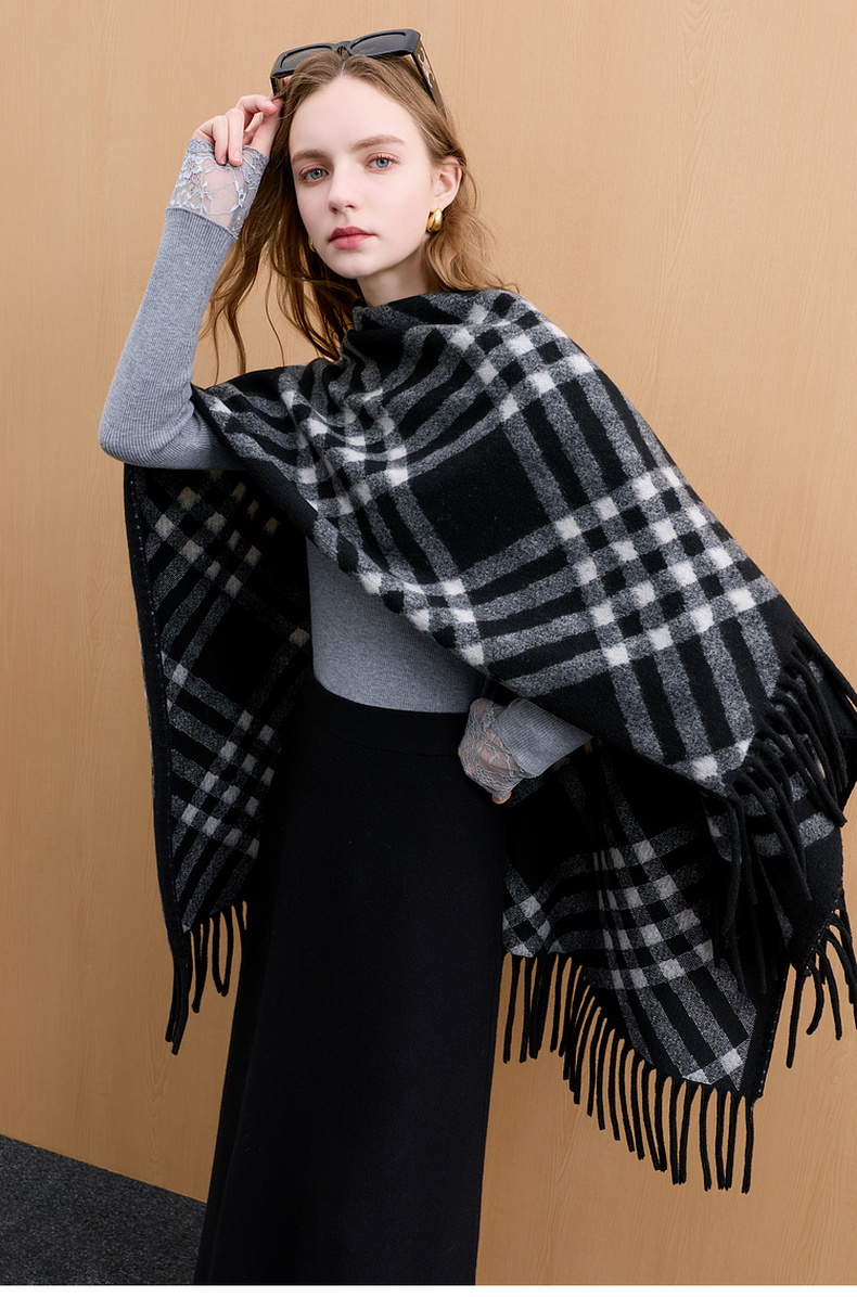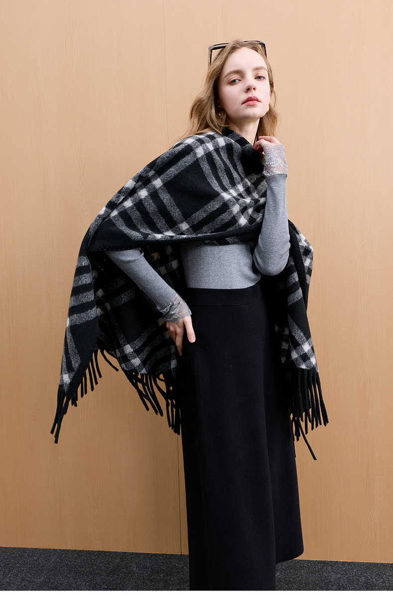 三彩2025新款经典黑白菱格纹时髦外搭复古披肩保暖流苏松弛出片