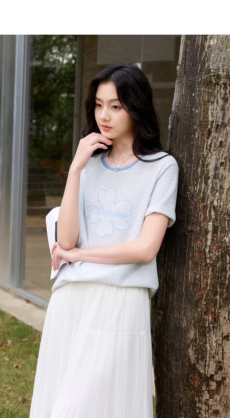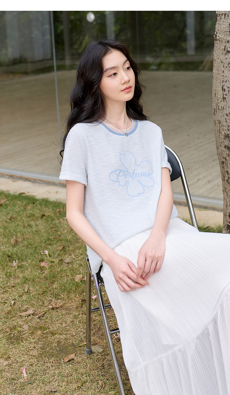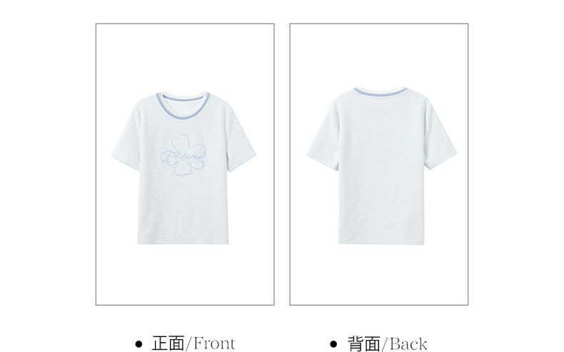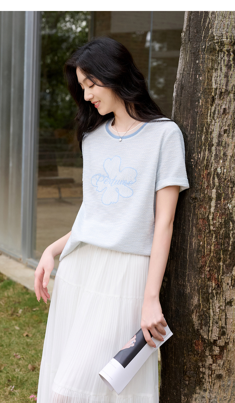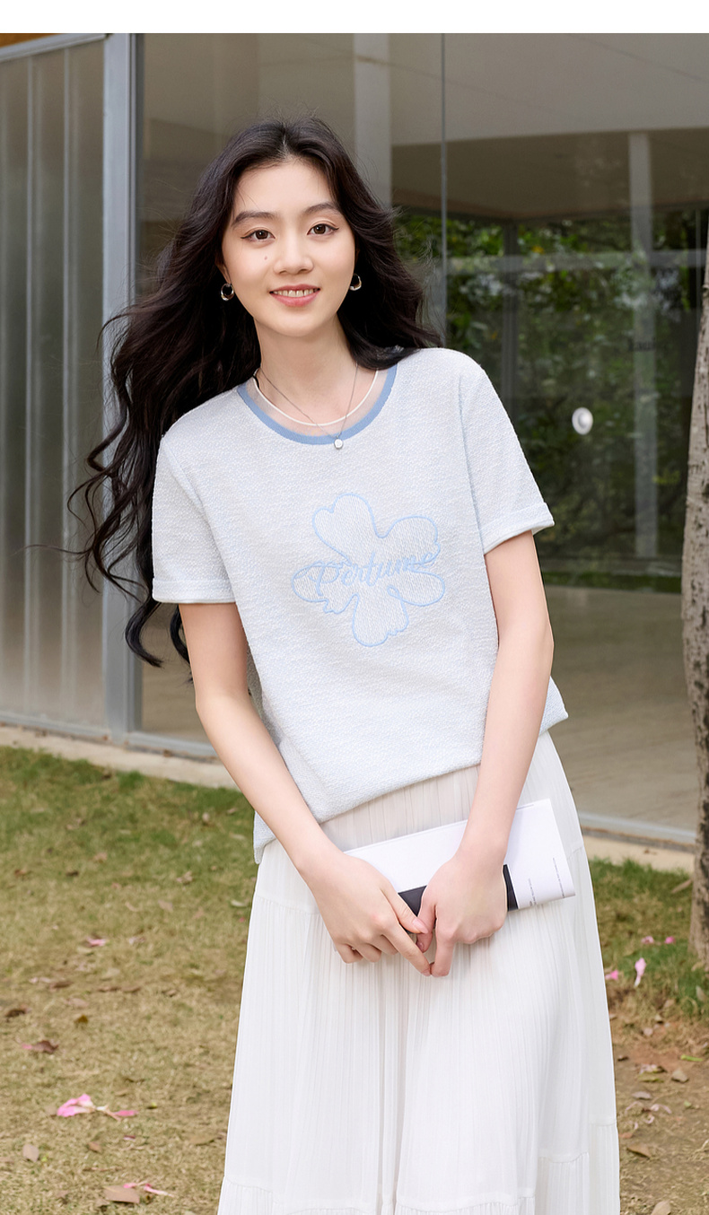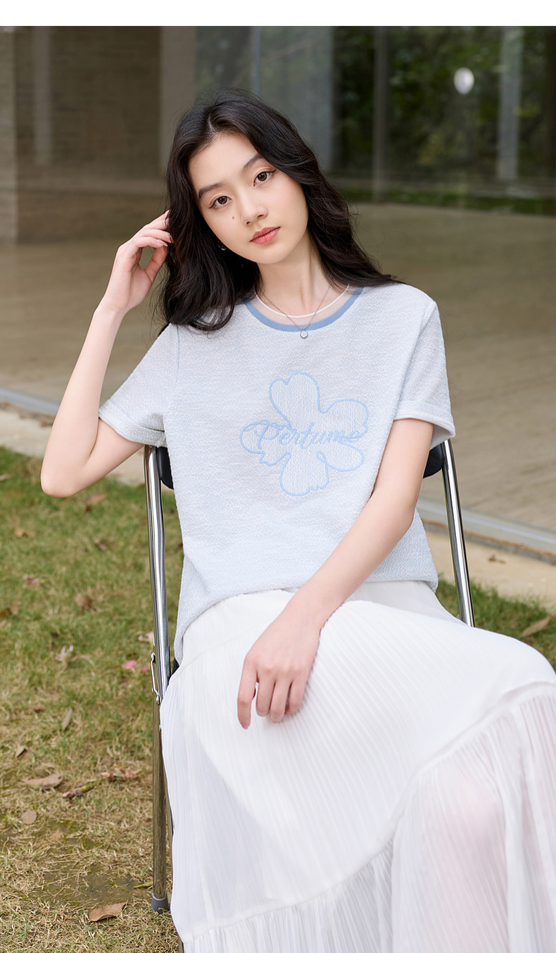 三彩2026春季新款休闲花朵字母绣花T恤套头上衣圆领正肩短袖S