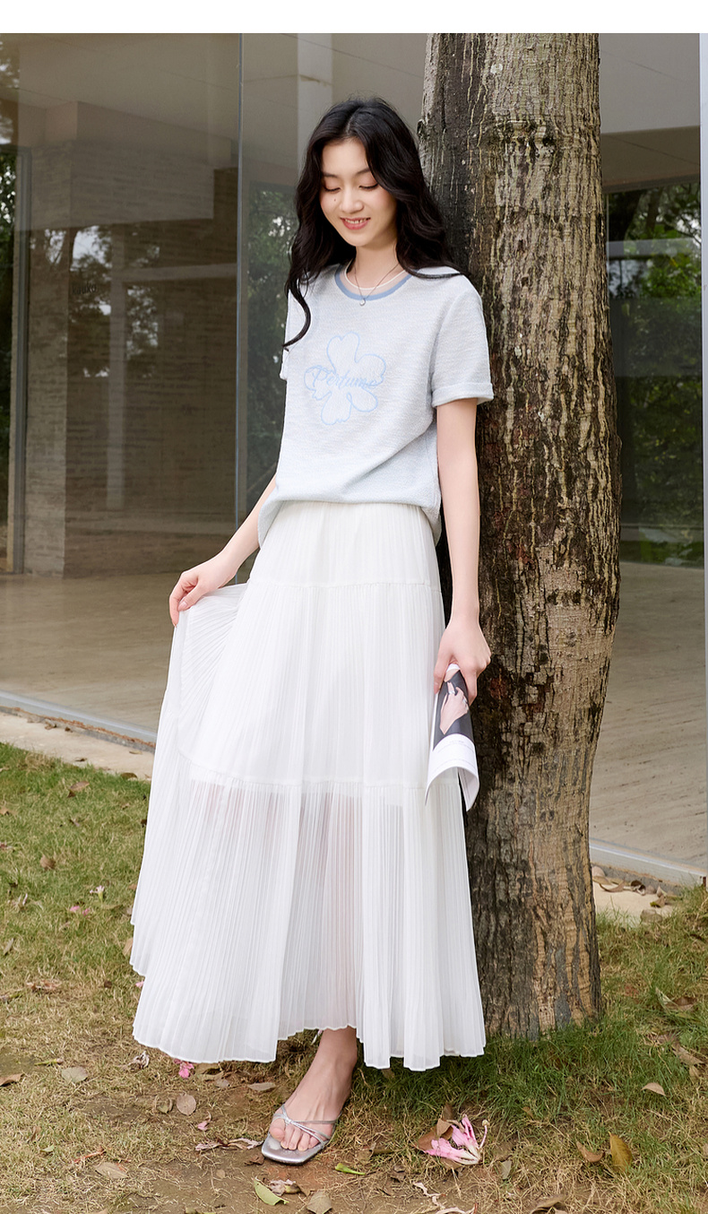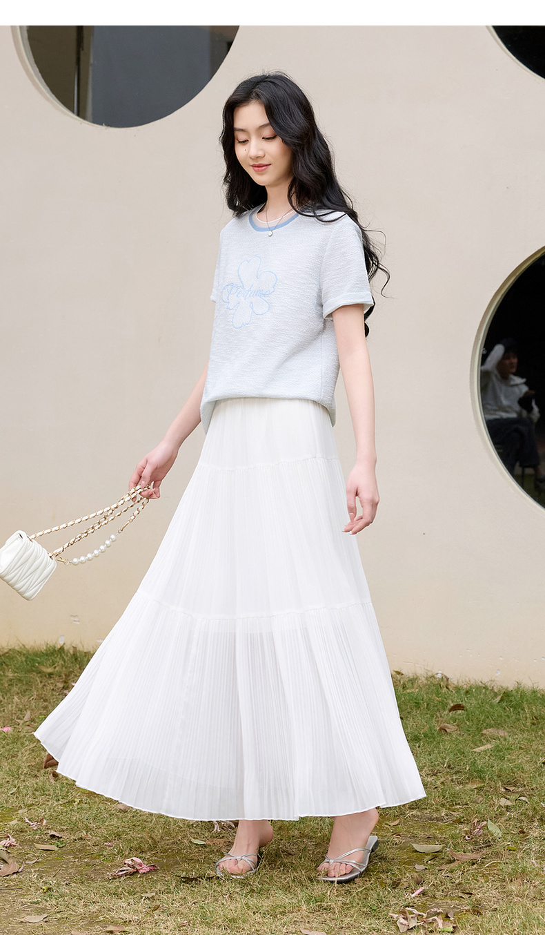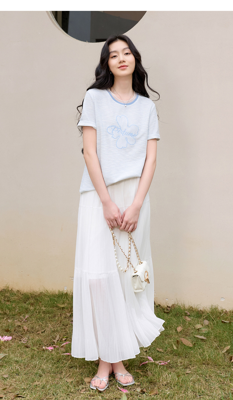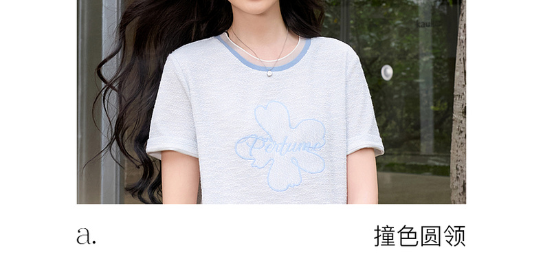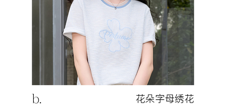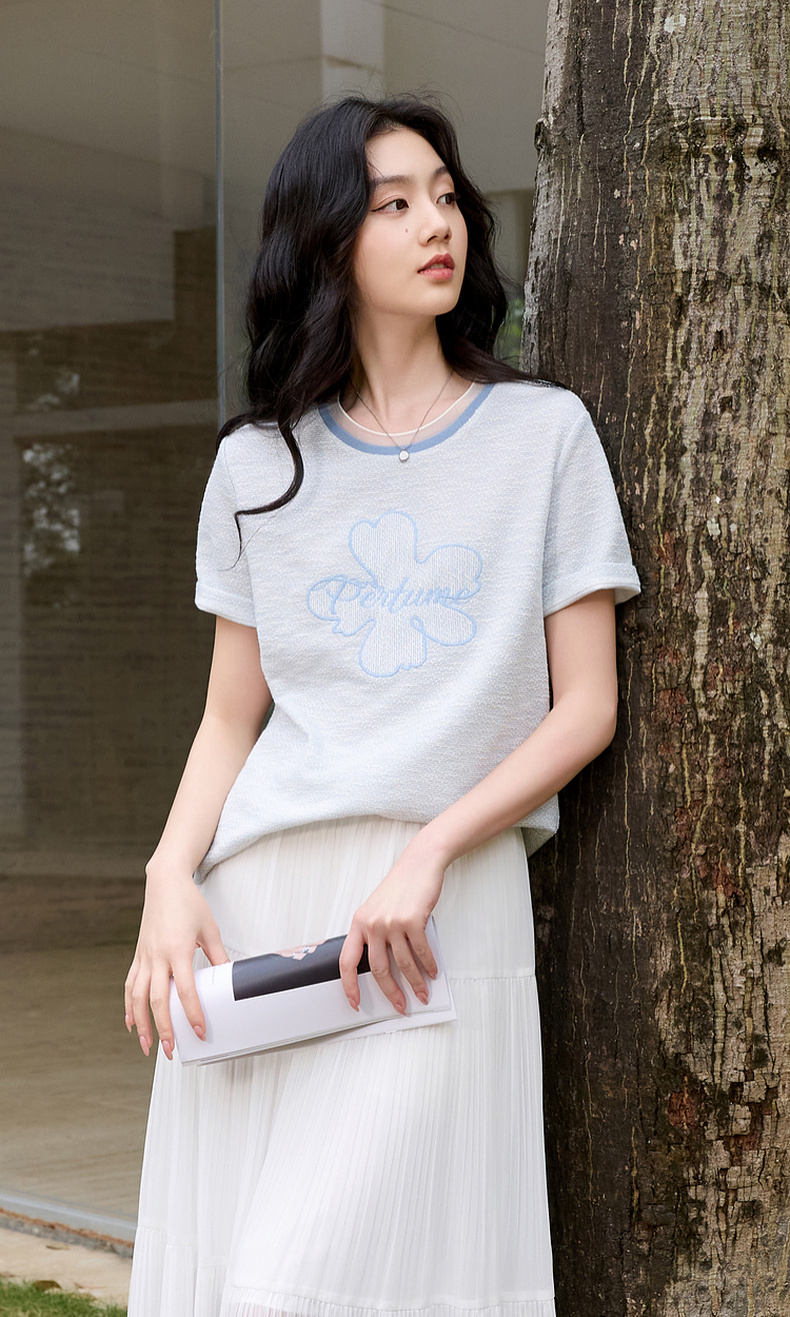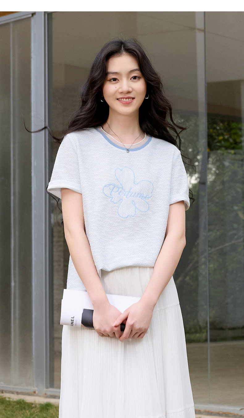 三彩2026春季新款休闲花朵字母绣花T恤套头上衣圆领正肩短袖S