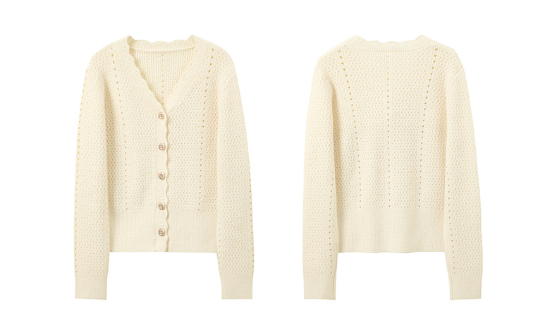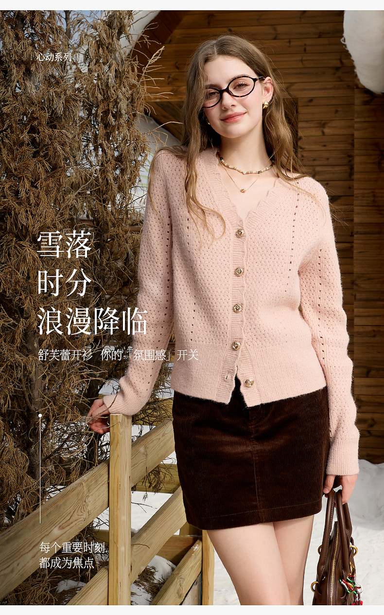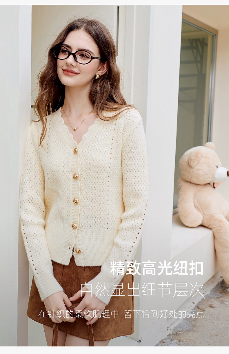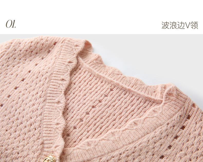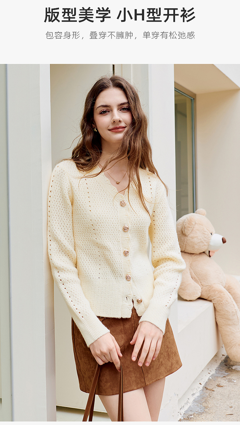三彩2026春季新款V领针织衫镂空单排扣长袖开衫外套显瘦M