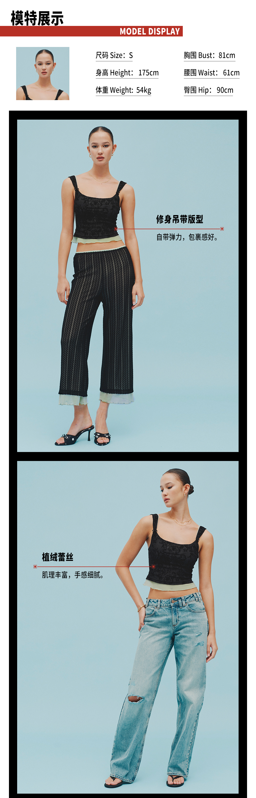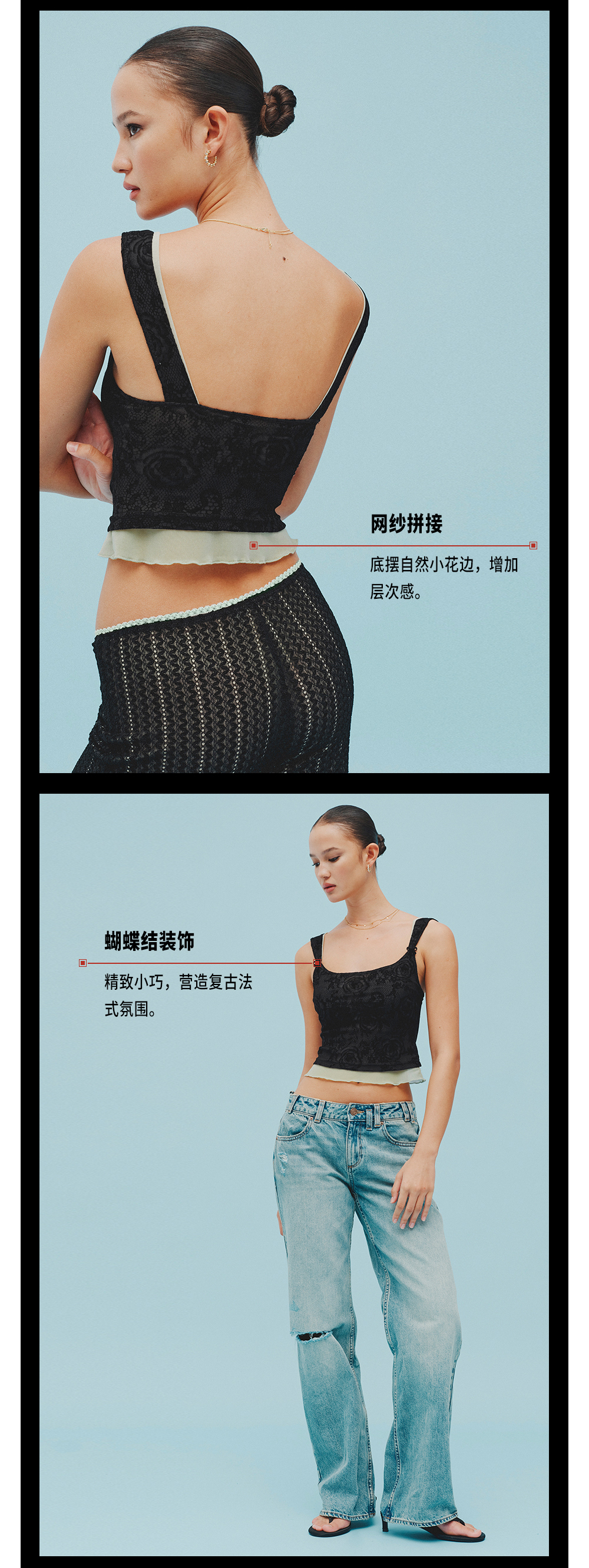TR她热 玫瑰晨露 黑色蕾丝拼接荷叶边蝴蝶结带胸垫法式优雅吊带背心 预售