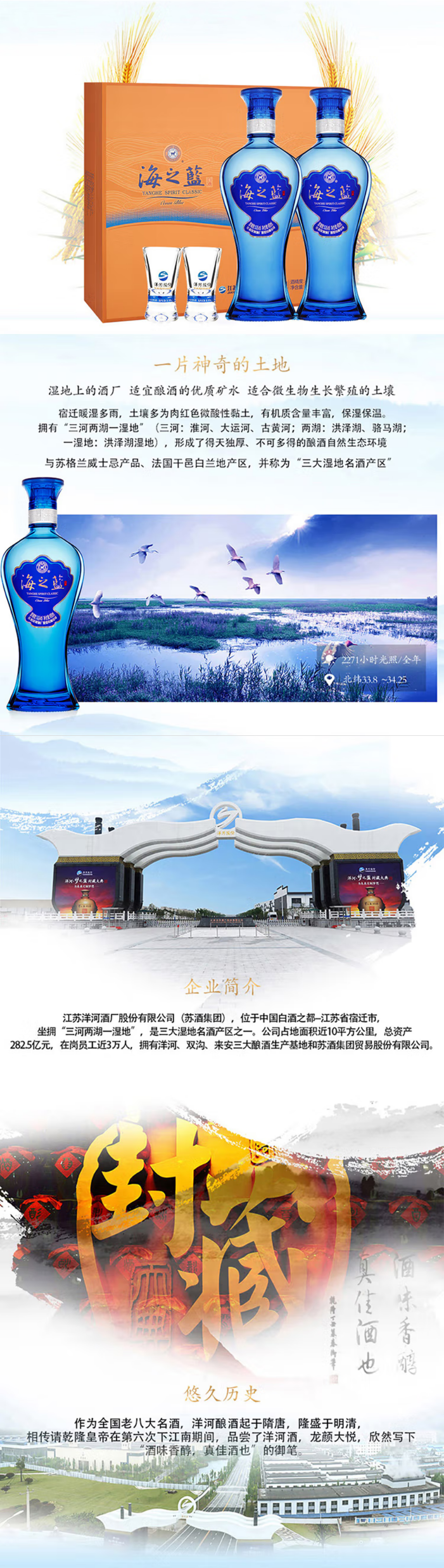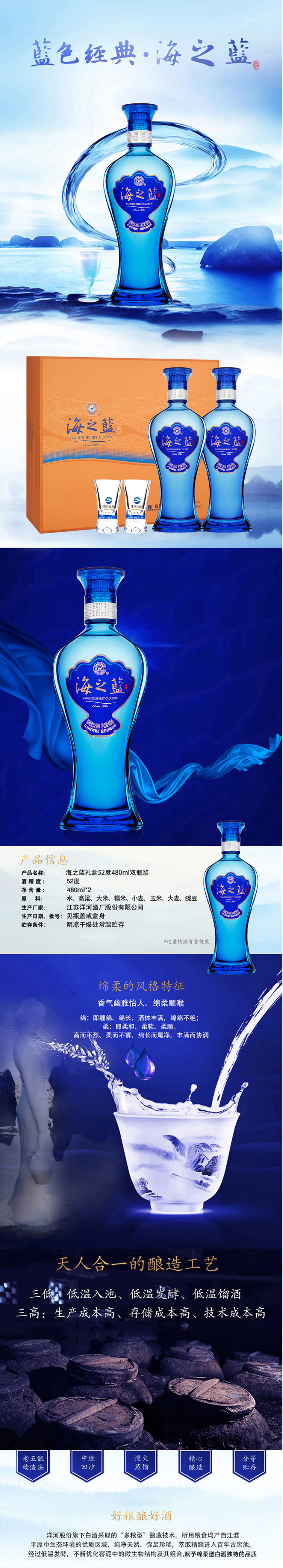 【单瓶129.5】洋河 海之蓝 浓香型白酒 52度 480ml*2瓶 礼盒装 480ml*2瓶*4盒原箱装
