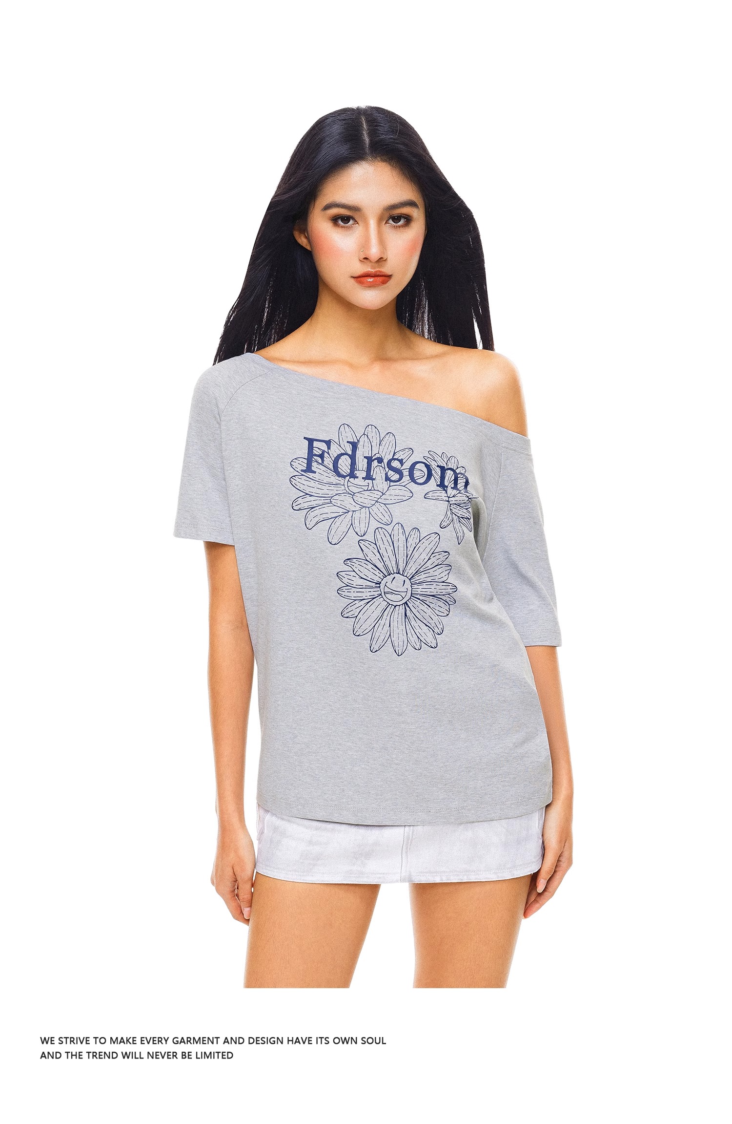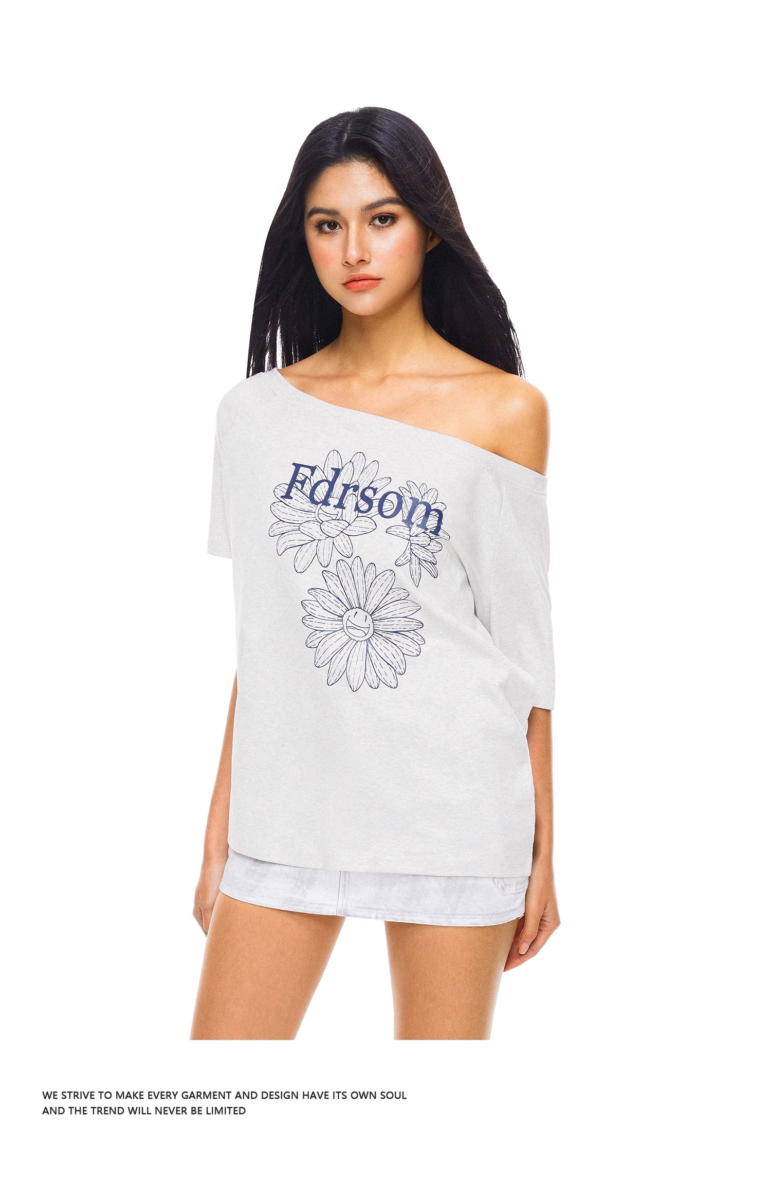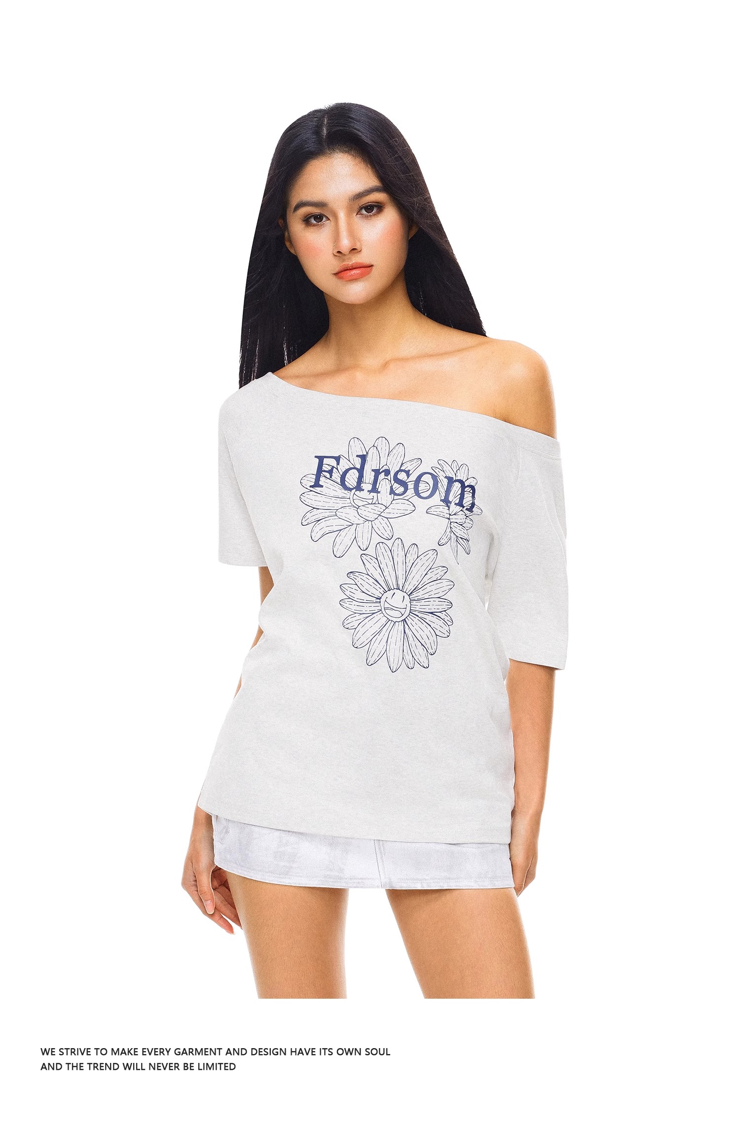 FDR官方店 线条花朵印花斜肩短袖T恤女夏季辣妹露肩体恤上衣