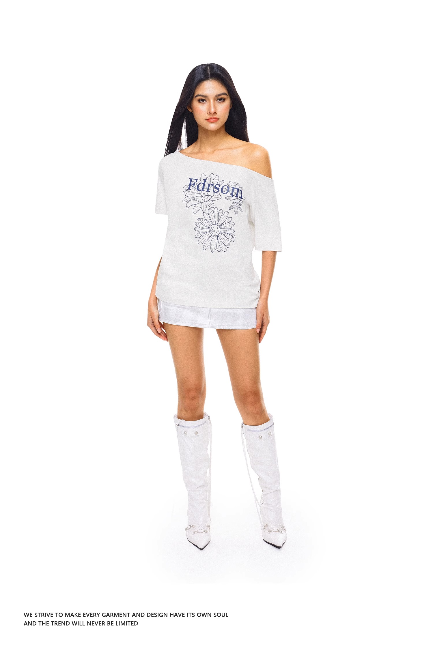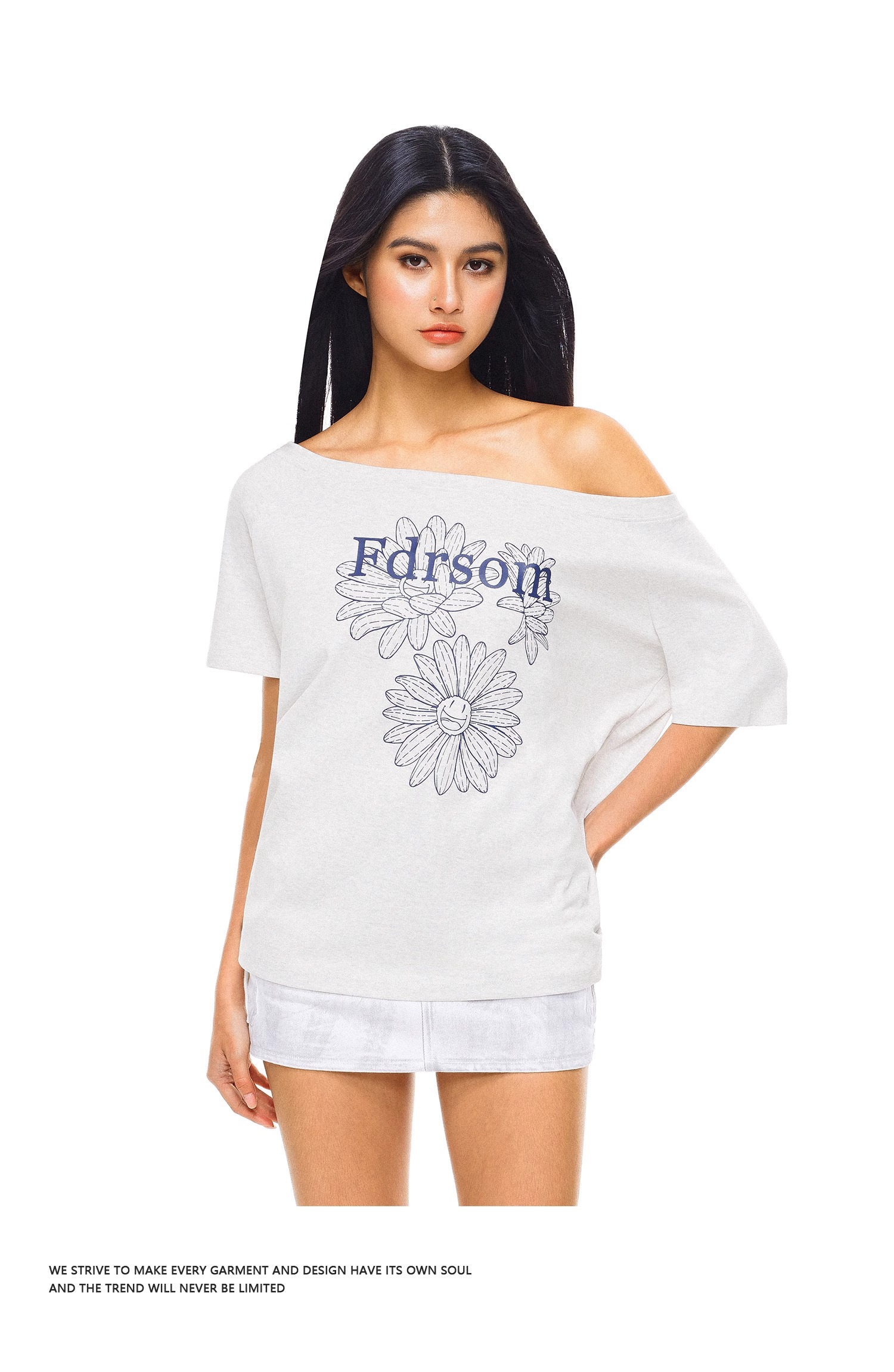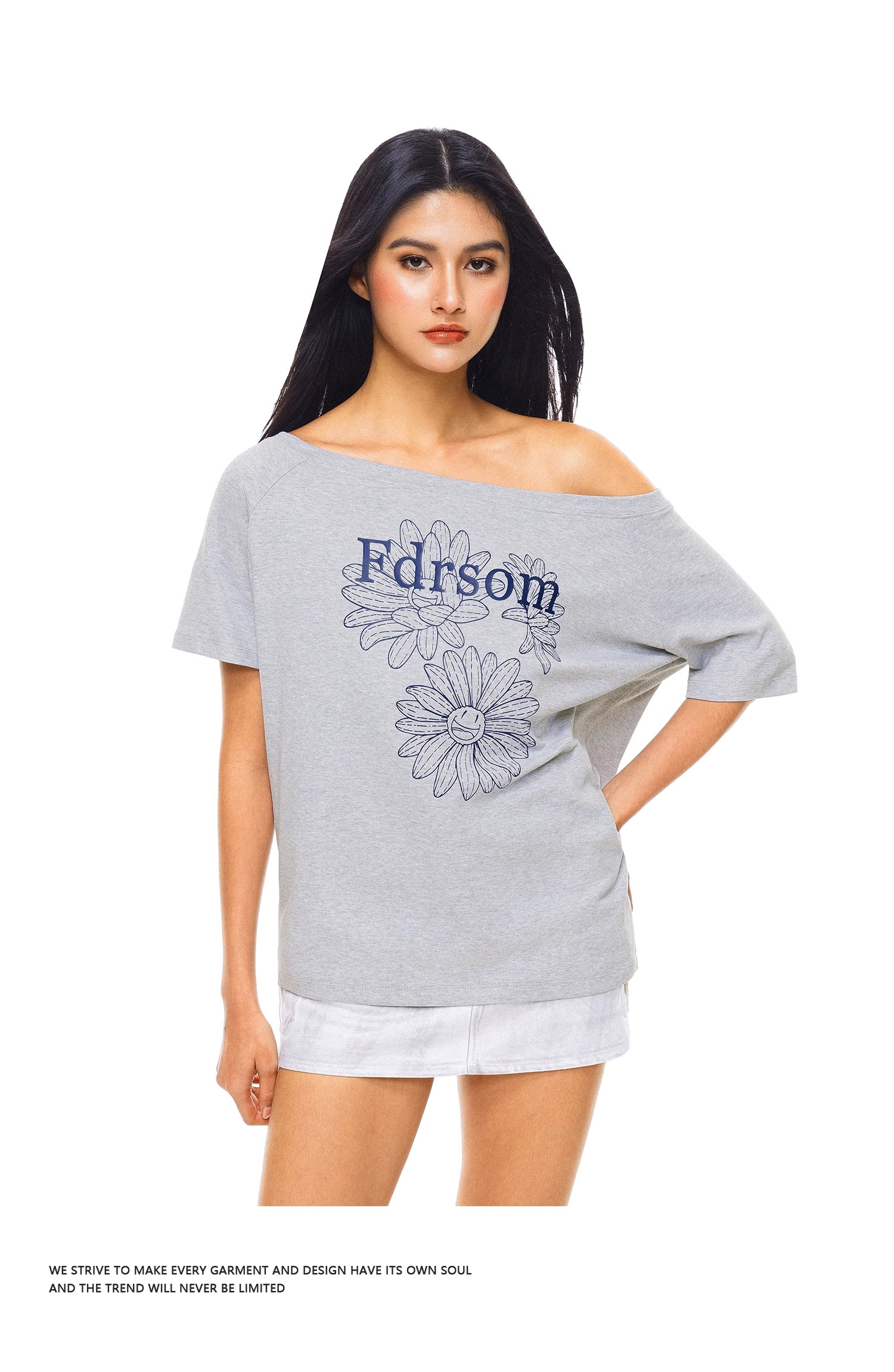 FDR官方店 线条花朵印花斜肩短袖T恤女夏季辣妹露肩体恤上衣