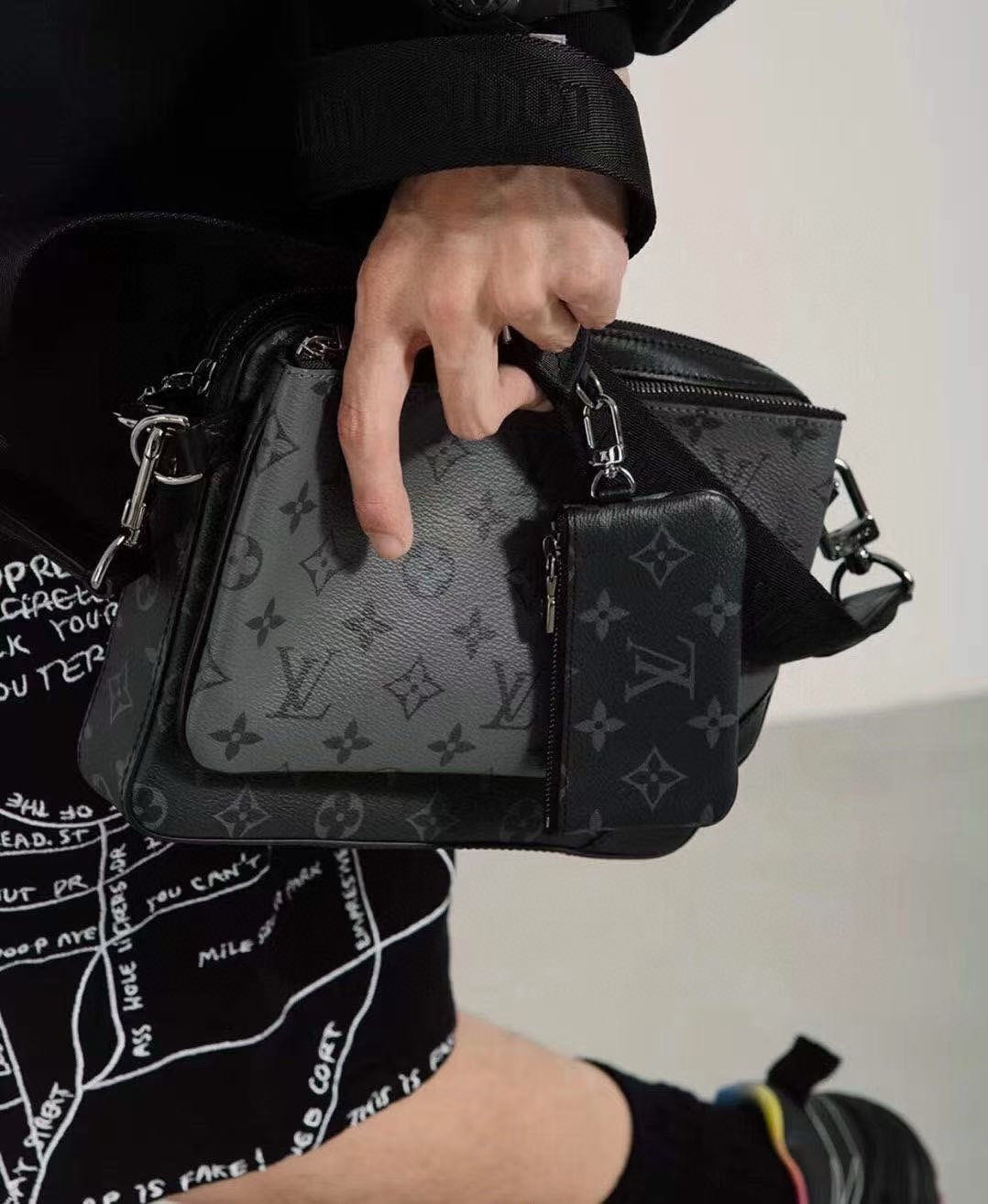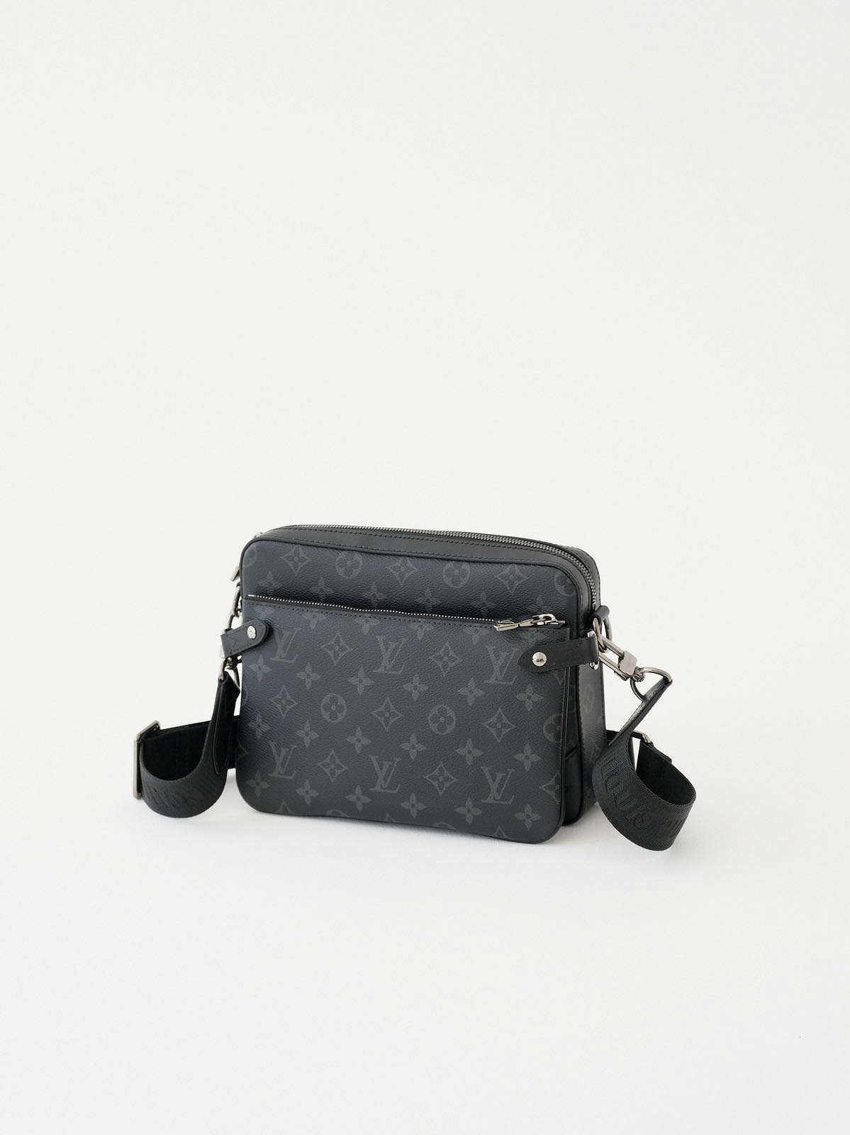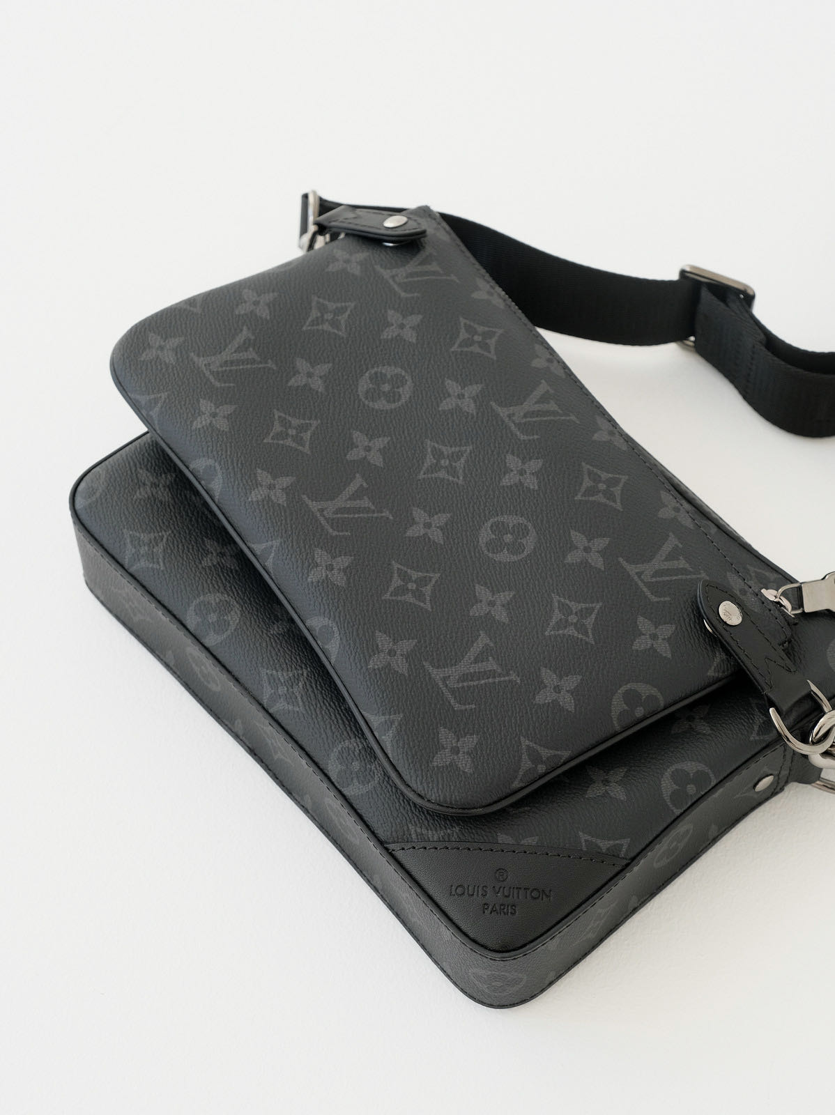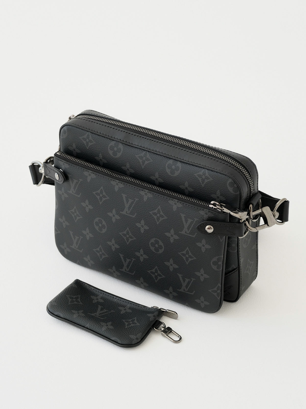 Trio 邮差包由 Monogram Eclipse帆布与 Monogram Eclipse Reverse帆布制成。标志性的同色调图案凸显此多功能拼搭设计品的线条。除具备传统斜跨手袋的功能外,另配可脱卸拉链袋和附于包带上的零钱包。
