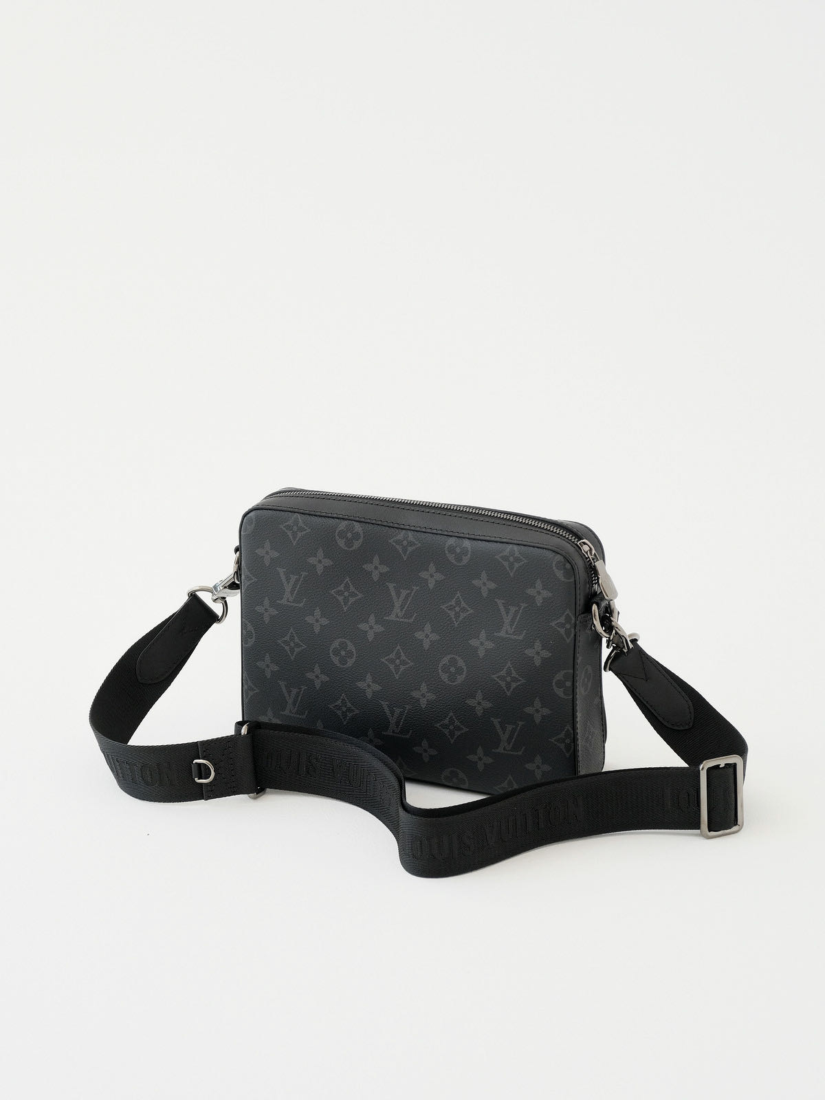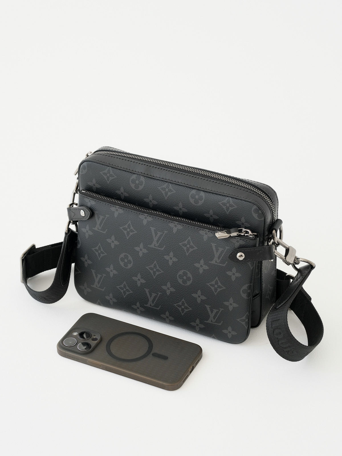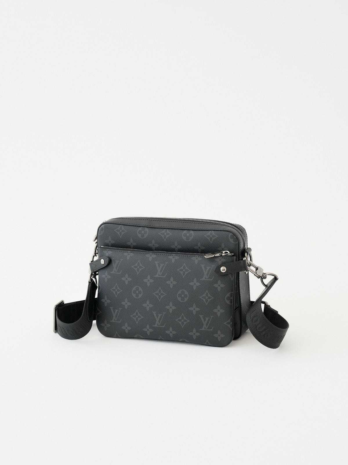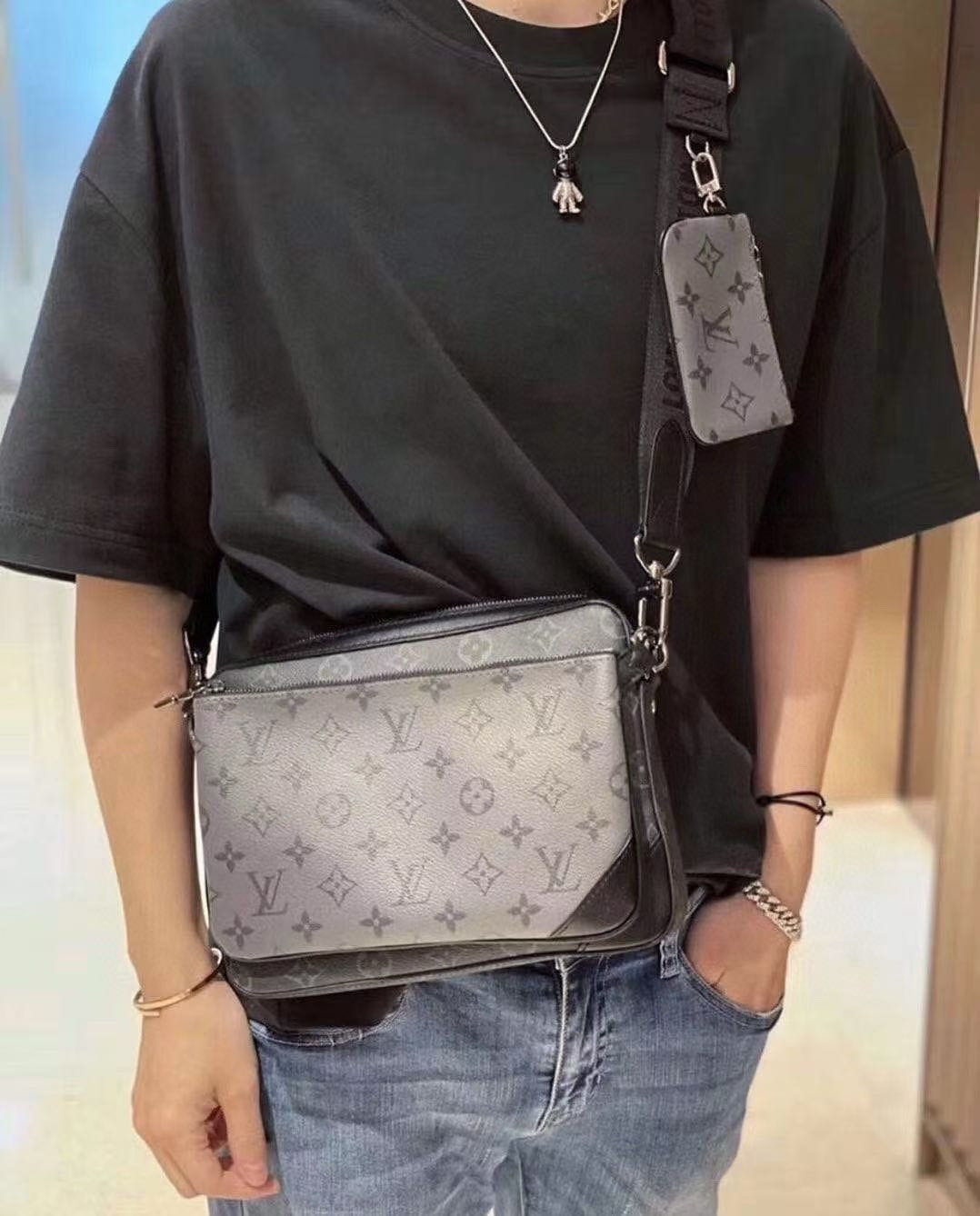 Trio 邮差包由 Monogram Eclipse帆布与 Monogram Eclipse Reverse帆布制成。标志性的同色调图案凸显此多功能拼搭设计品的线条。除具备传统斜跨手袋的功能外,另配可脱卸拉链袋和附于包带上的零钱包。