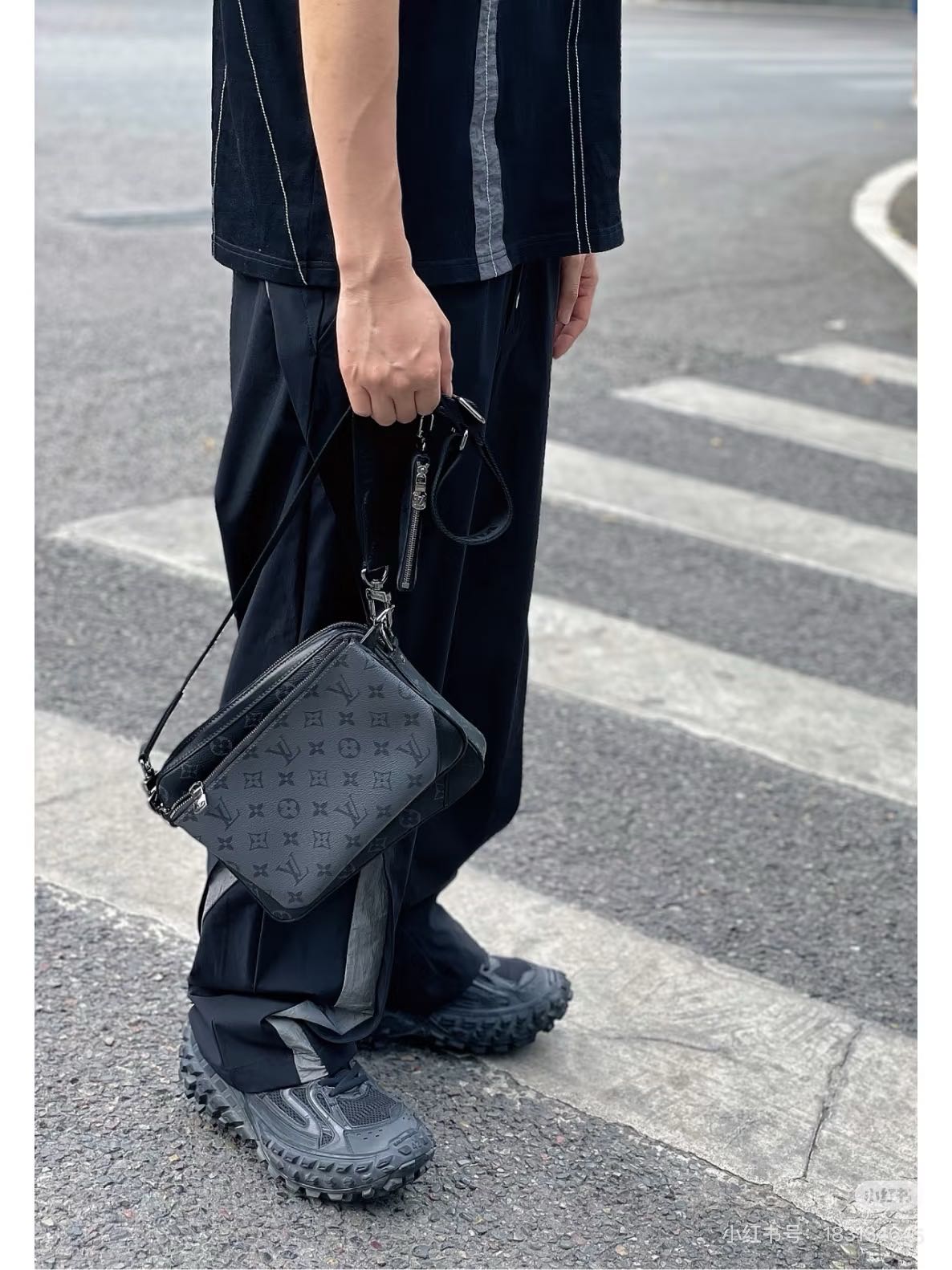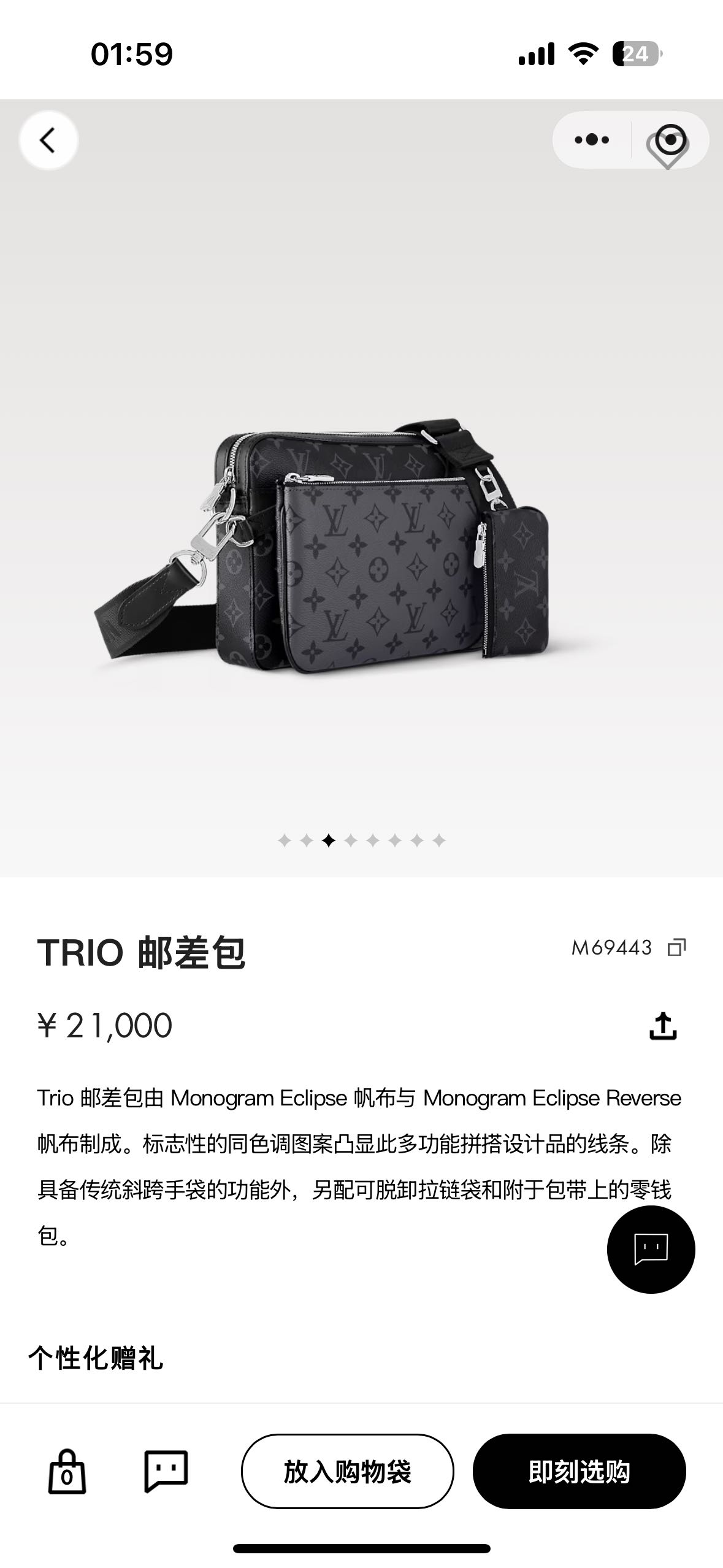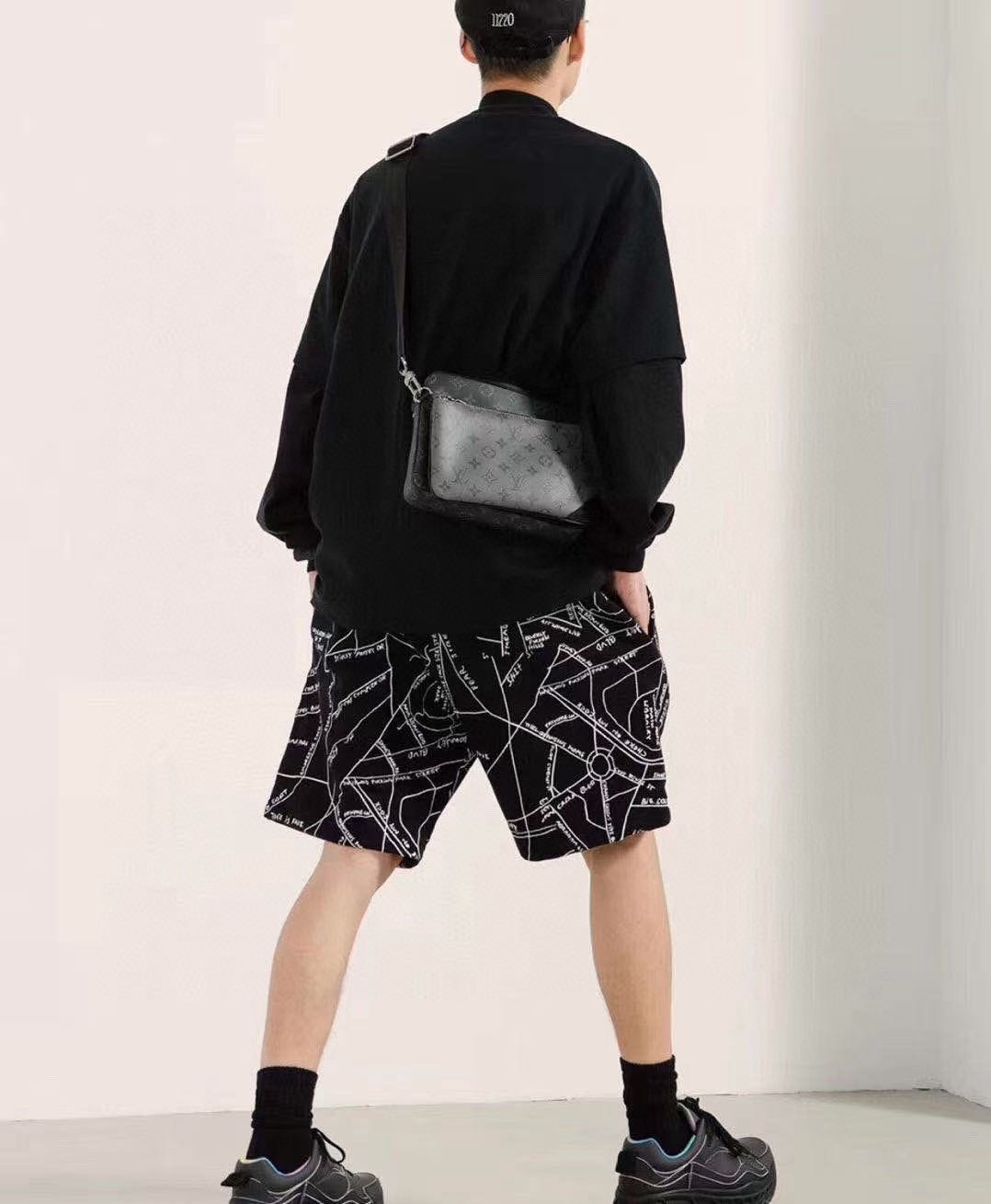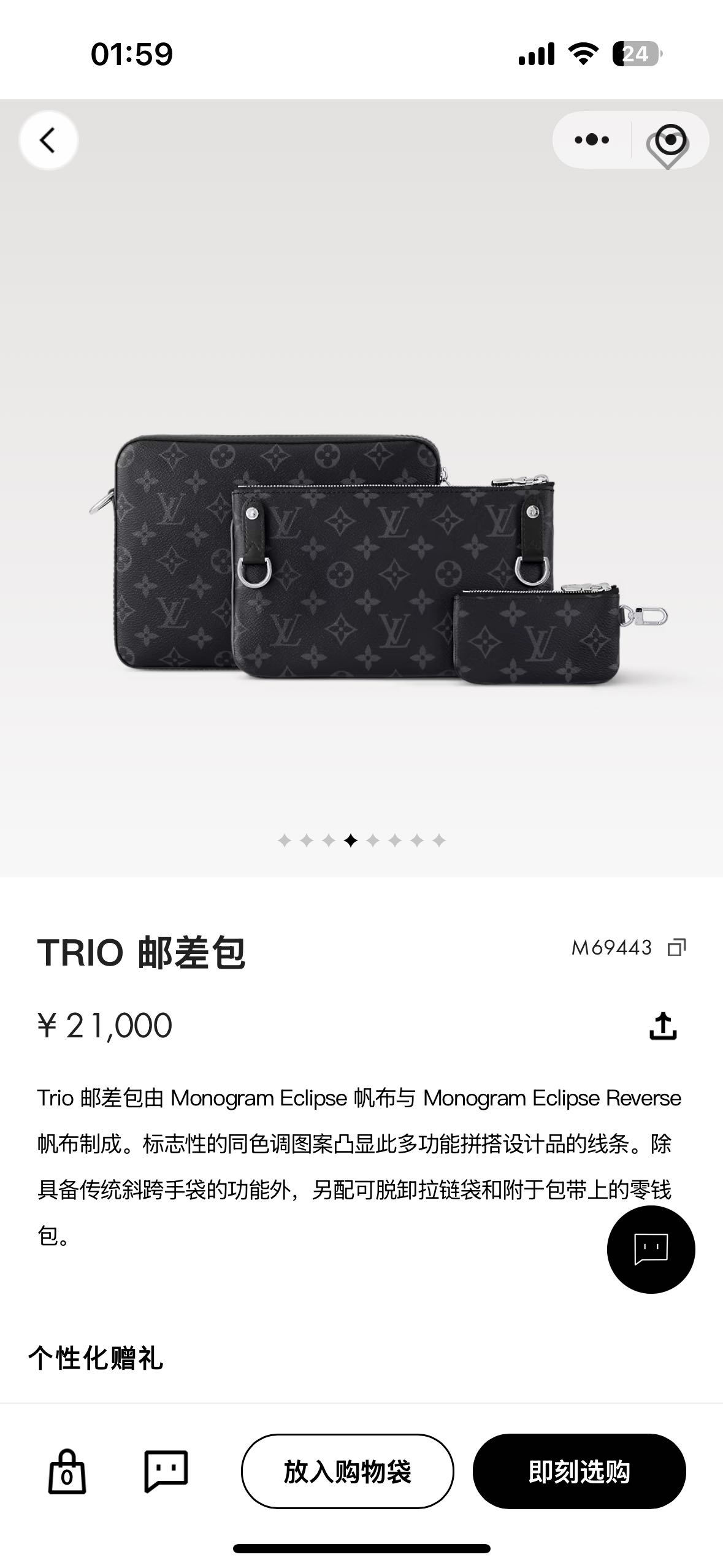 Trio 邮差包由 Monogram Eclipse帆布与 Monogram Eclipse Reverse帆布制成。标志性的同色调图案凸显此多功能拼搭设计品的线条。除具备传统斜跨手袋的功能外,另配可脱卸拉链袋和附于包带上的零钱包。