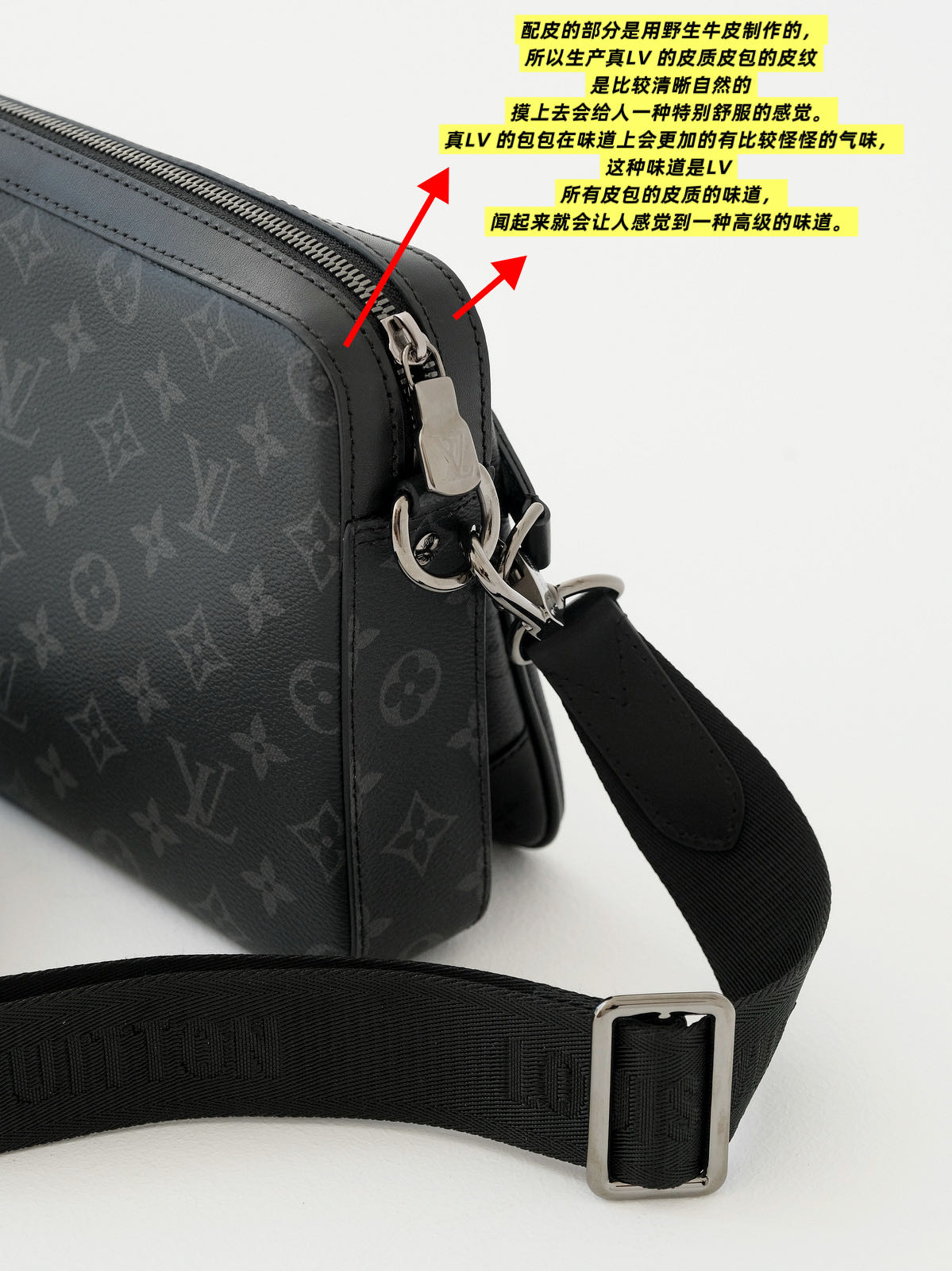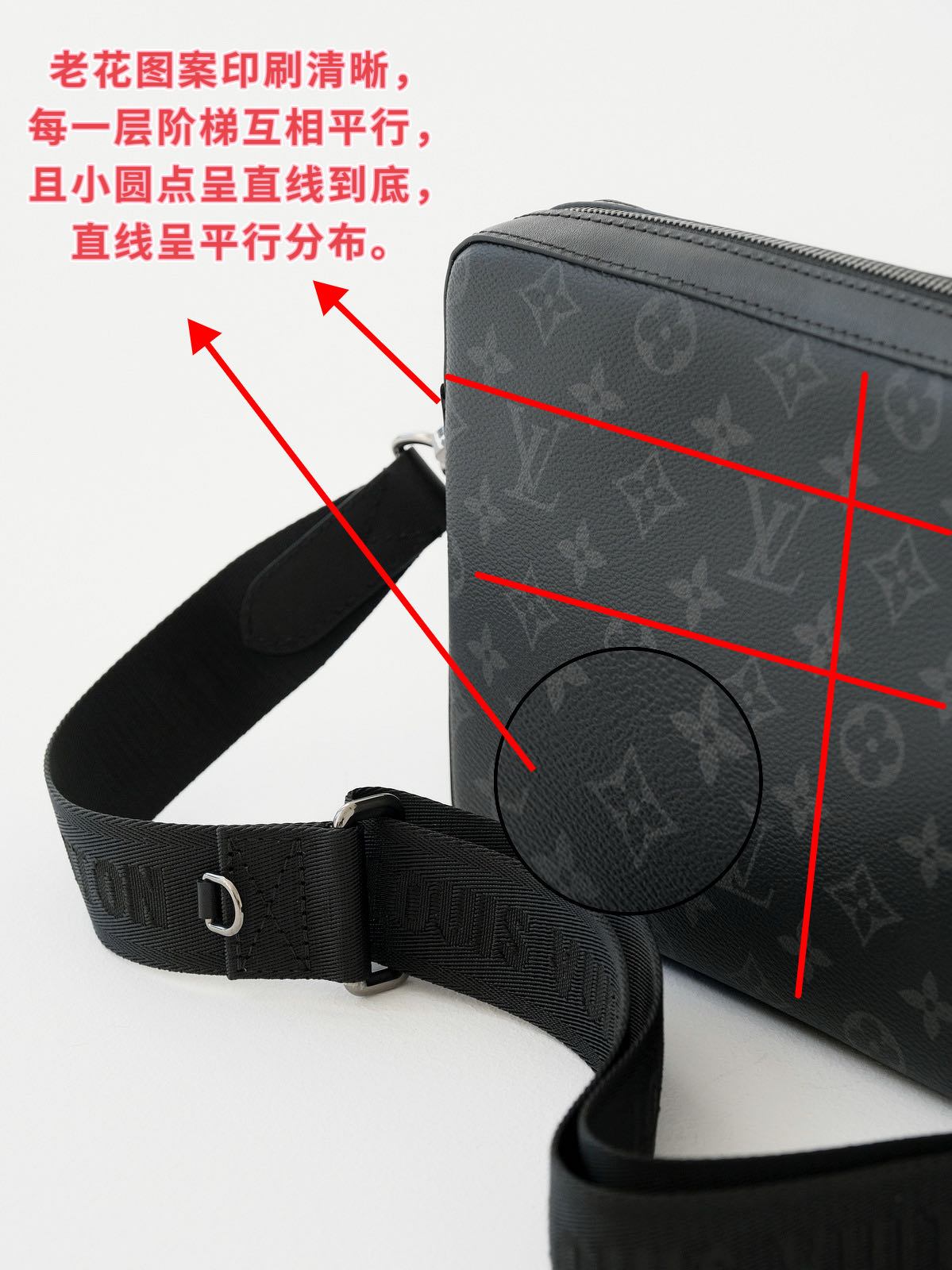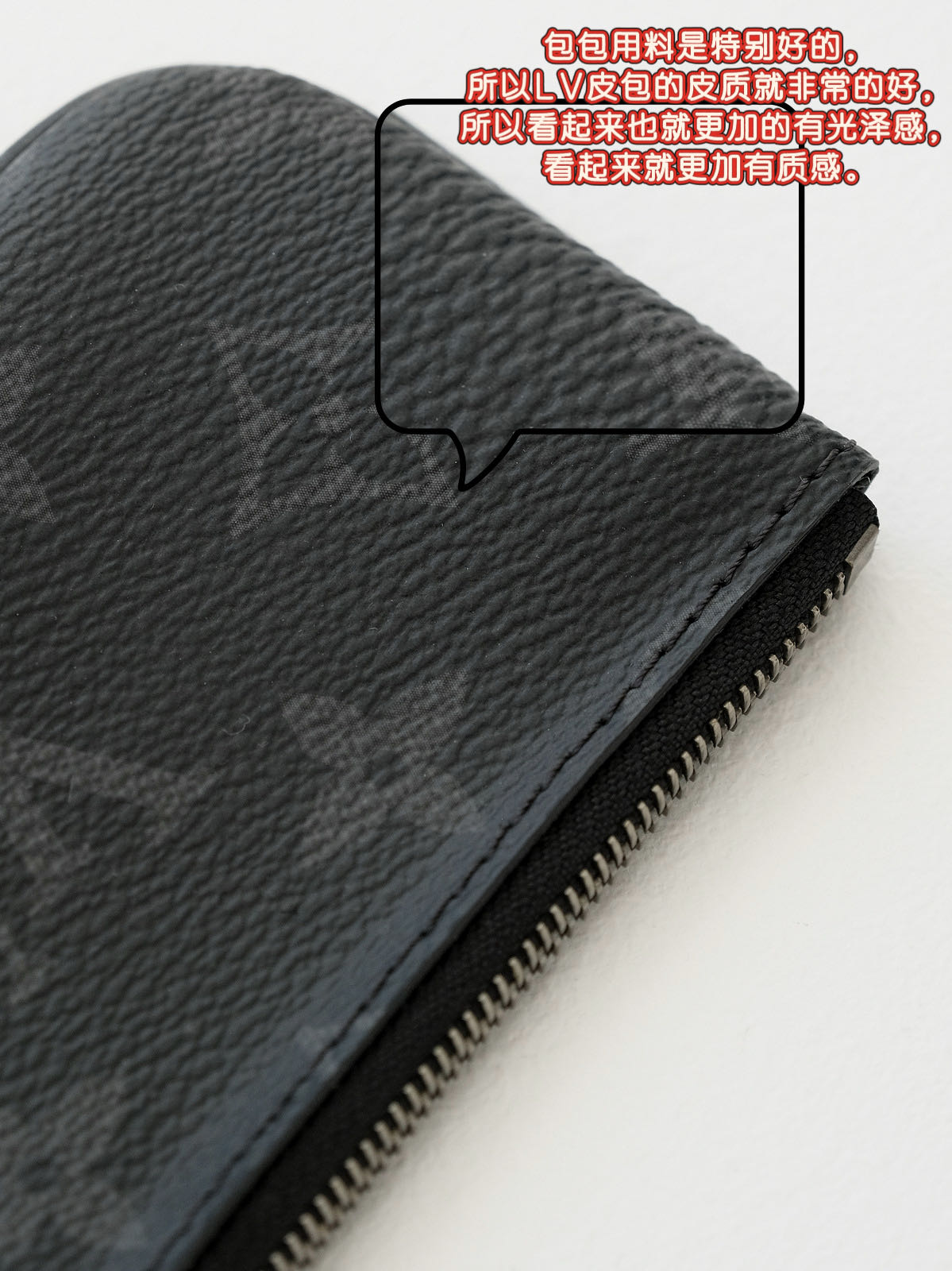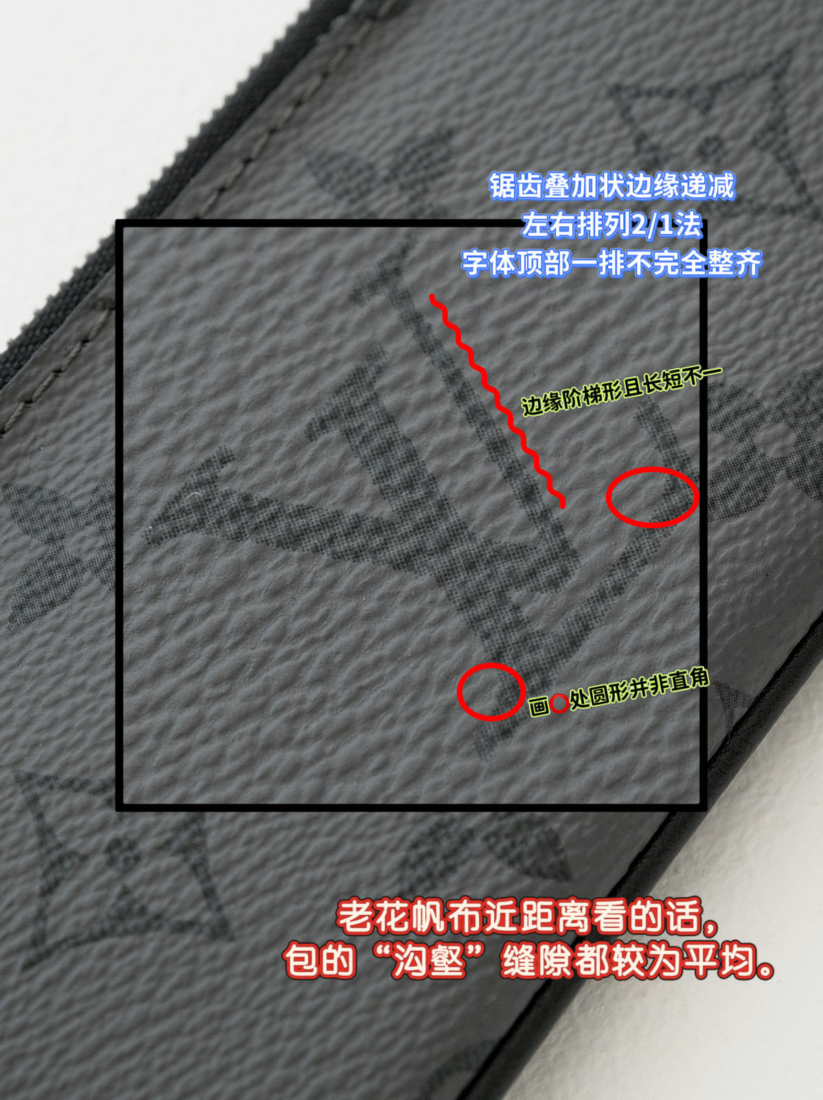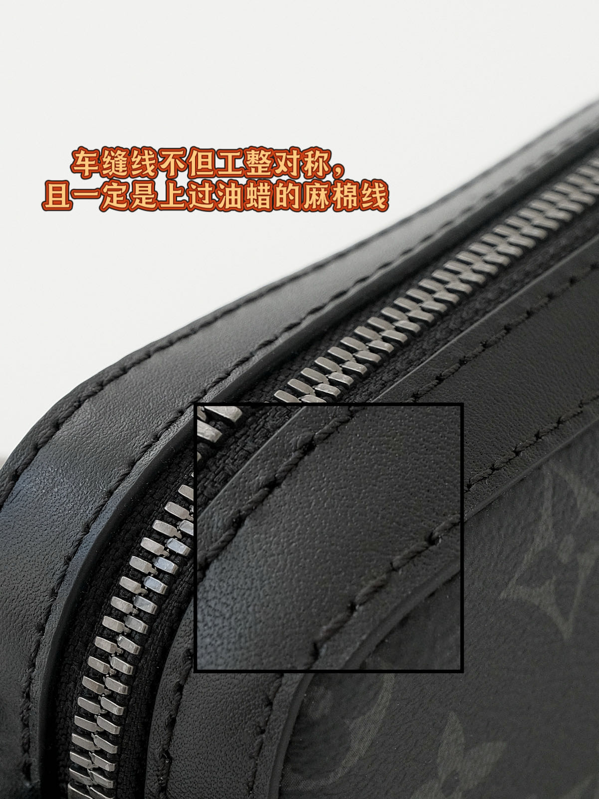 客供Monogram Eclipse 涂层帆布,黑灰同色系碰撞出来的给人最直观感觉,就是酷!比表面有着细腻自然的纹理,小水泡颗粒饱满、间隙分明!颗粒之间的沟的宽度都很平均!防水防刮十分耐用,会越用越有味道!
