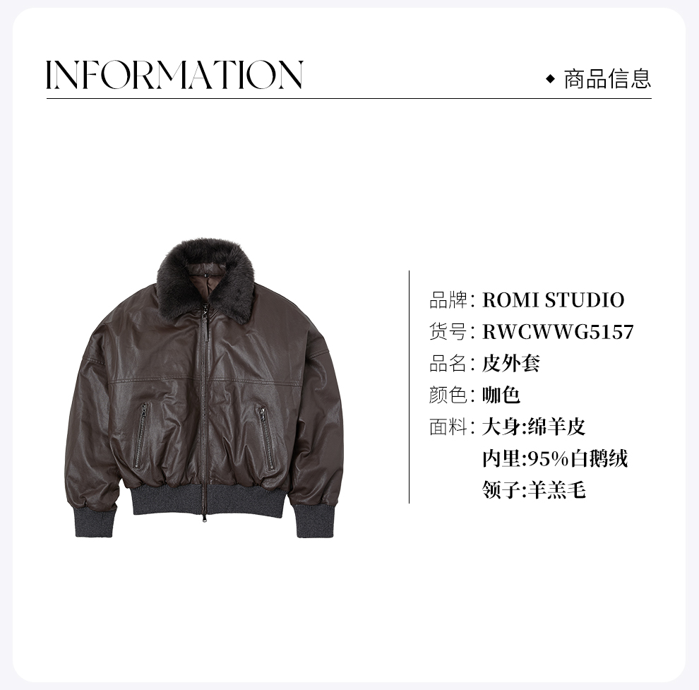ROMI STUDIO土耳其进口超薄全植鞣绵羊皮羽绒皮外套 RWCWWG5157【填充95白鹅绒】