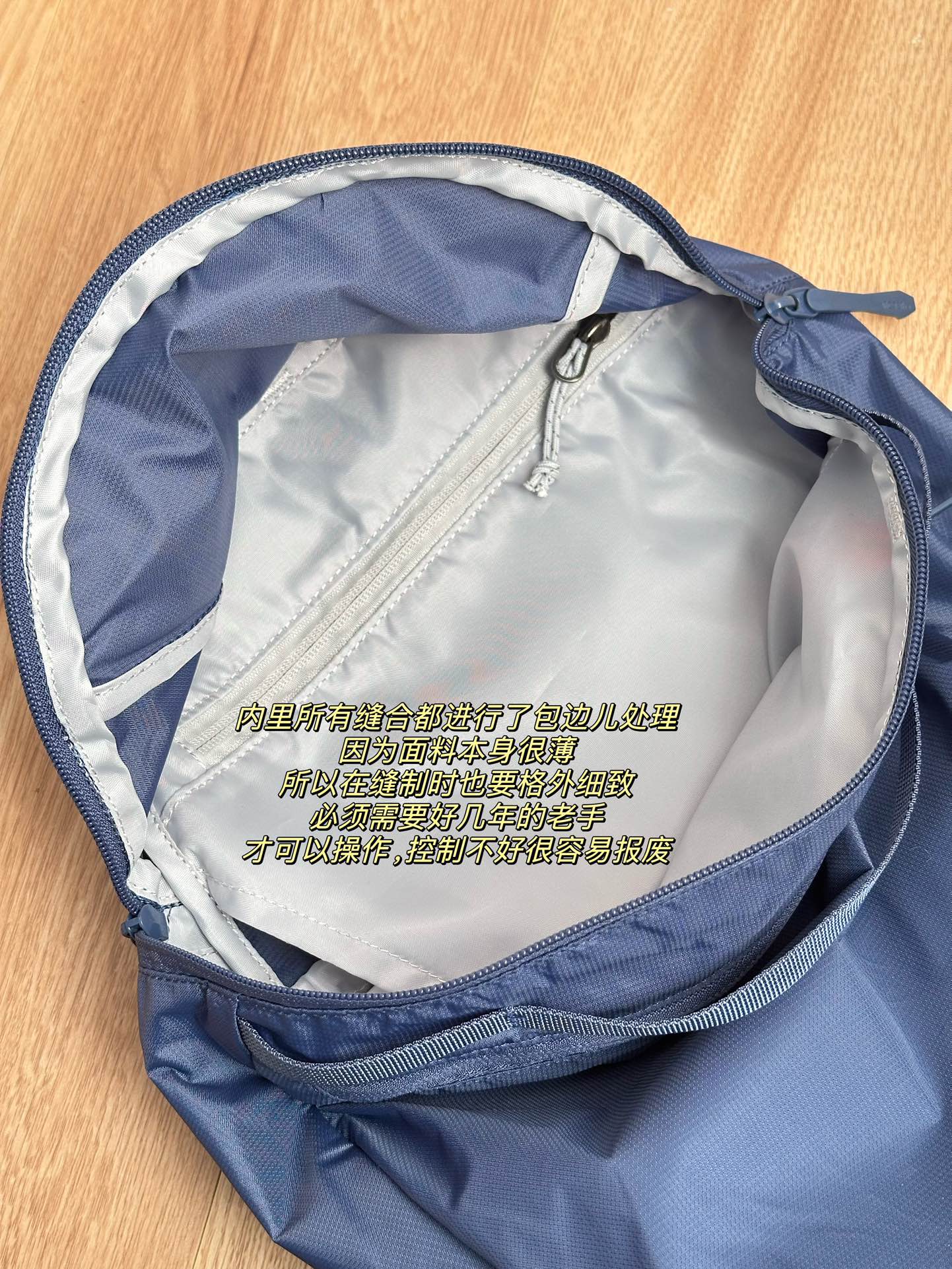 由于包本身面料薄的特点,在缝纫制作上需要格外细致 ,必须需要好几年的老手才可以操作,如果控制不好机器,包就会容易皱 不平整,整个操作周期相对较长